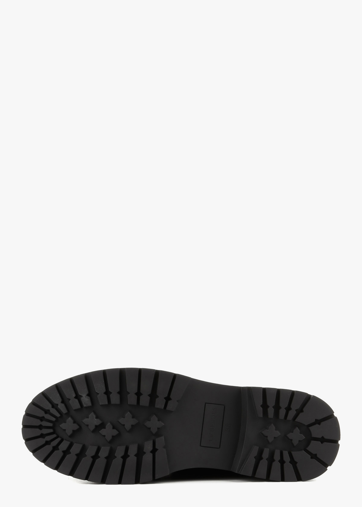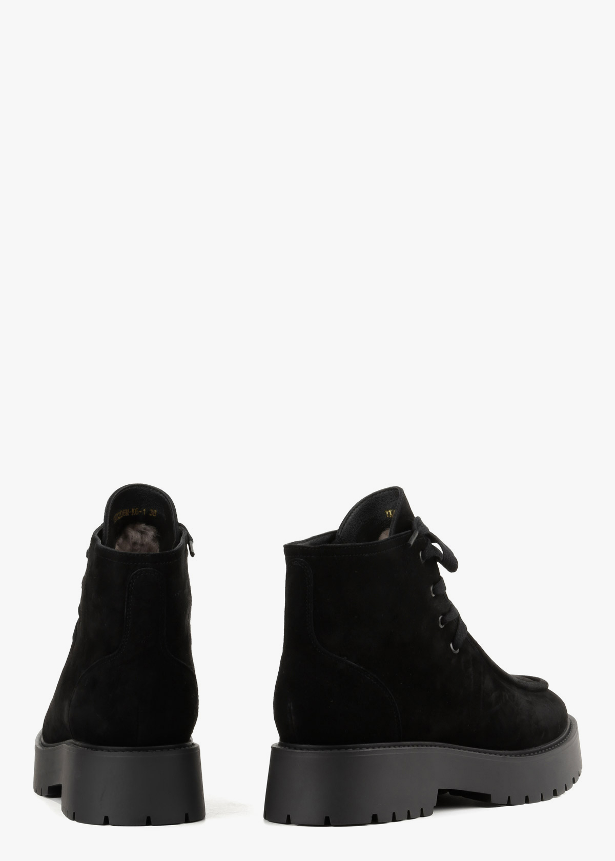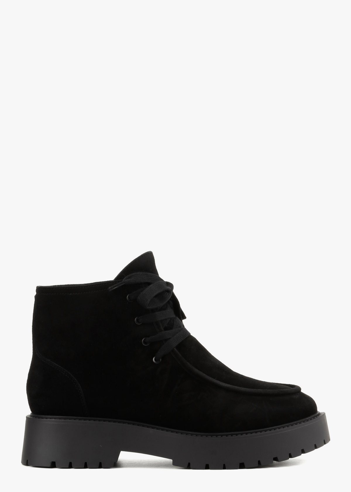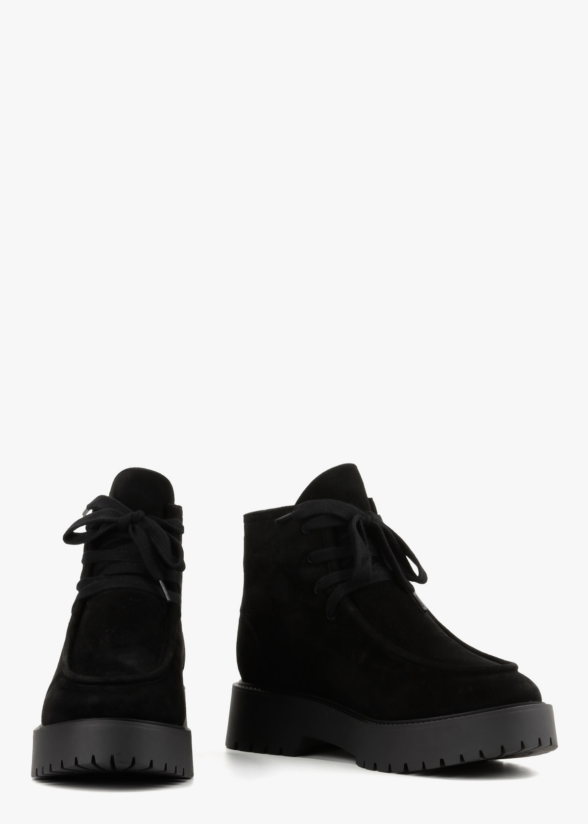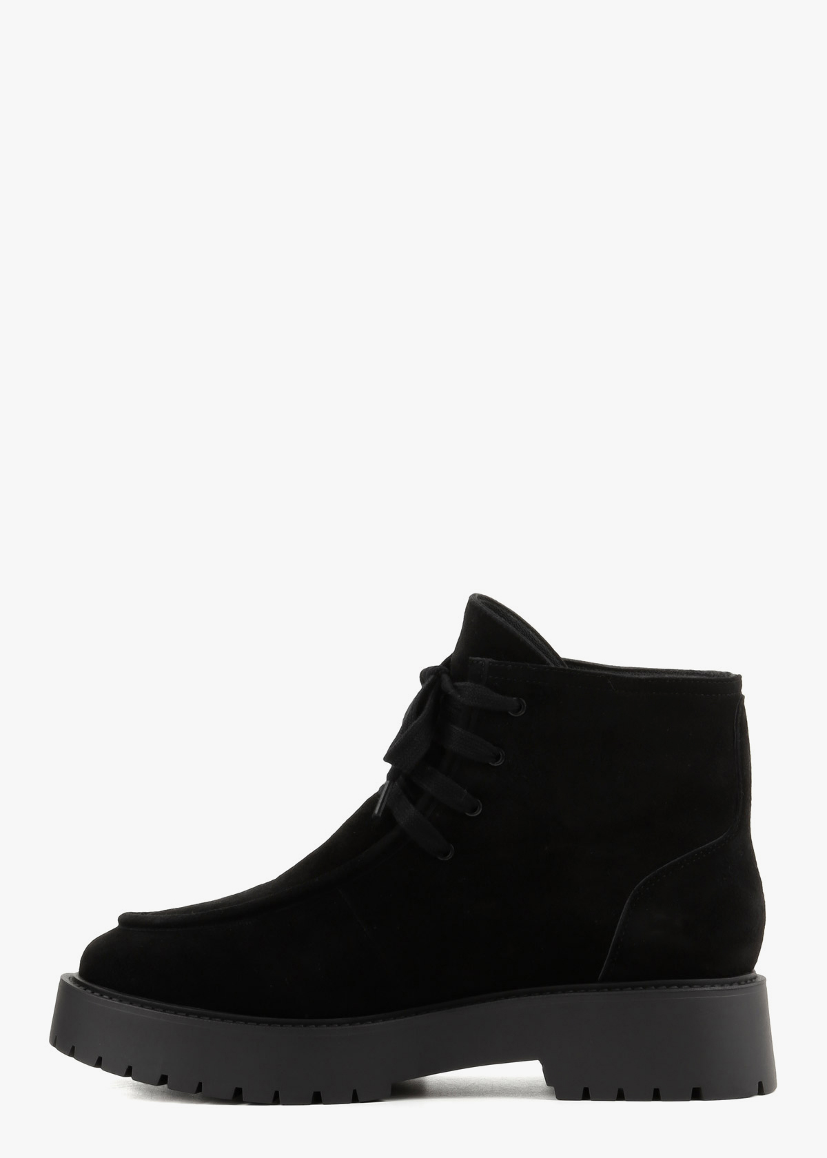М’яка чорна замша у цих черевиках створює лаконічний силует, який поєднує комфорт і сучасну естетику. Масивна підошва додає образу впевненості, а мінімалістичний дизайн робить пару універсальною для будь-якого гардероба. Це взуття для тих, хто цінує стриманий стиль і продуману простоту у кожній деталі.