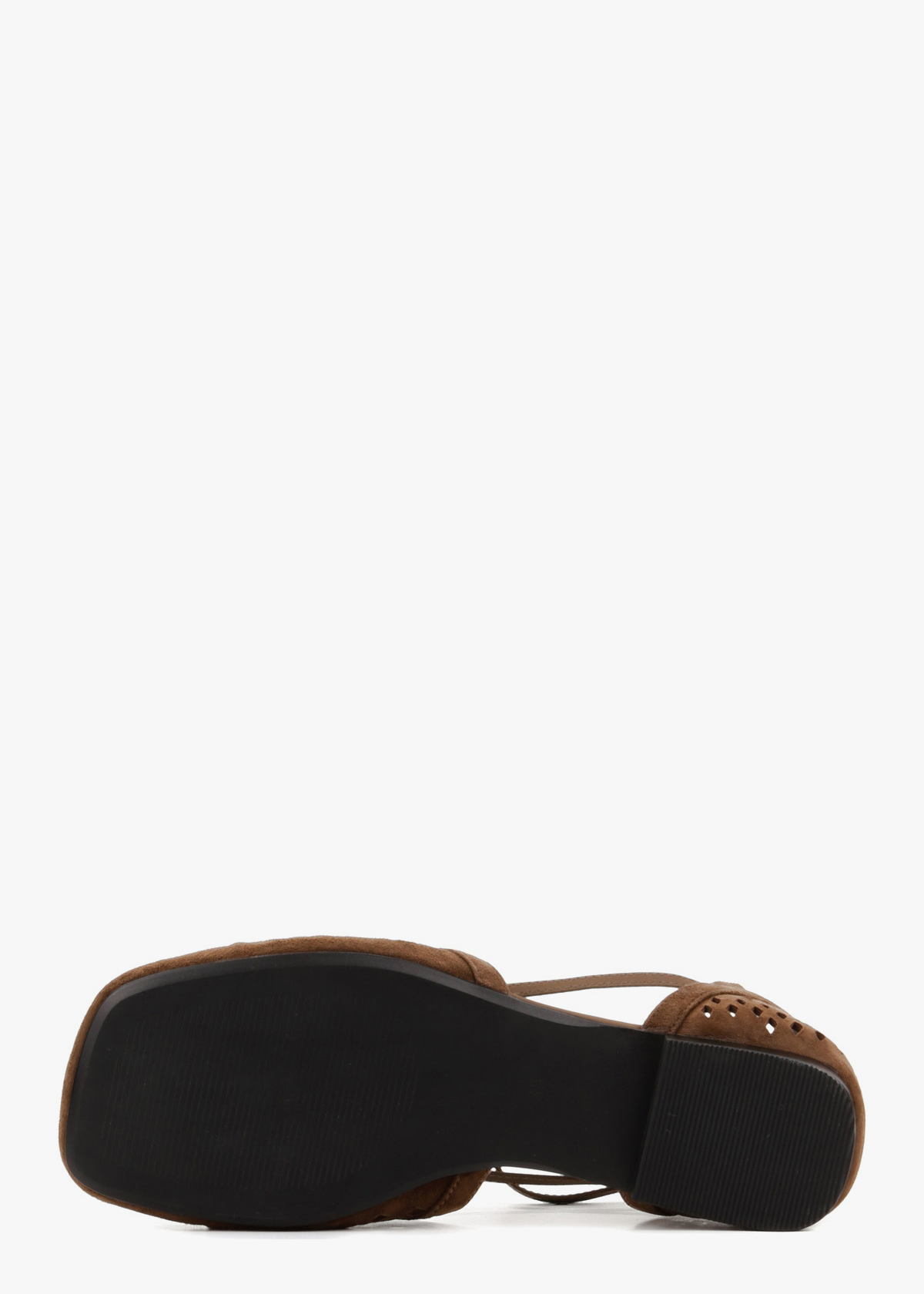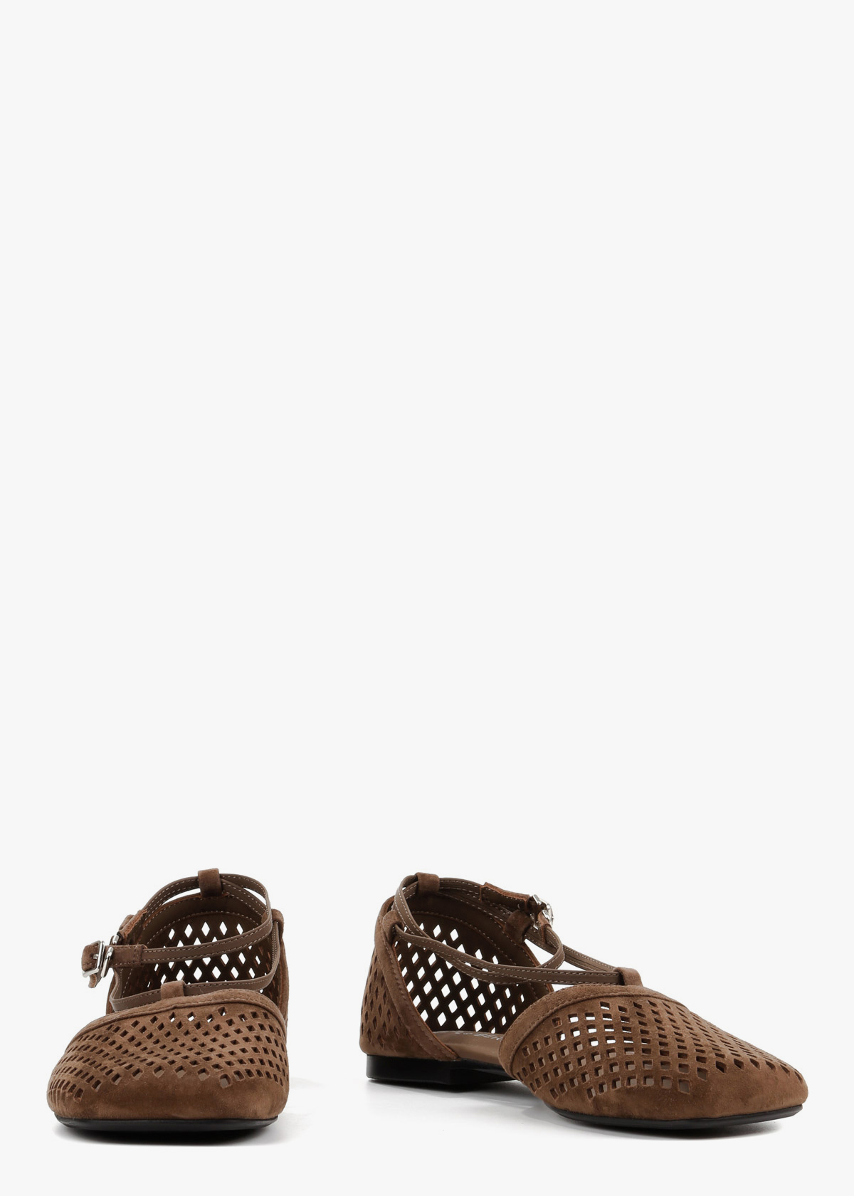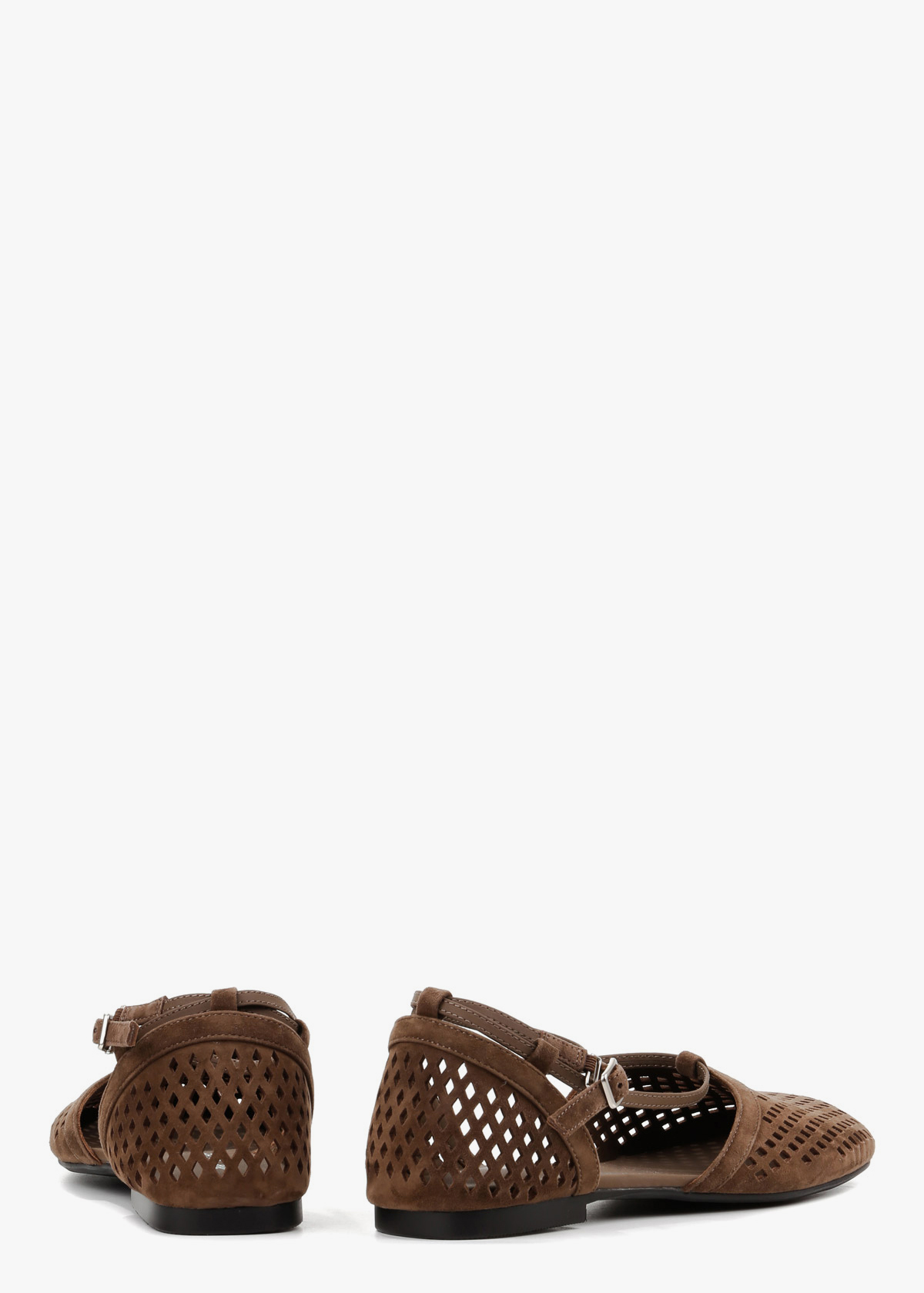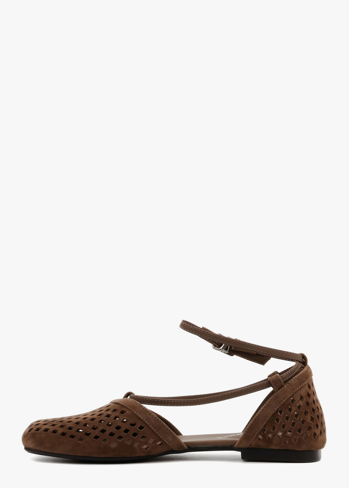 Жіночі балетки в елегантному шоколадному відтінку виготовлені з натуральної замші з виразною наскрізною перфорацією, що забезпечує ідеальну вентиляцію. Модель має відкриті бокові частини та витончений ремінець на щиколотці, який додає образу особливої витонченості та надійно фіксує стопу. Ця пара більшомірить на один розмір, тому ми рекомендуємо обирати на розмір менші, а її плоска підошва гарантує неперевершений комфорт протягом усього дня.