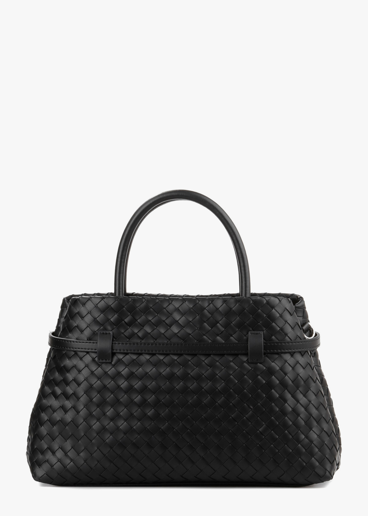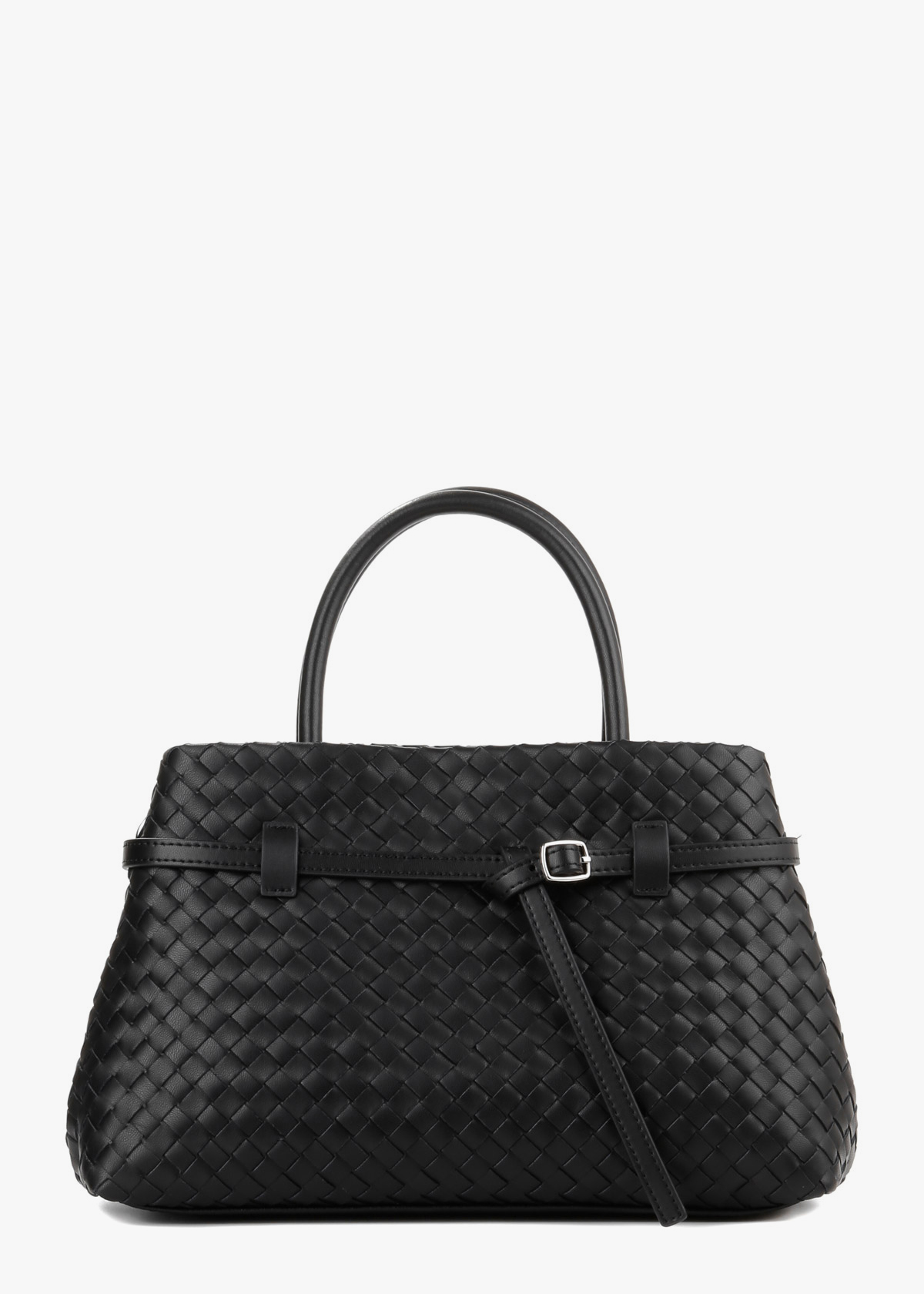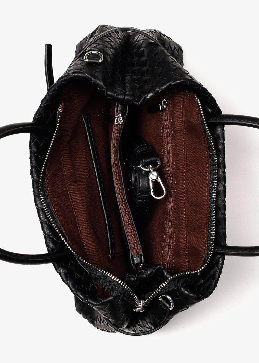 Чорна плетена сумка з натуральної шкіри зі стриманою срібною фурнітурою вирізняється виразною фактурою та продуманим силуетом, а два основні відділення й три кишені всередині забезпечують зручну організацію речей; текстильна підкладка додає практичності для щоденного використання.