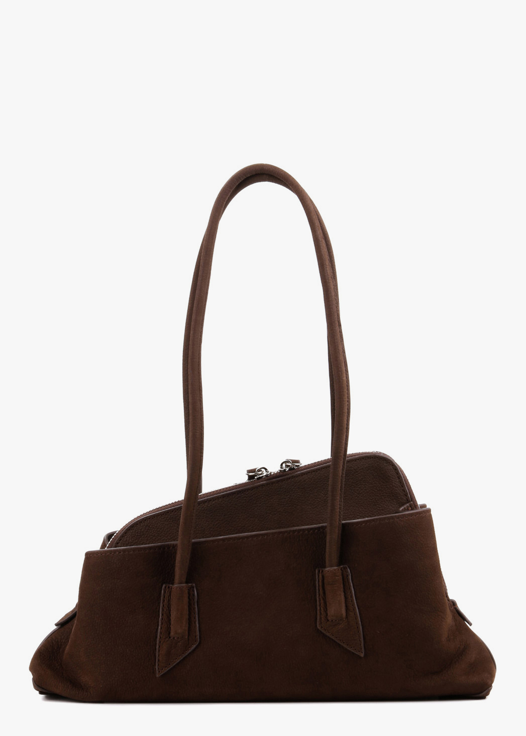 Чорна сумка з матової шкіри зі срібною фурнітурою вирізняється витонченим подовженим силуетом і зручними ручками, що підкреслюють її елегантний характер. Усередині — одне основне відділення з однією кишенею, а також дві зовнішні кишені для швидкого доступу до необхідних речей. Підкладка виконана з текстилю, що забезпечує практичність у щоденному використанні.