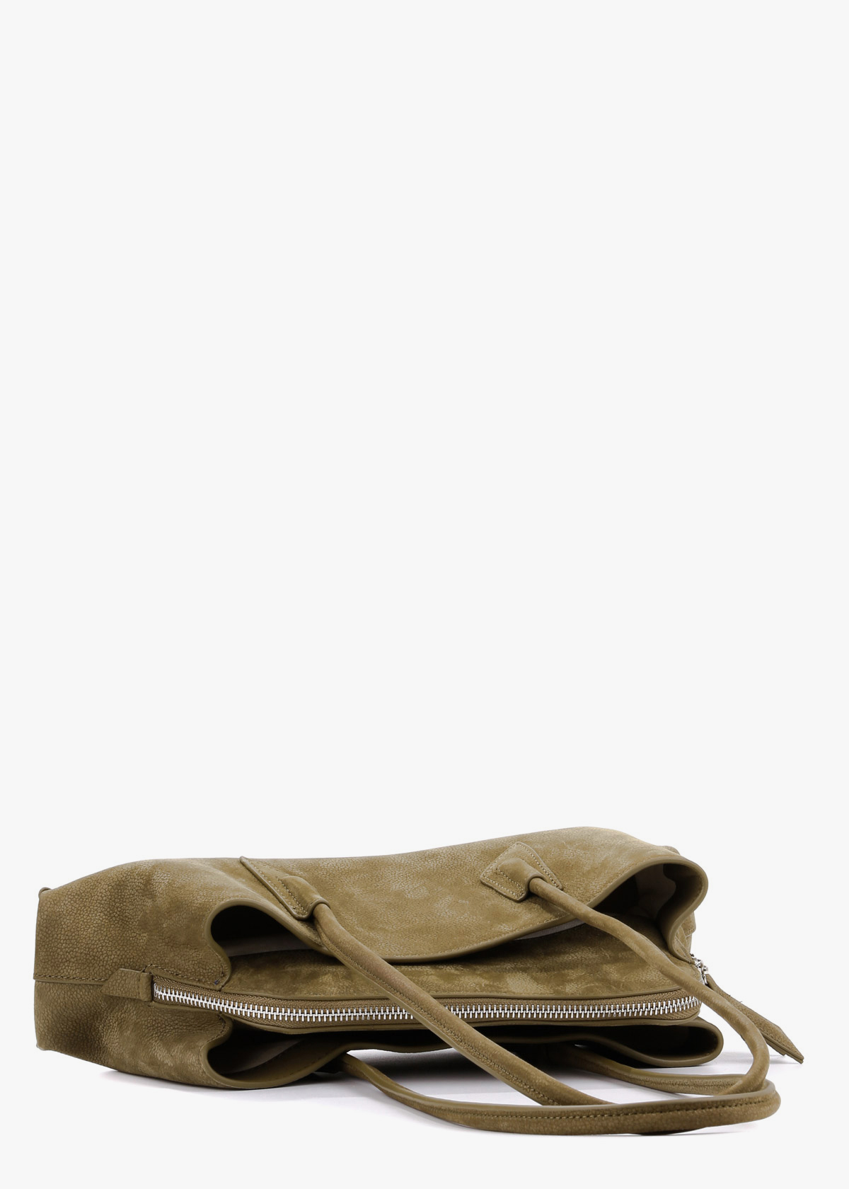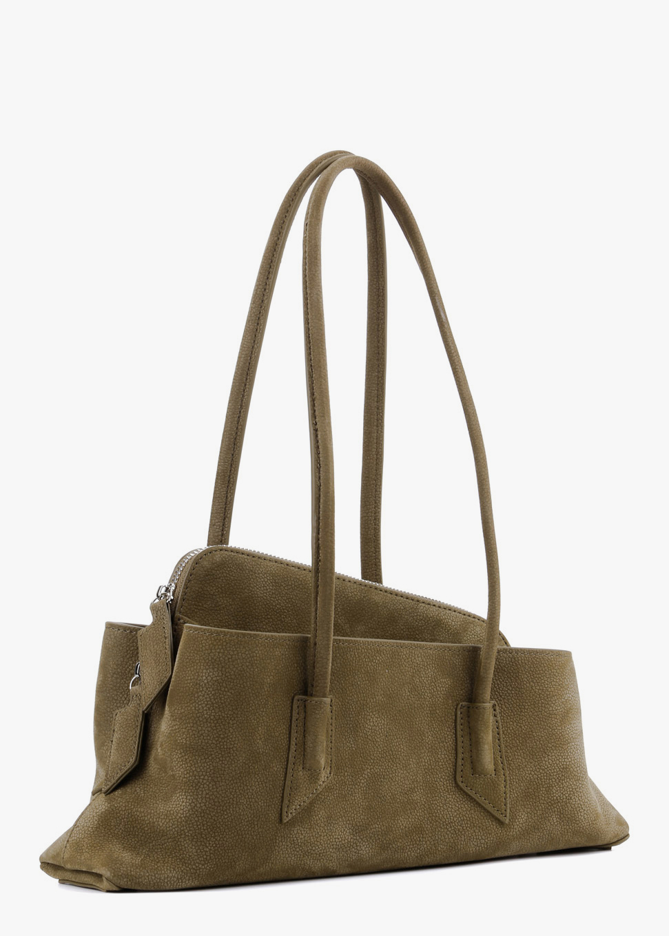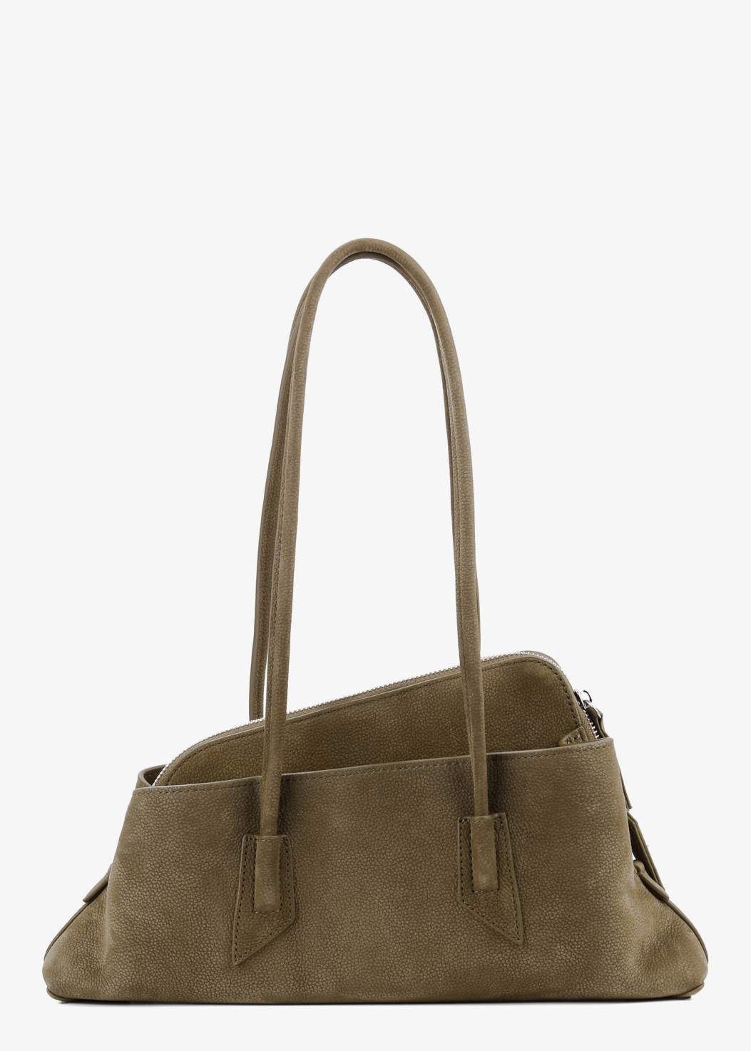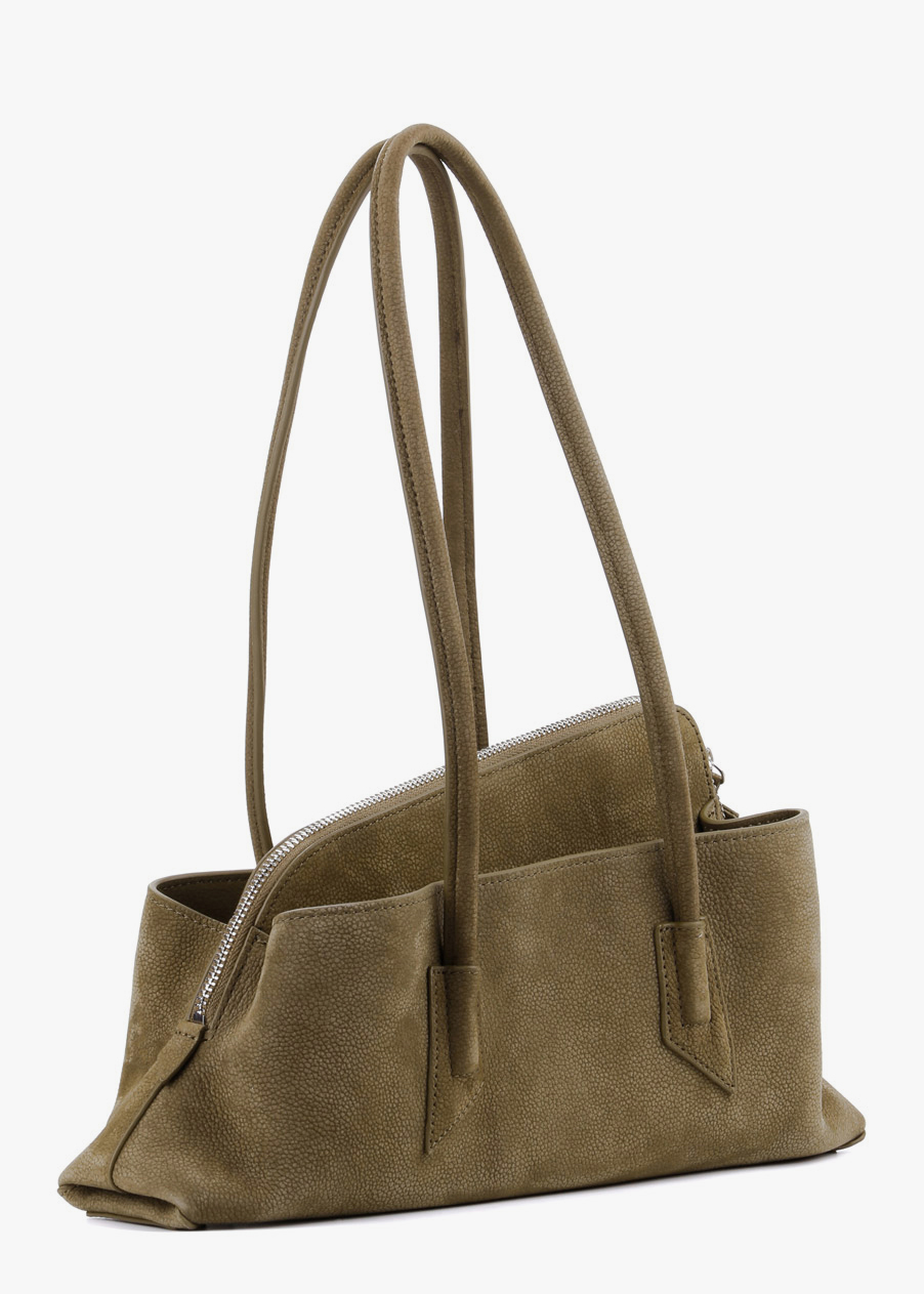 Оливкова сумка з матової шкіри зі срібною фурнітурою вирізняється витонченим подовженим силуетом і зручними ручками, що підкреслюють її елегантний характер. Усередині — одне основне відділення з однією кишенею, а також дві зовнішні кишені для швидкого доступу до необхідних речей. Підкладка виконана з текстилю, що забезпечує практичність у щоденному використанні.
