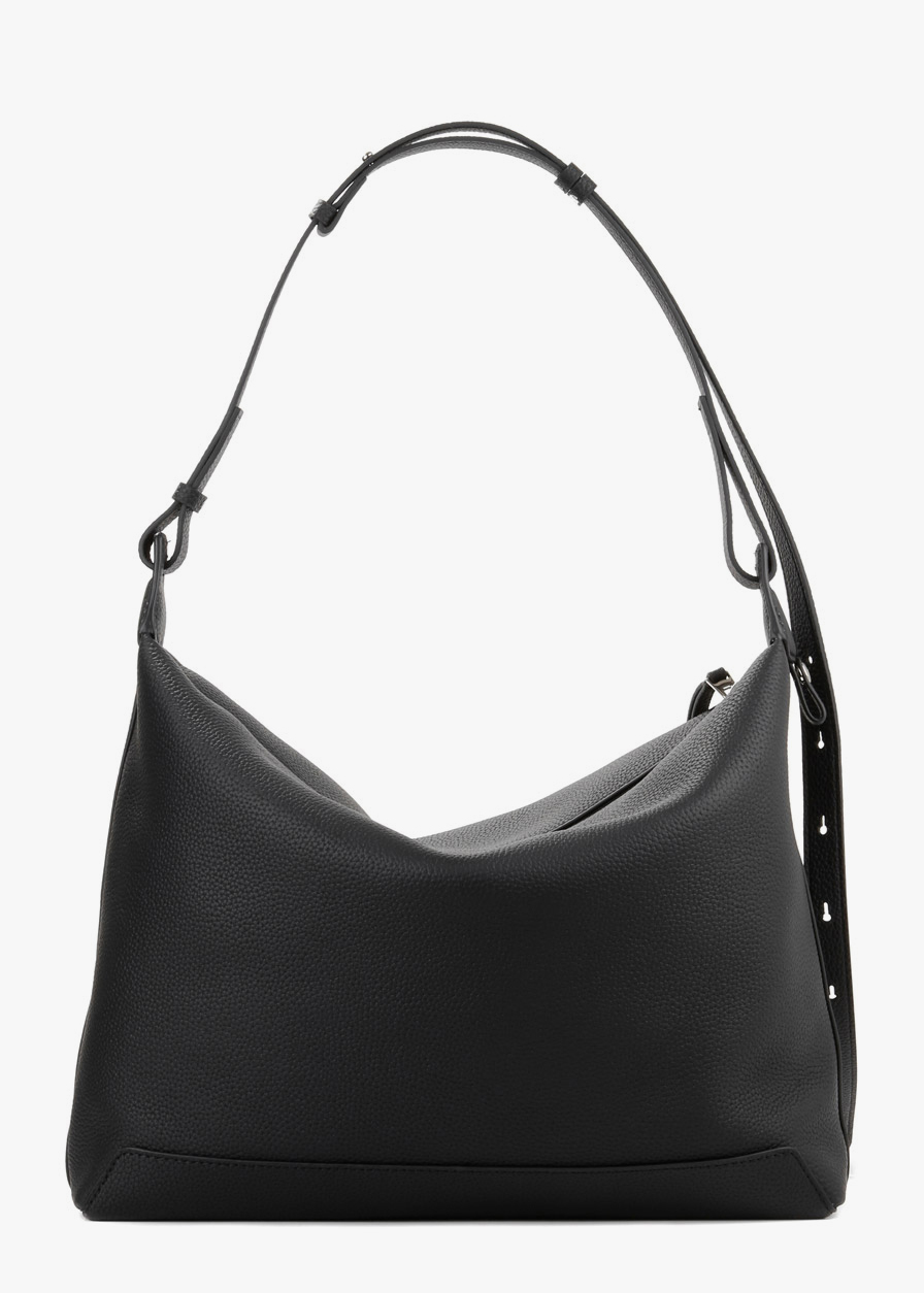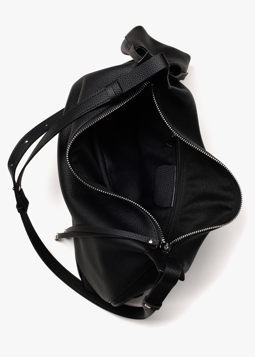 Чорний шопер із матової шкіри зі срібною фурнітурою вирізняється універсальним форматом для щоденного використання. Усередині — одне основне відділення та три кишені для зручної організації речей, підкладка виконана з текстилю. У комплекті передбачена міні-сумочка, що кріпиться збоку як стильний і функціональний аксесуар.