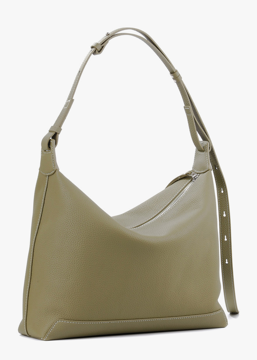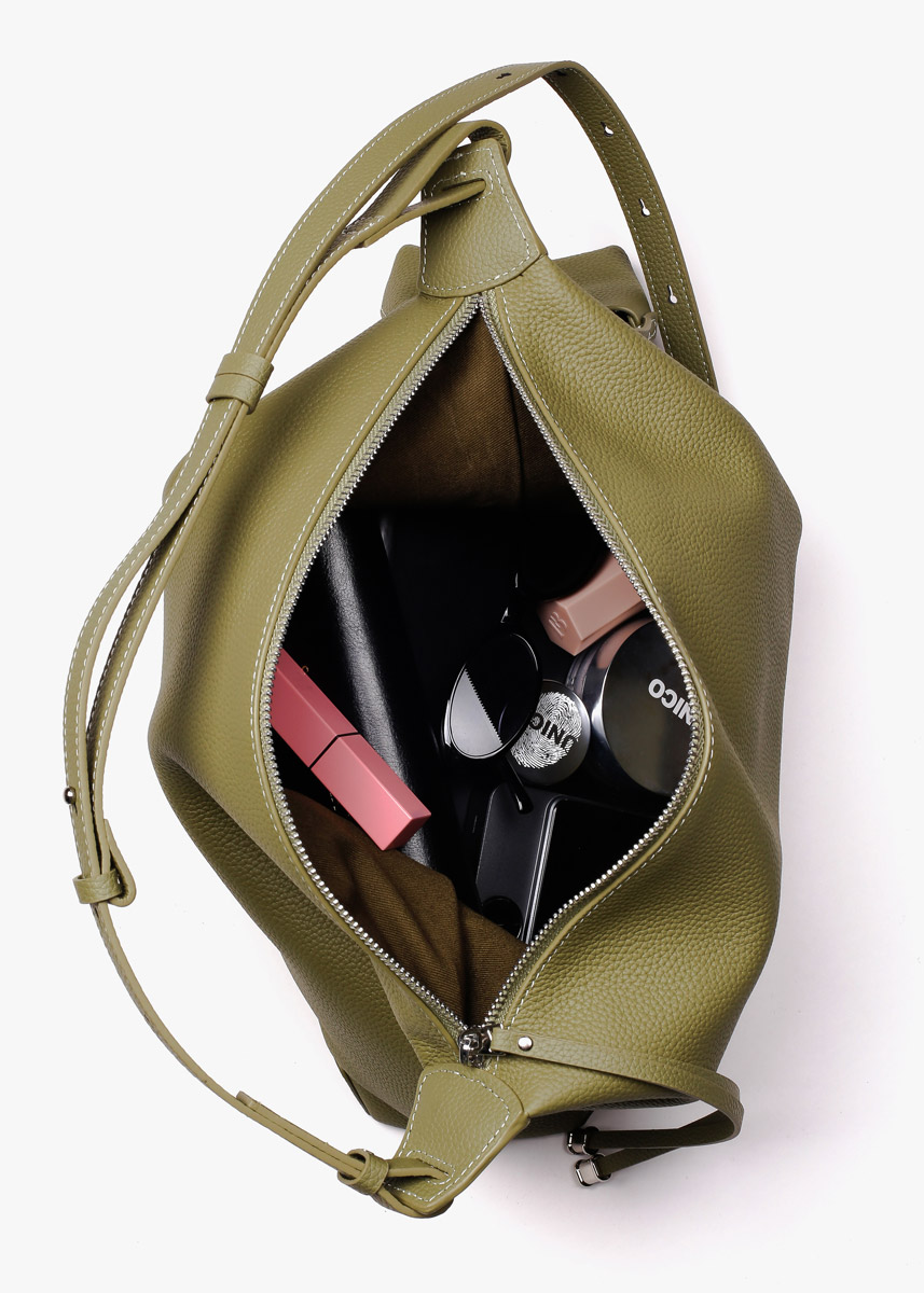 Оливковий шопер із матової шкіри зі срібною фурнітурою вирізняється спокійним відтінком і універсальним форматом для щоденного використання. Усередині — одне основне відділення та три кишені для зручної організації речей, підкладка виконана з текстилю. У комплекті передбачена міні-сумочка, що кріпиться збоку як стильний і функціональний аксесуар.