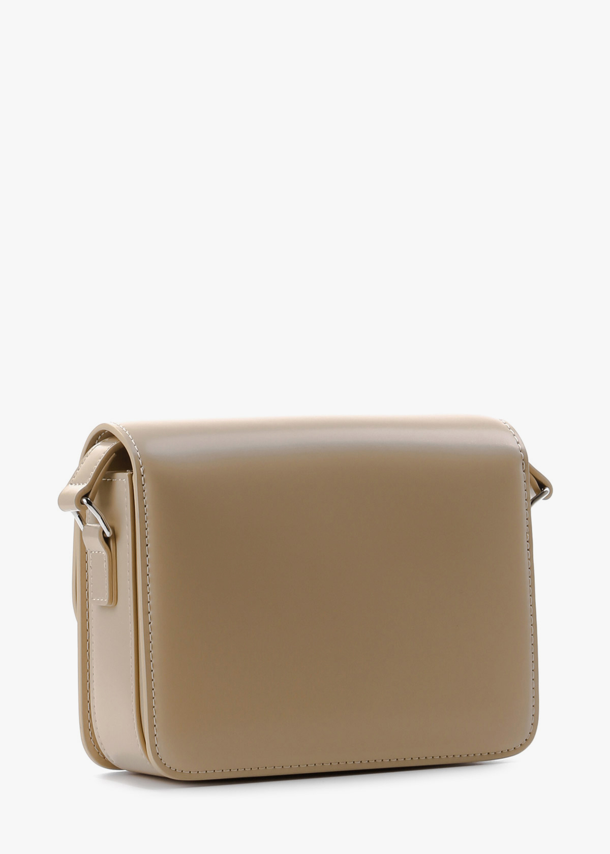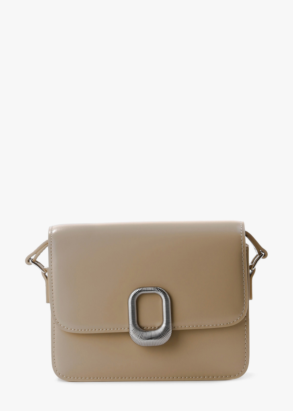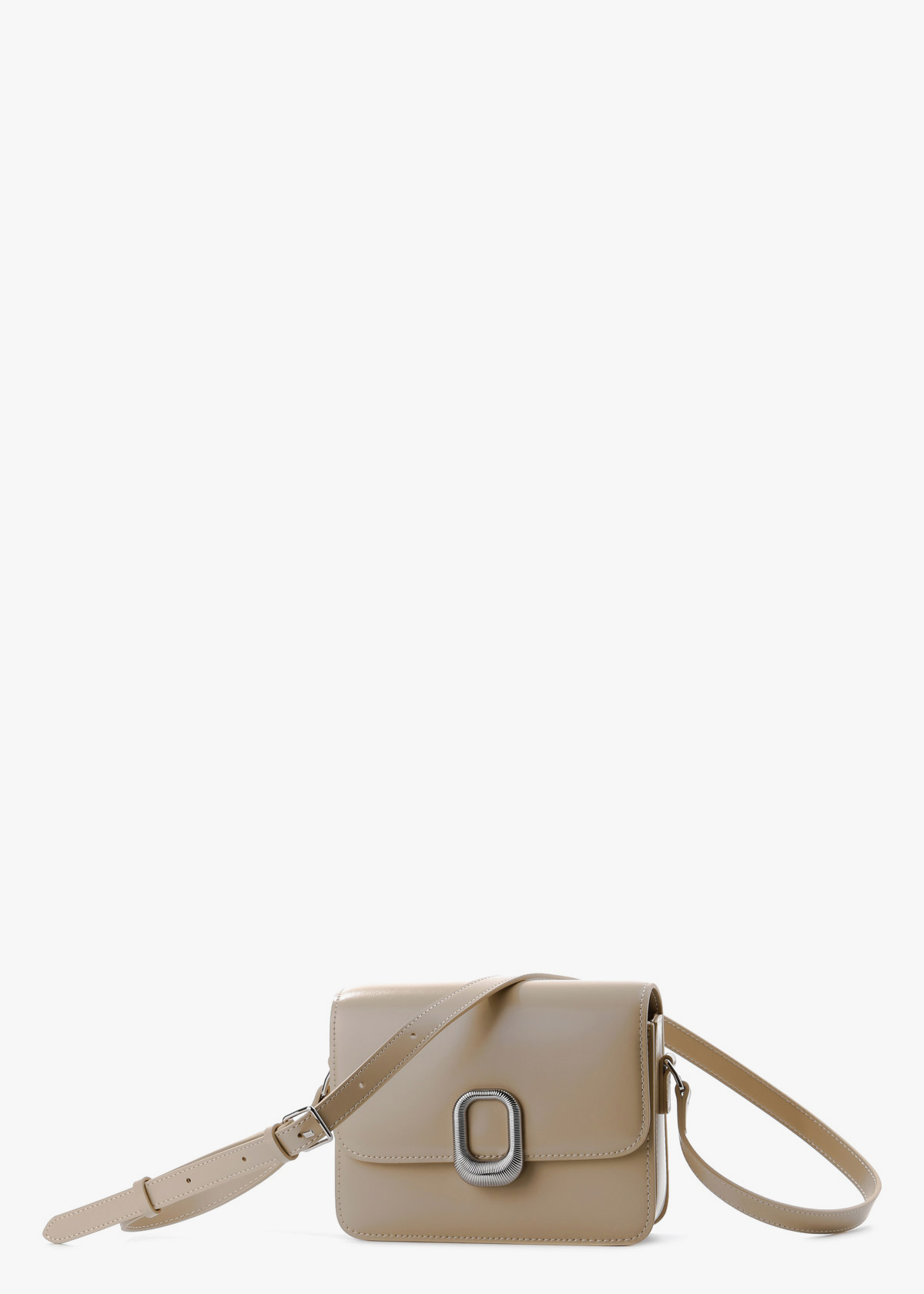 Бежева каркасна сумка з глянцевої шкіри з виразною срібною фурнітурою привертає увагу чітким силуетом і акцентною застібкою. Усередині — одне основне відділення та дві кишені для зручної організації речей, підкладка виконана зі шкіри. Структурована форма зберігає акуратний вигляд і додає образу зібраності та характеру.