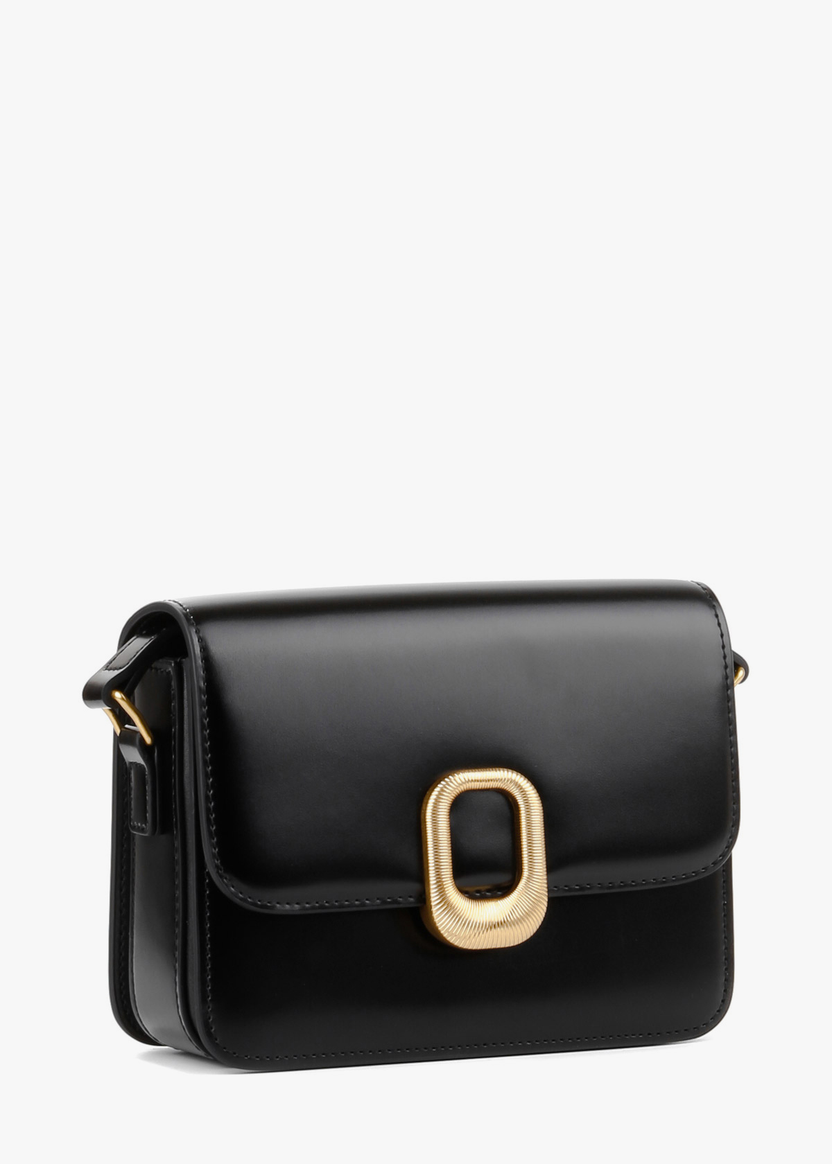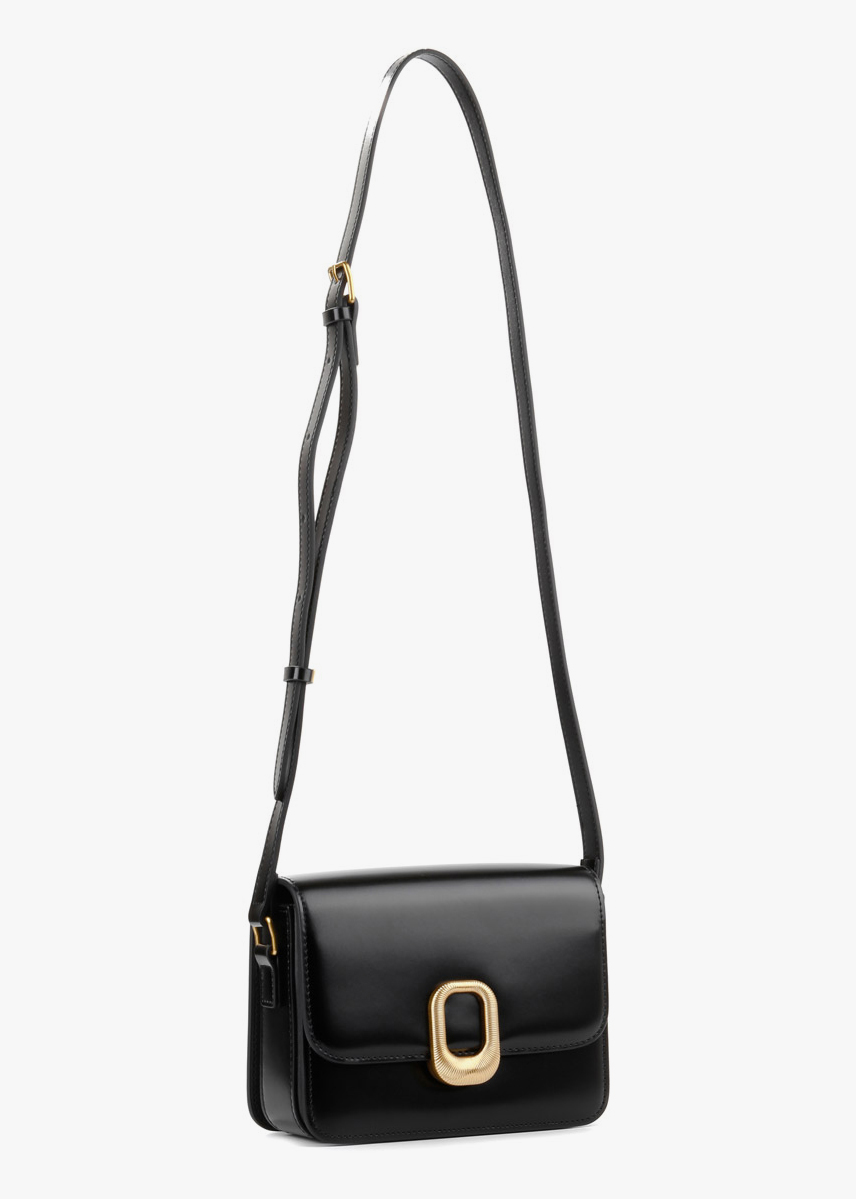 Чорна каркасна сумка з глянцевої шкіри з виразною вінтажною золотою фурнітурою привертає увагу чітким силуетом і акцентною застібкою. Усередині — одне основне відділення та дві кишені для зручної організації речей, підкладка виконана зі шкіри. Структурована форма зберігає акуратний вигляд і додає образу зібраності та характеру.