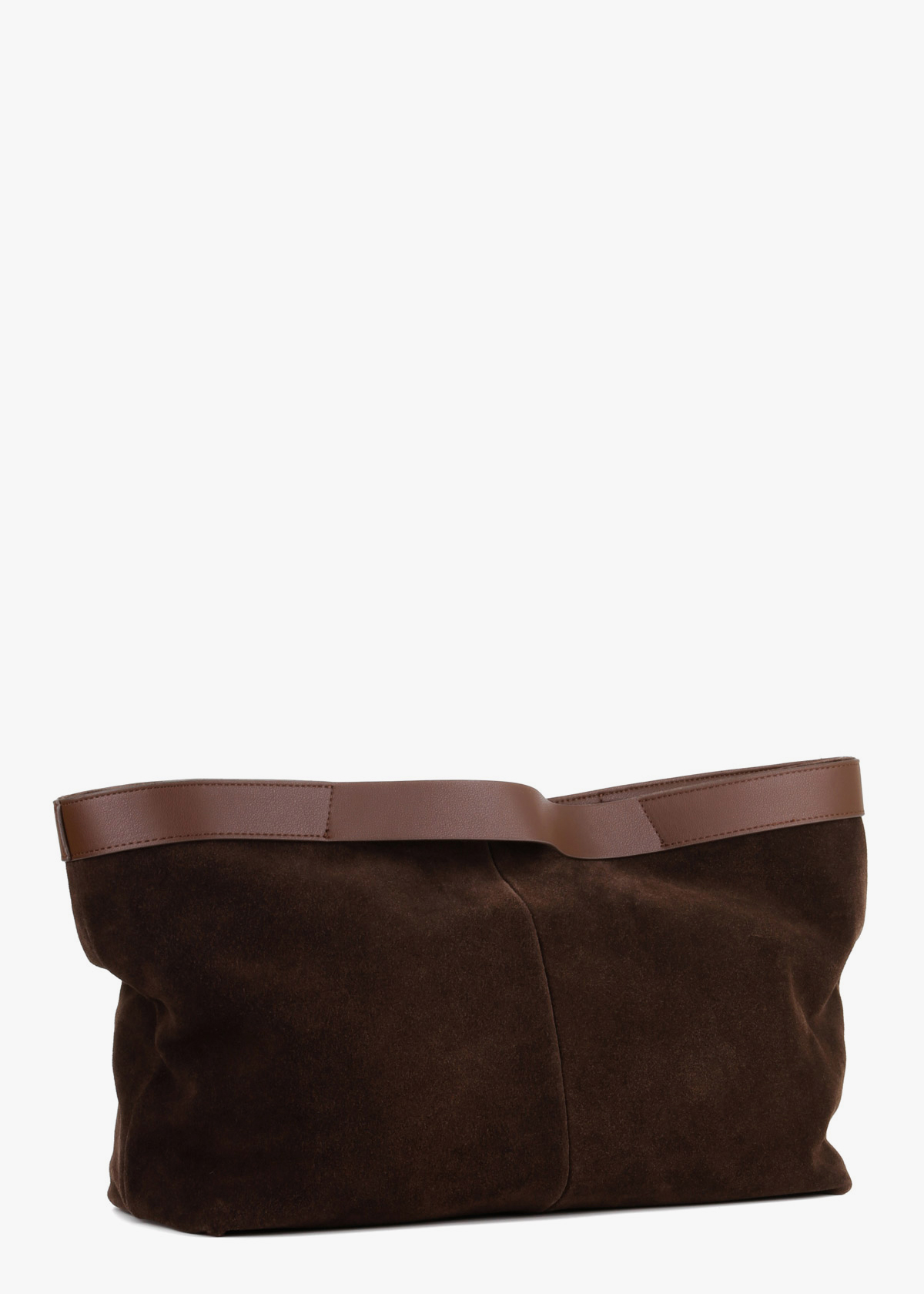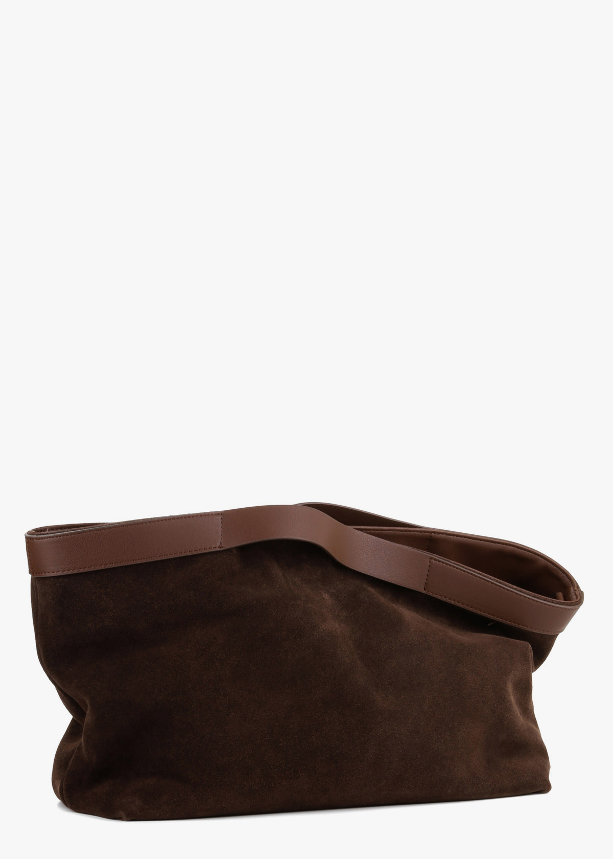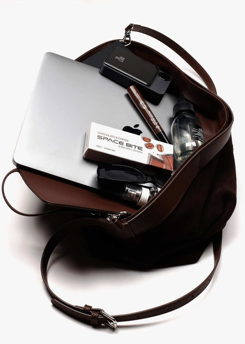 Коричнева замшева сумка з м’якою, приємною на дотик фактурою має лаконічний подовжений силует і зручний формат для щоденного користування; всередині — одне основне відділення, що закривається на магніт, а в комплекті передбачений маленький відщіпний гаманець для найнеобхідніших дрібниць.