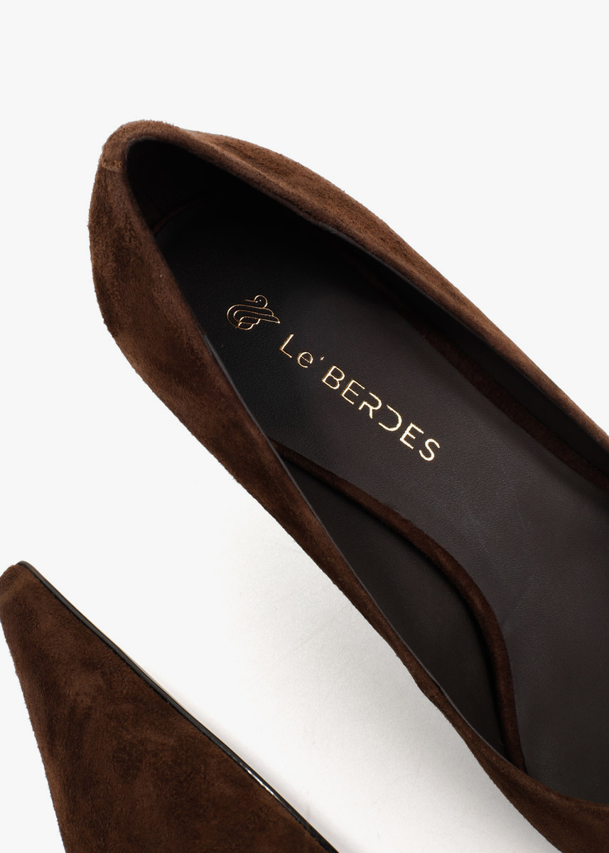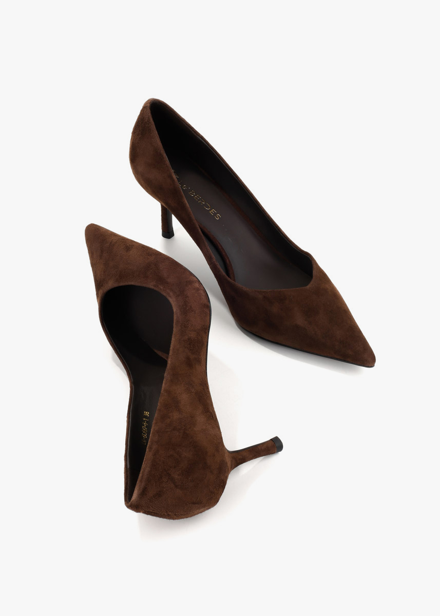 Жіночі туфлі темно-коричневого кольору з натуральної замші — класична модель із загостреним носком та акуратною лінією вирізу. М’яка замша має рівну приємну текстуру й виглядає стримано. Тонкий каблук середньої висоти додає легкості силуету та зберігає зручність під час ходьби. На нозі туфлі відчуваються комфортними, добре фіксують стопу та підходять як для щоденного носіння, так і для подій.