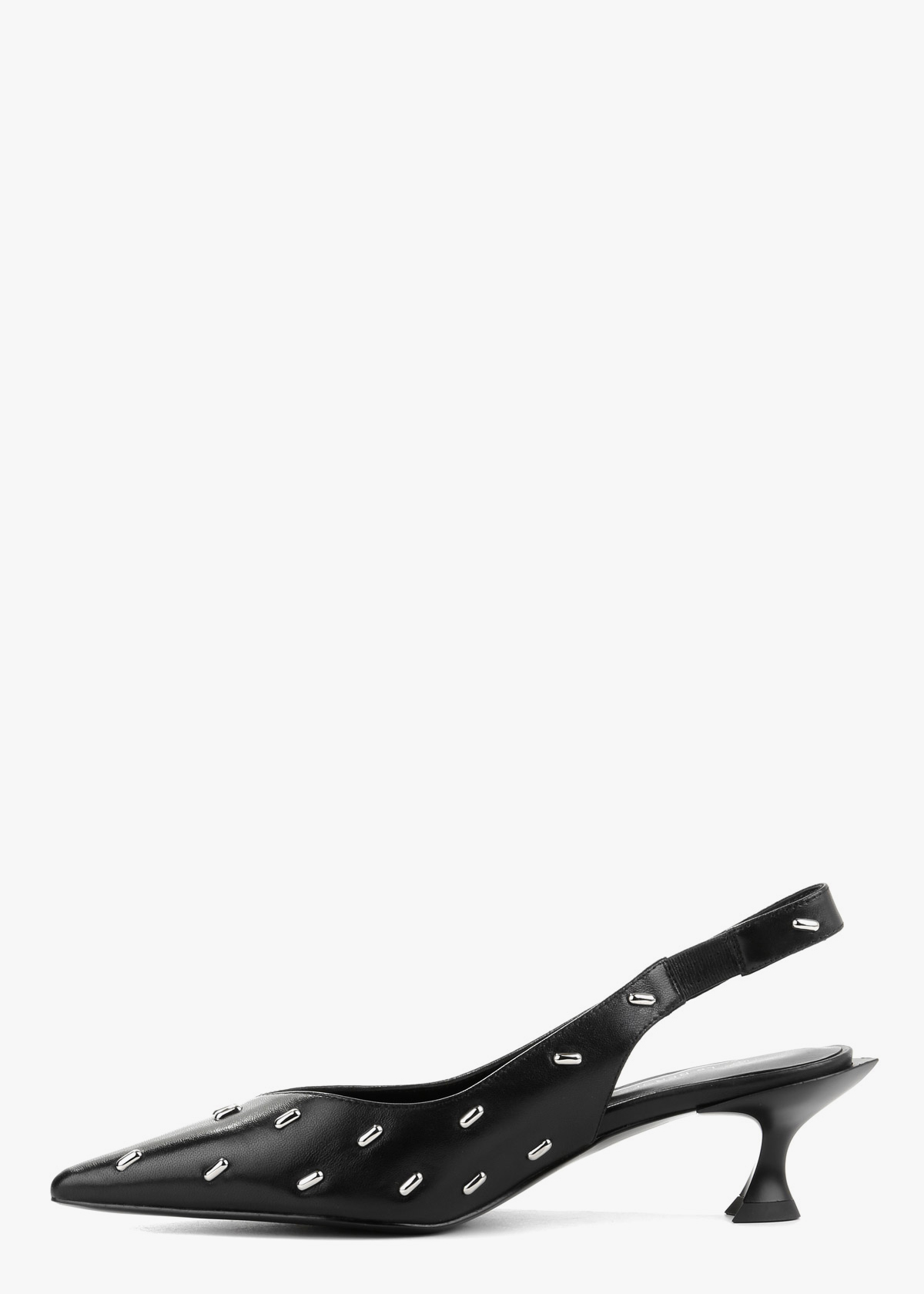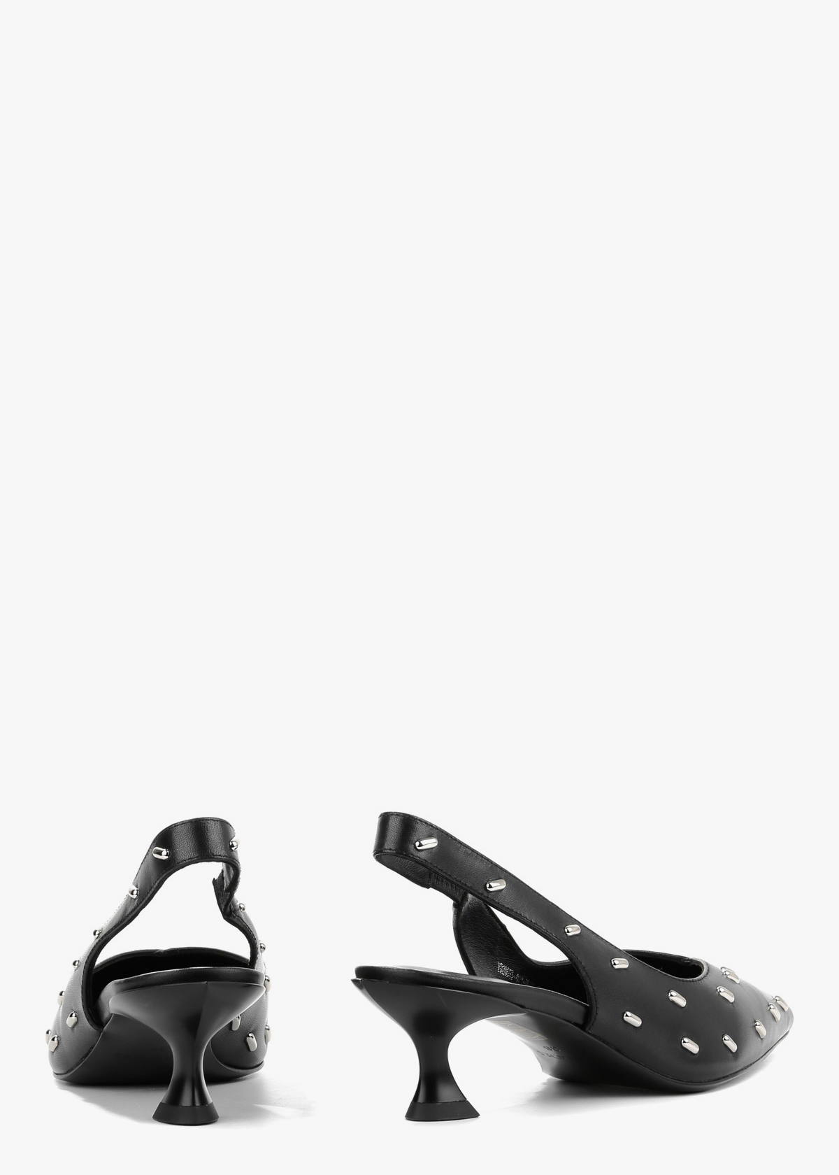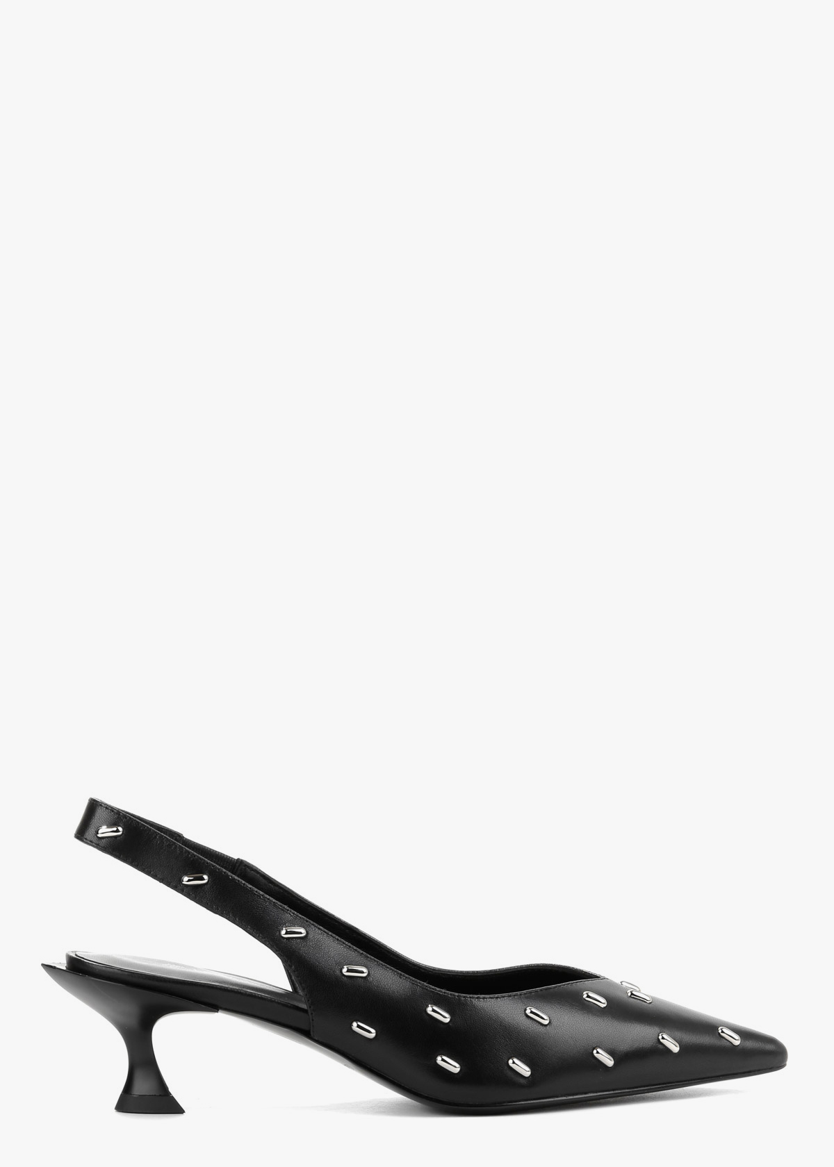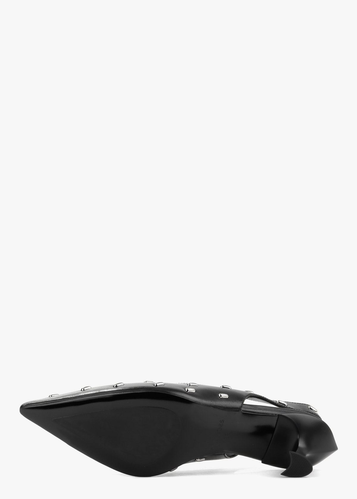 Жіночі сабо чорного кольору з натуральної шкіри — витончена модель із загостреним носком та відкритою п’ятою. Верх декорований акуратними металевими елементами, які додають виразності та сучасного вигляду. Стійкий каблук середньої висоти забезпечує впевненість під час ходьби та зручну посадку. На нозі сабо відчуваються комфортними, добре тримають стопу та підходять для тривалого носіння.
