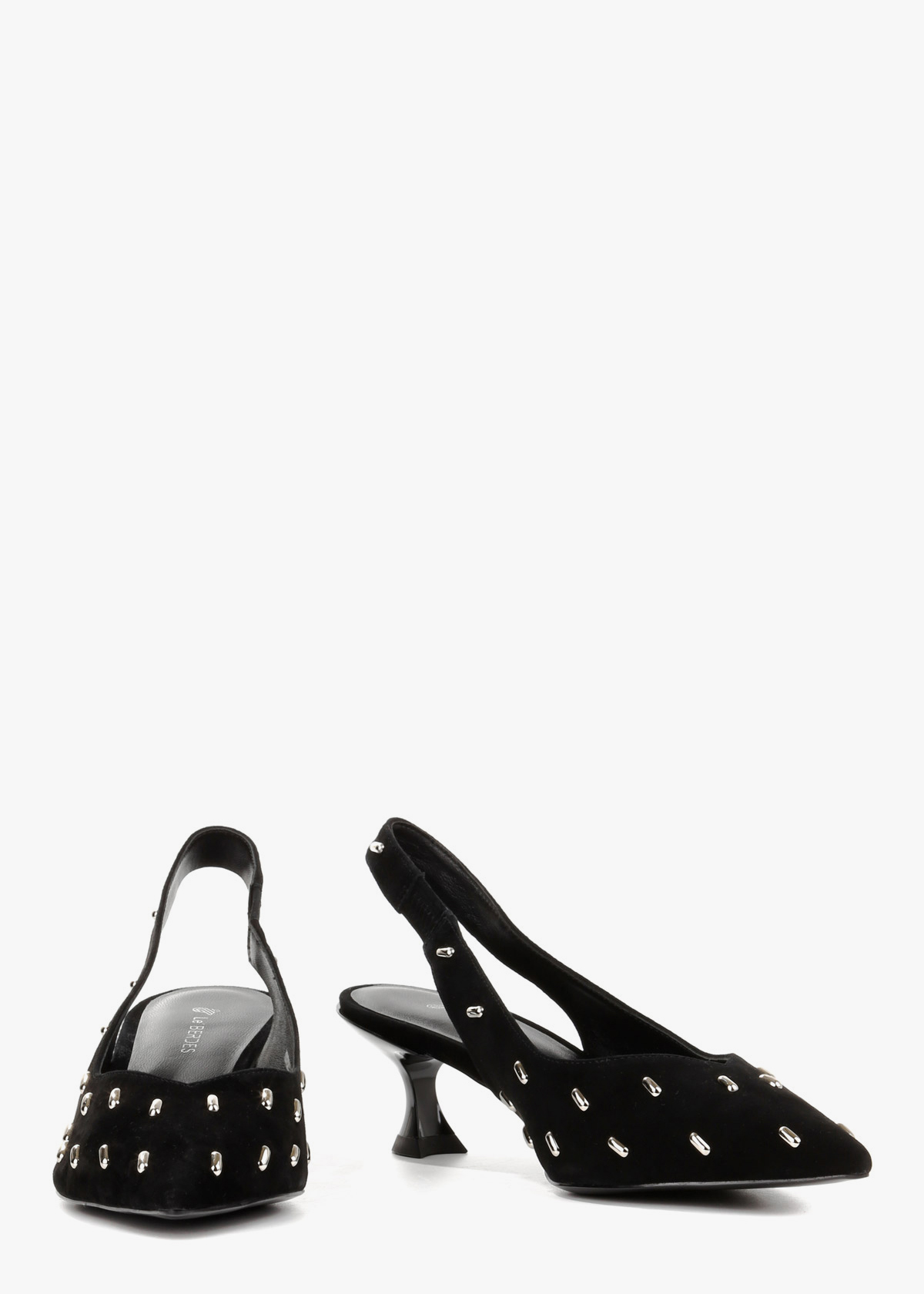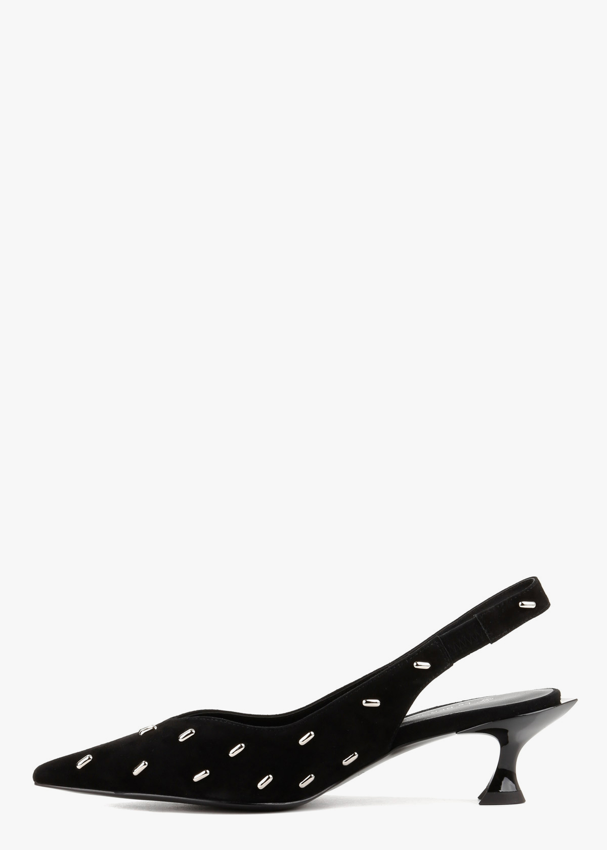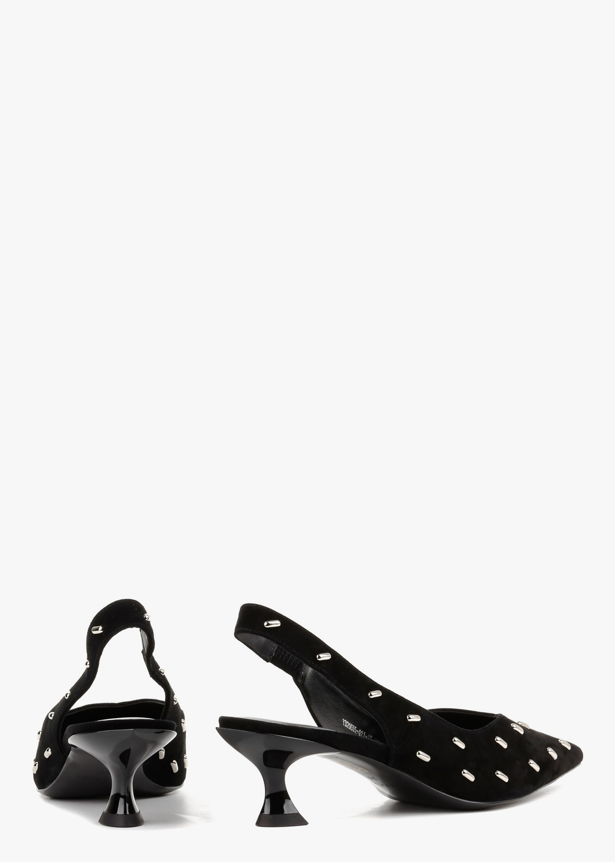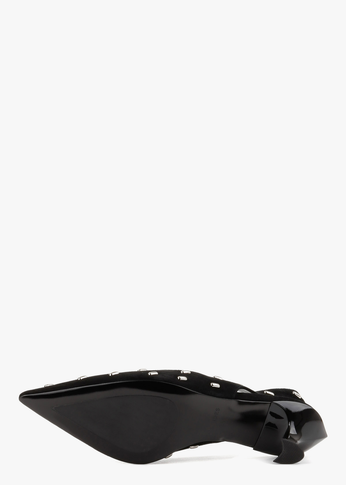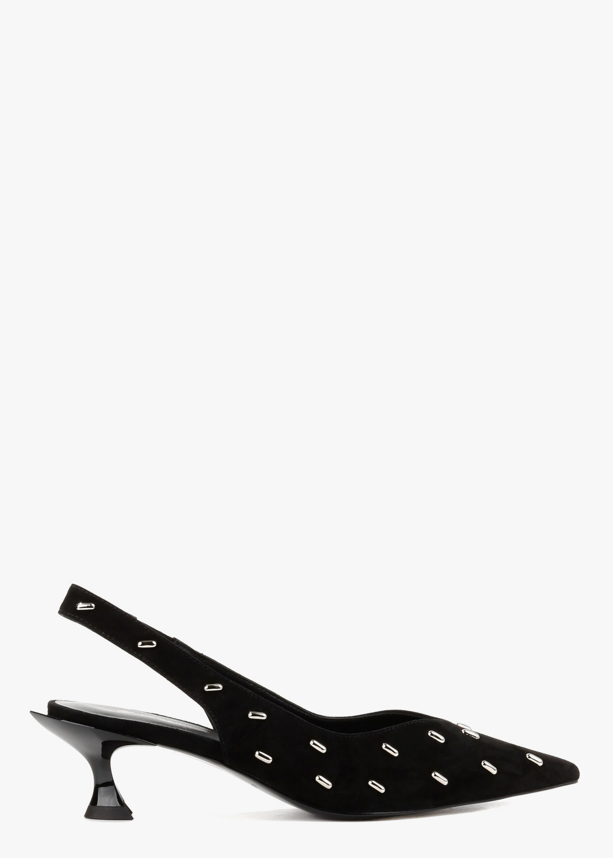 Жіночі сабо чорного кольору з натуральної замші — витончена модель із загостреним носком та відкритою п’ятою. Верх декорований акуратними металевими елементами, які додають виразності та сучасного вигляду. Стійкий каблук середньої висоти забезпечує впевненість під час ходьби та зручну посадку. На нозі сабо відчуваються комфортними, добре тримають стопу та підходять для тривалого носіння.