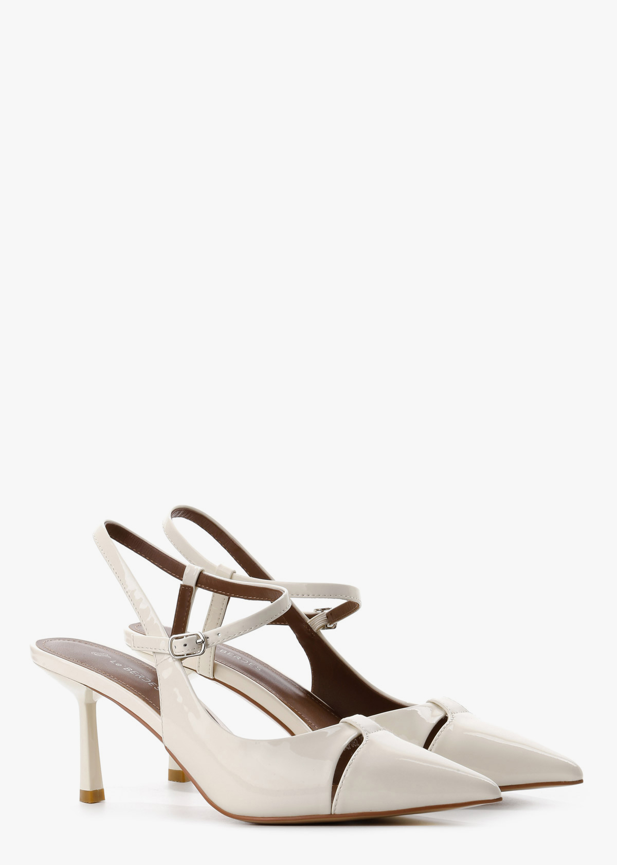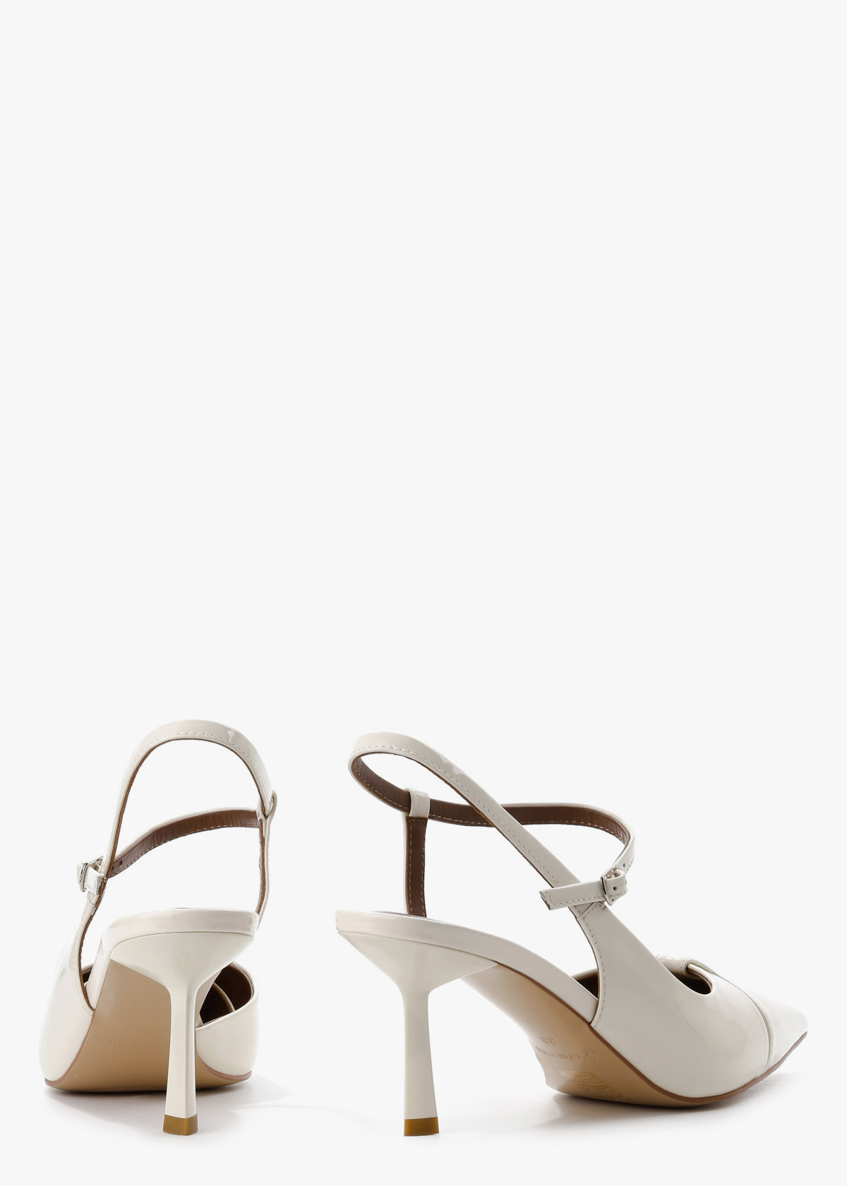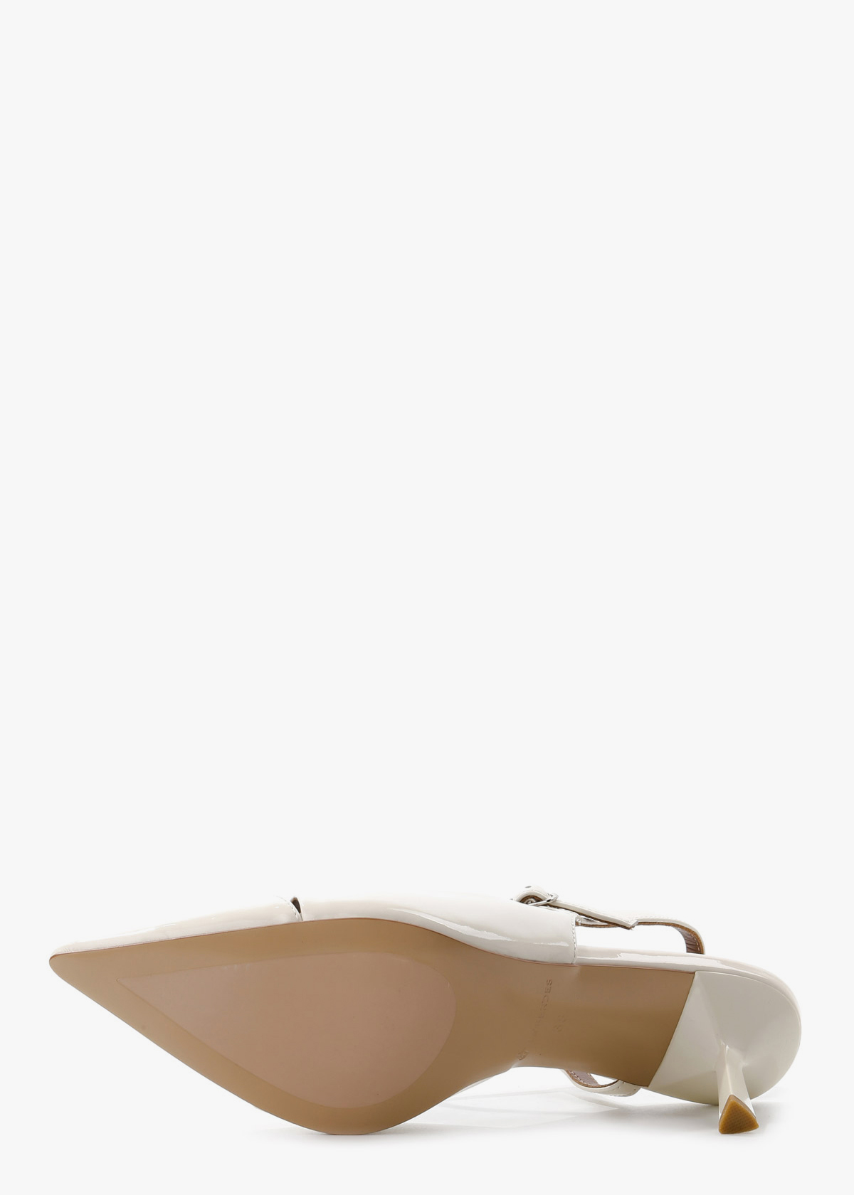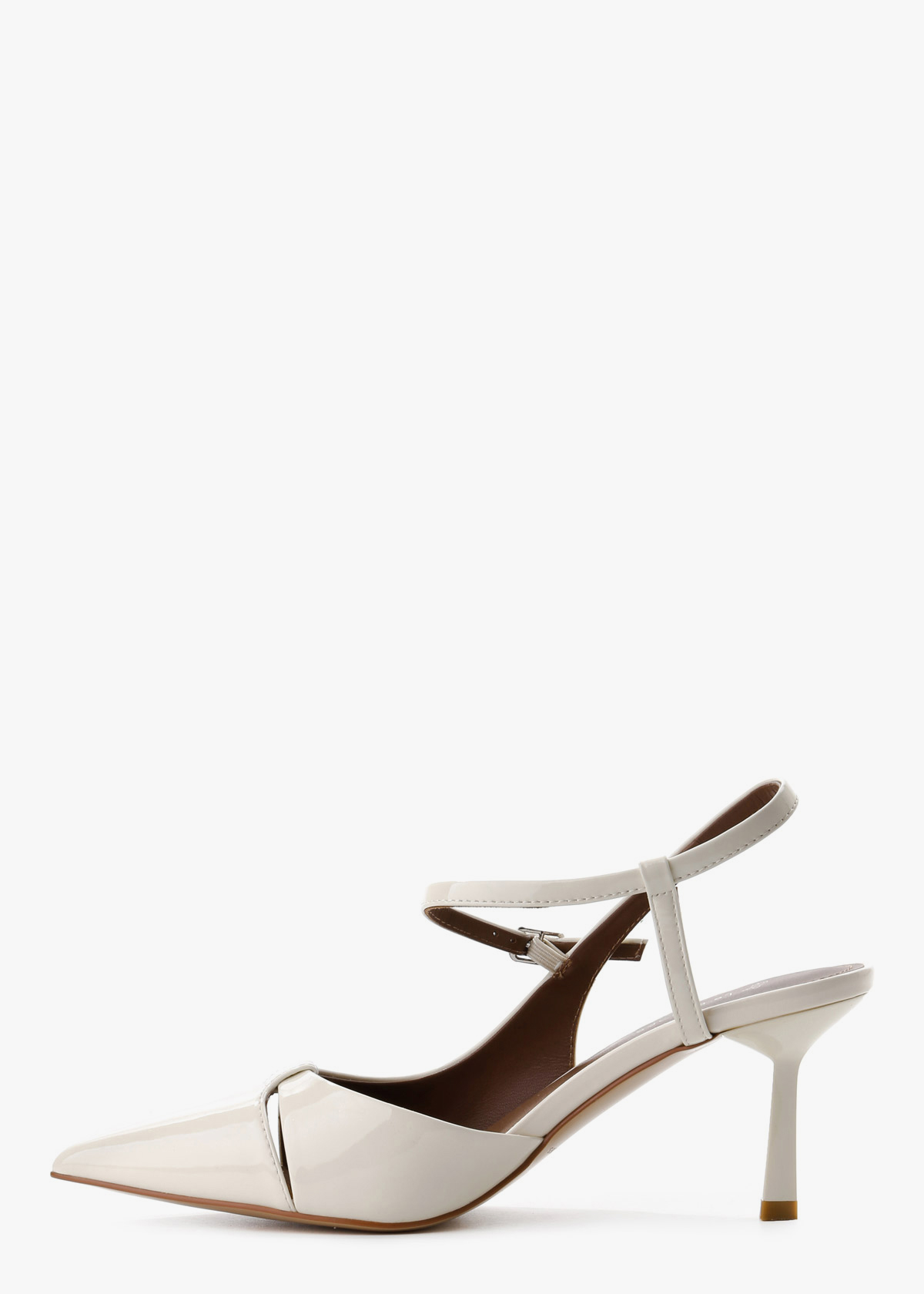Жіночі сабо молочного кольору з лакованої шкіри — витончена модель із загостреним носком та відкритою п’ятою. Гладкий глянцевий верх акуратно тримає форму, а тонкий ремінець із застібкою на щиколотці забезпечує надійну фіксацію. Середній каблук додає висоти й зберігає стійкість під час ходьби. На нозі виглядають елегантно та залишаються комфортними протягом кількох годин.