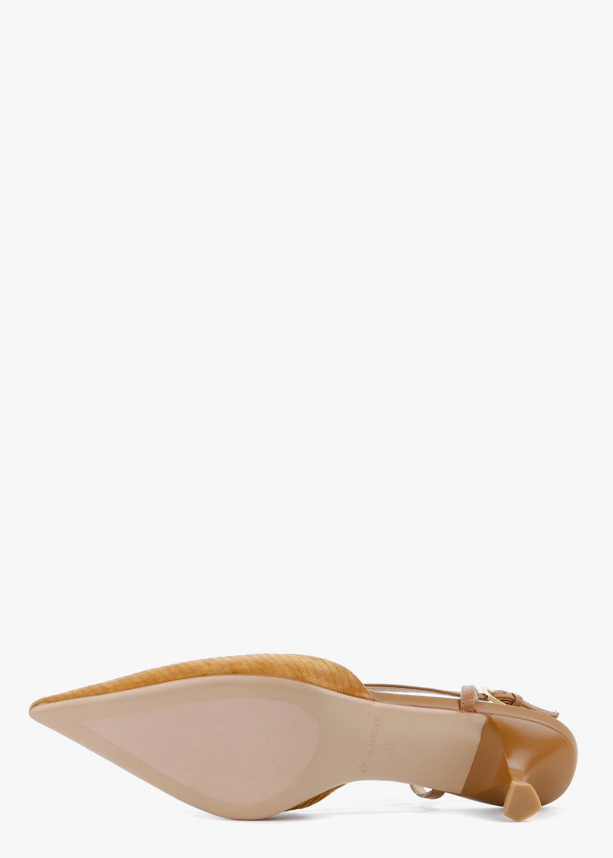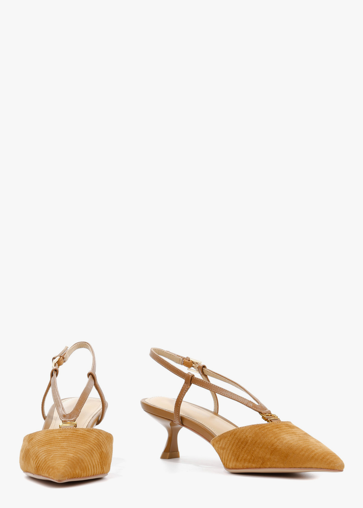 Жіночі сабо рудого кольору з натуральної замші — витончена модель із загостреним носком та відкритою п’ятою. Фактурний замшевий верх має рівномірну текстуру, а тонкий ремінець із застібкою фіксує ногу та дозволяє відрегулювати посадку. Невисокий стійкий каблук забезпечує комфорт і зручність під час ходьби. На нозі виглядають акуратно, добре тримають форму та підходять для щоденного носіння або особливих подій.