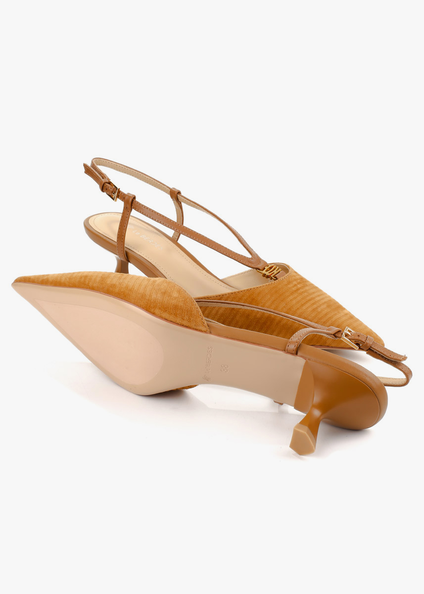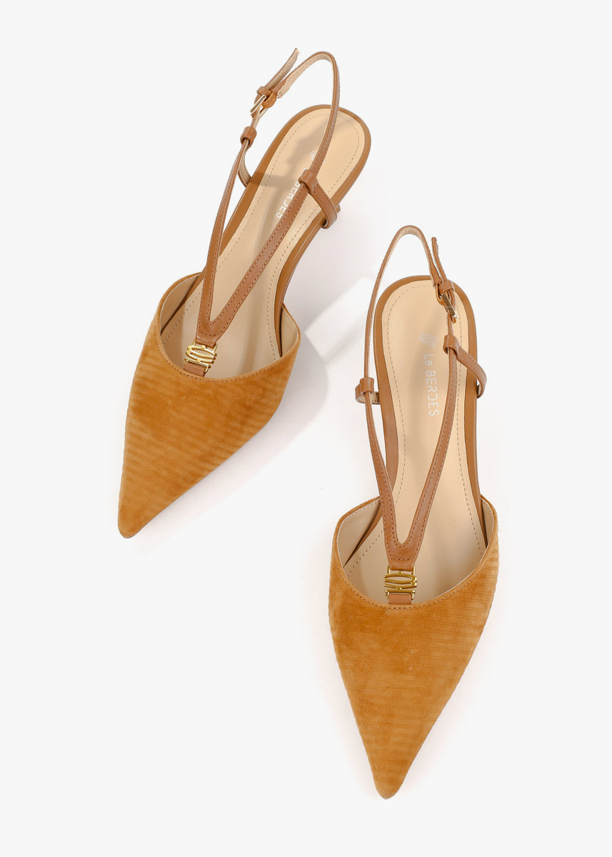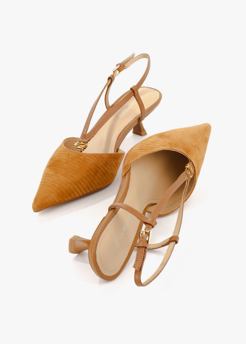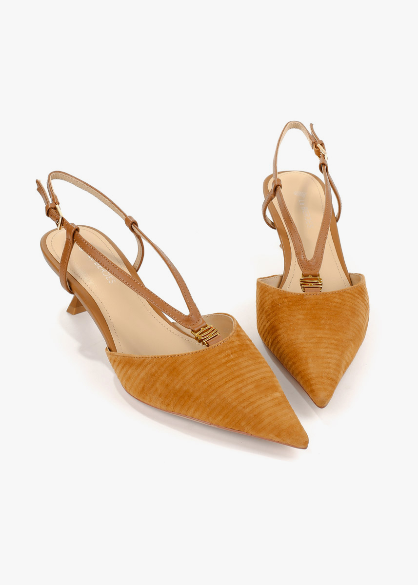 Жіночі сабо рудого кольору з натуральної замші — витончена модель із загостреним носком та відкритою п’ятою. Фактурний замшевий верх має рівномірну текстуру, а тонкий ремінець із застібкою фіксує ногу та дозволяє відрегулювати посадку. Невисокий стійкий каблук забезпечує комфорт і зручність під час ходьби. На нозі виглядають акуратно, добре тримають форму та підходять для щоденного носіння або особливих подій.