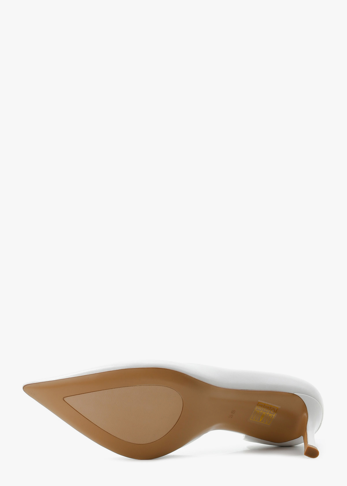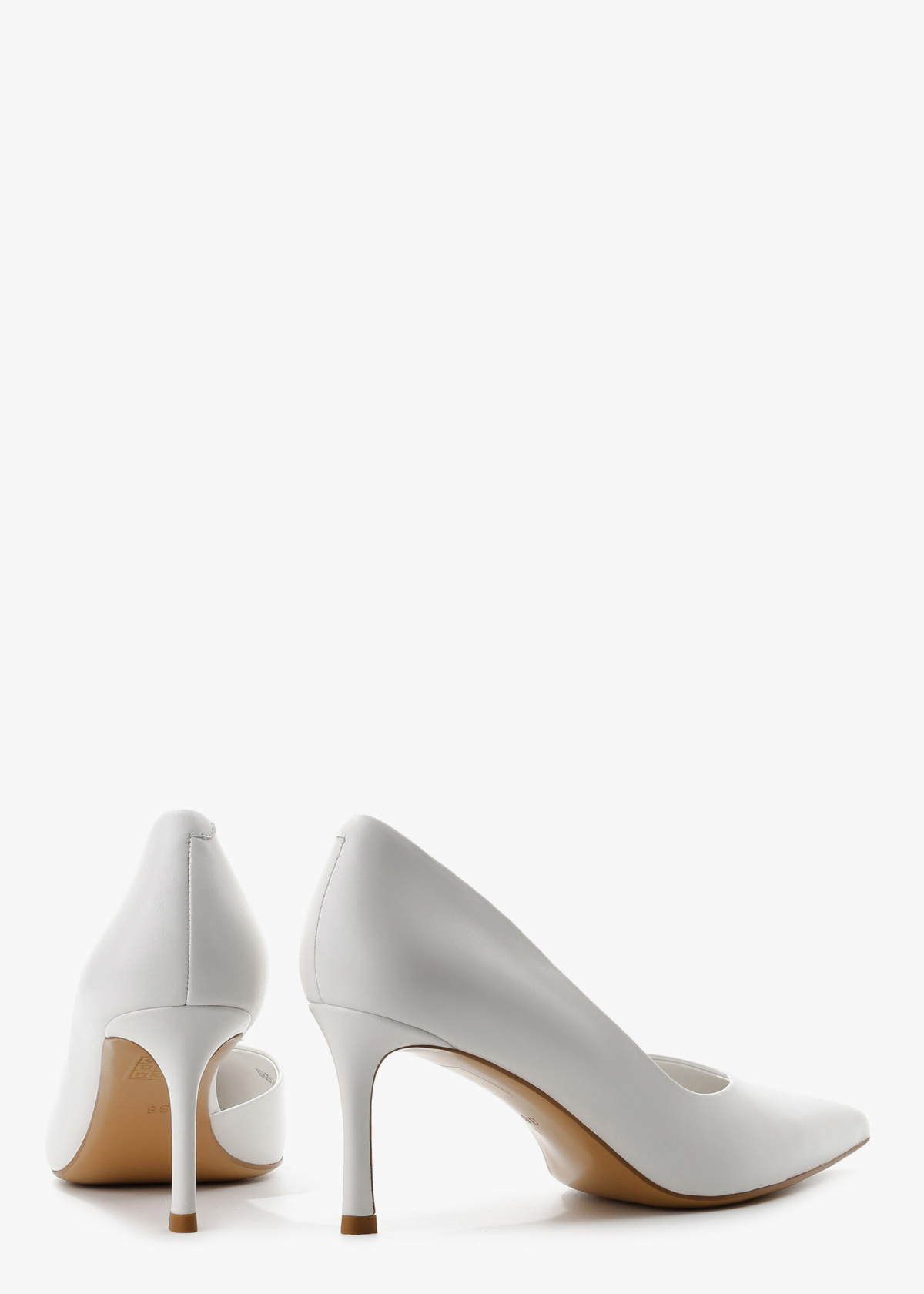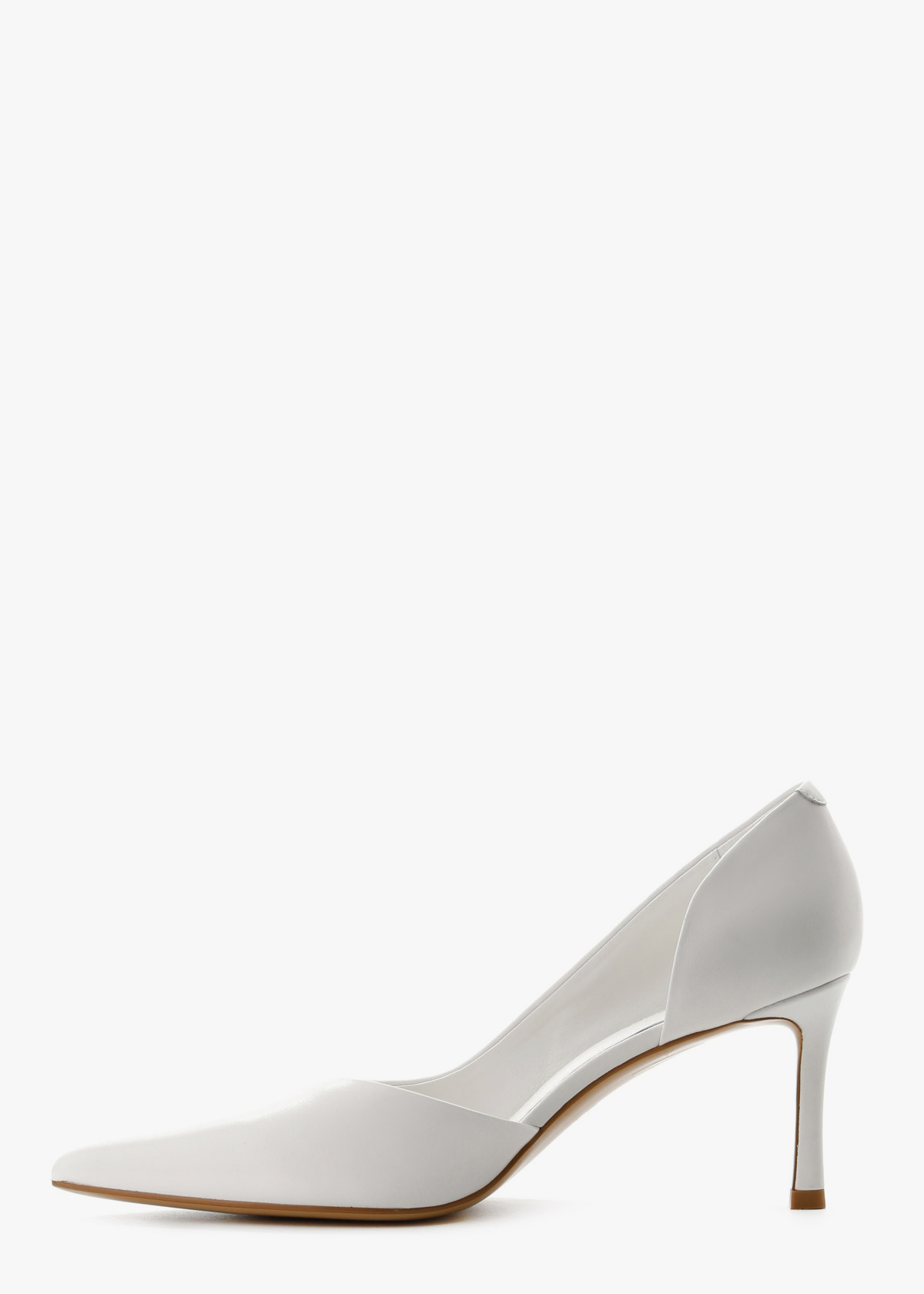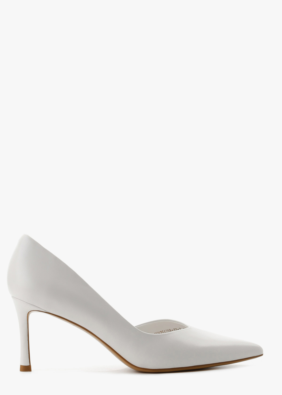 Жіночі туфлі холодного білого кольору з натуральної шкіри — елегантна модель із загостреним носком та витонченим каблуком середньої висоти. З внутрішньої сторони є відкритий виріз, який додає легкості та робить посадку більш комфортною. Гладка шкіра має м’яку текстуру та акуратно виглядає на нозі. Туфлі зручні у ходьбі, добре тримають форму й підходять як до святкового, так і до ділового образу.