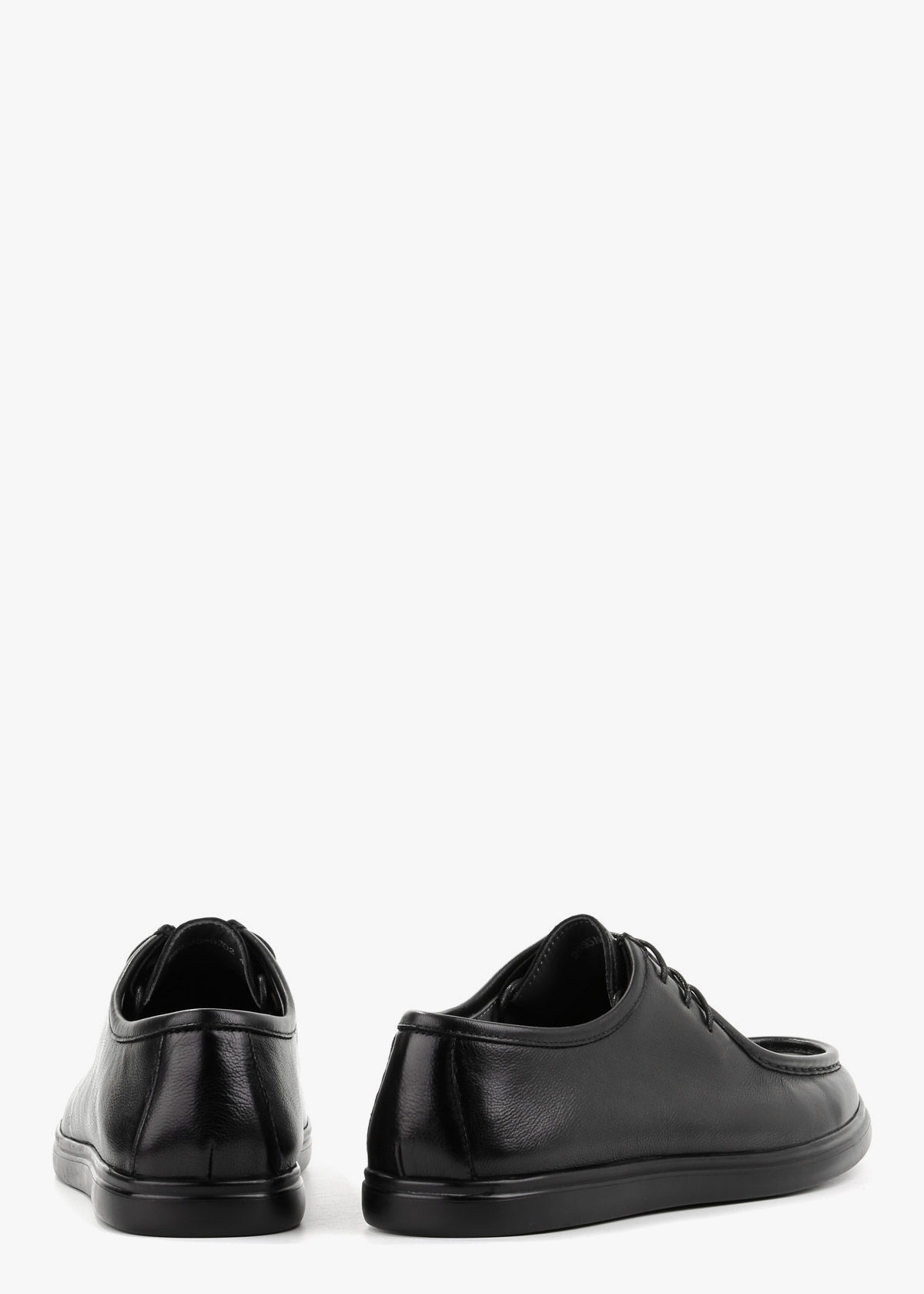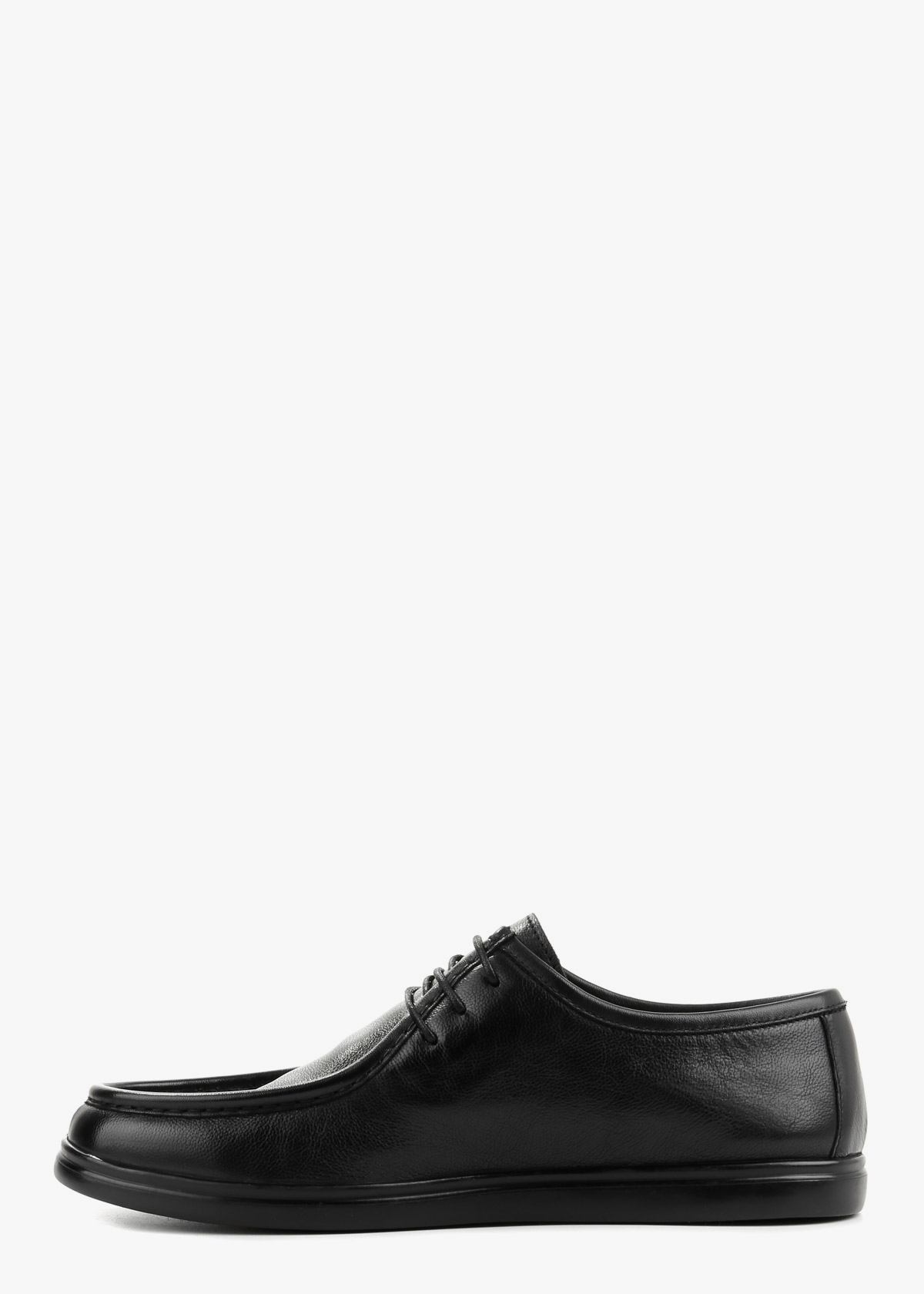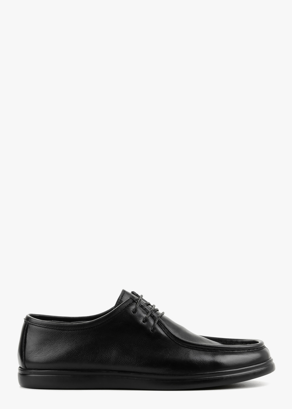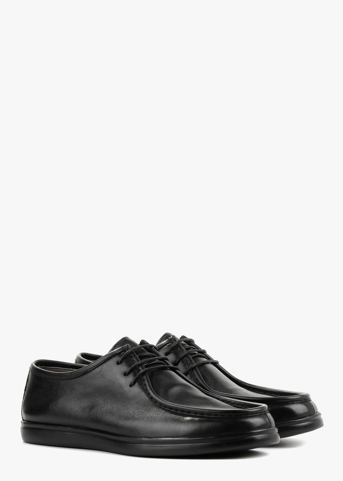 Чоловічі туфлі з натуральної шкірі у чорному кольорі. Модель на шнурівці з акуратним швом по носку та м’якою фактурою матеріалу. Гнучка підошва темного кольору забезпечує зручність під час ходьби. Універсальний варіант для щоденного носіння, який добре поєднується з джинсами та класичними брюками.