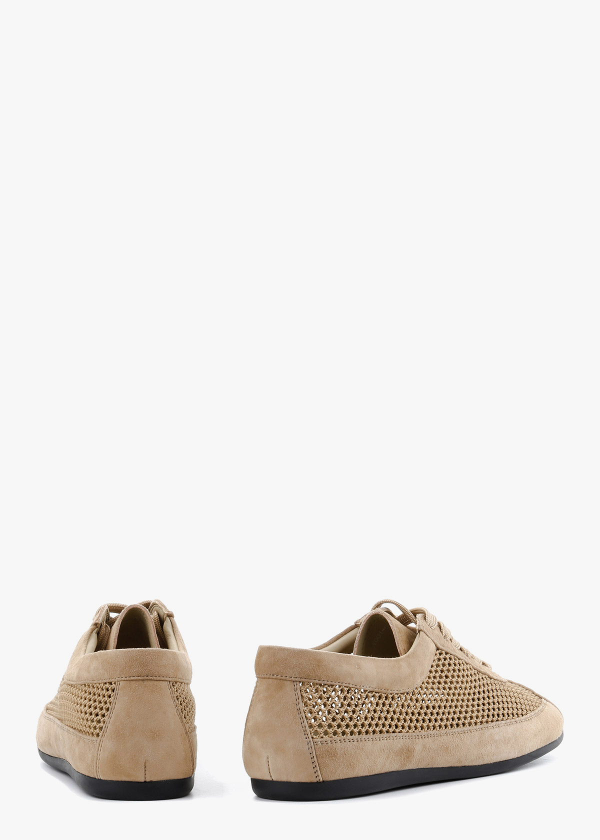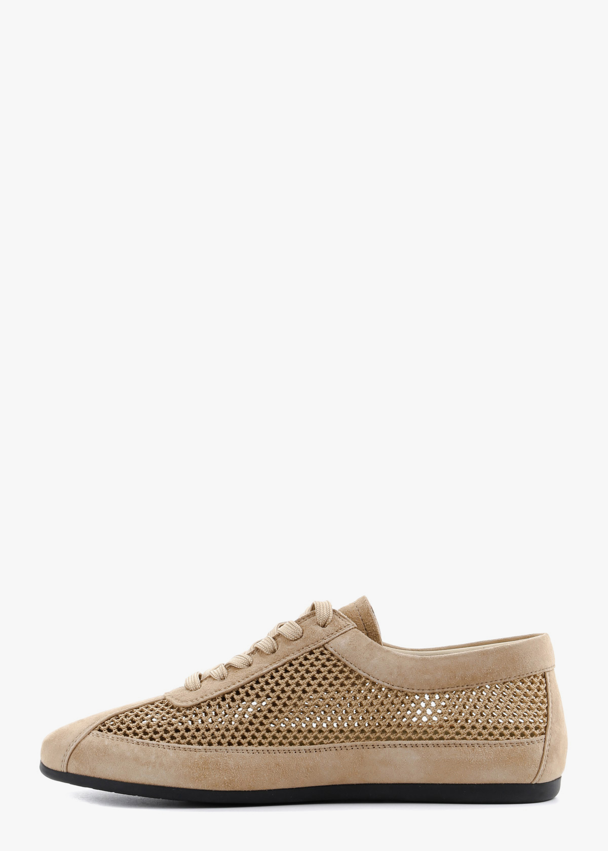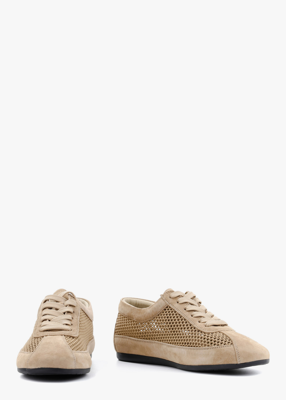 Жіночі кеди бежевого кольору з поєднанням замші та сітчастих вставок — легка модель для теплої пори. Верх має перфорацію, що забезпечує кращу вентиляцію та комфорт під час ходьби. Класична шнурівка дозволяє відрегулювати посадку по нозі, а тонка гнучка підошва додає зручності щодня. На нозі виглядають акуратно, відчуваються легкими та добре пропускають повітря.