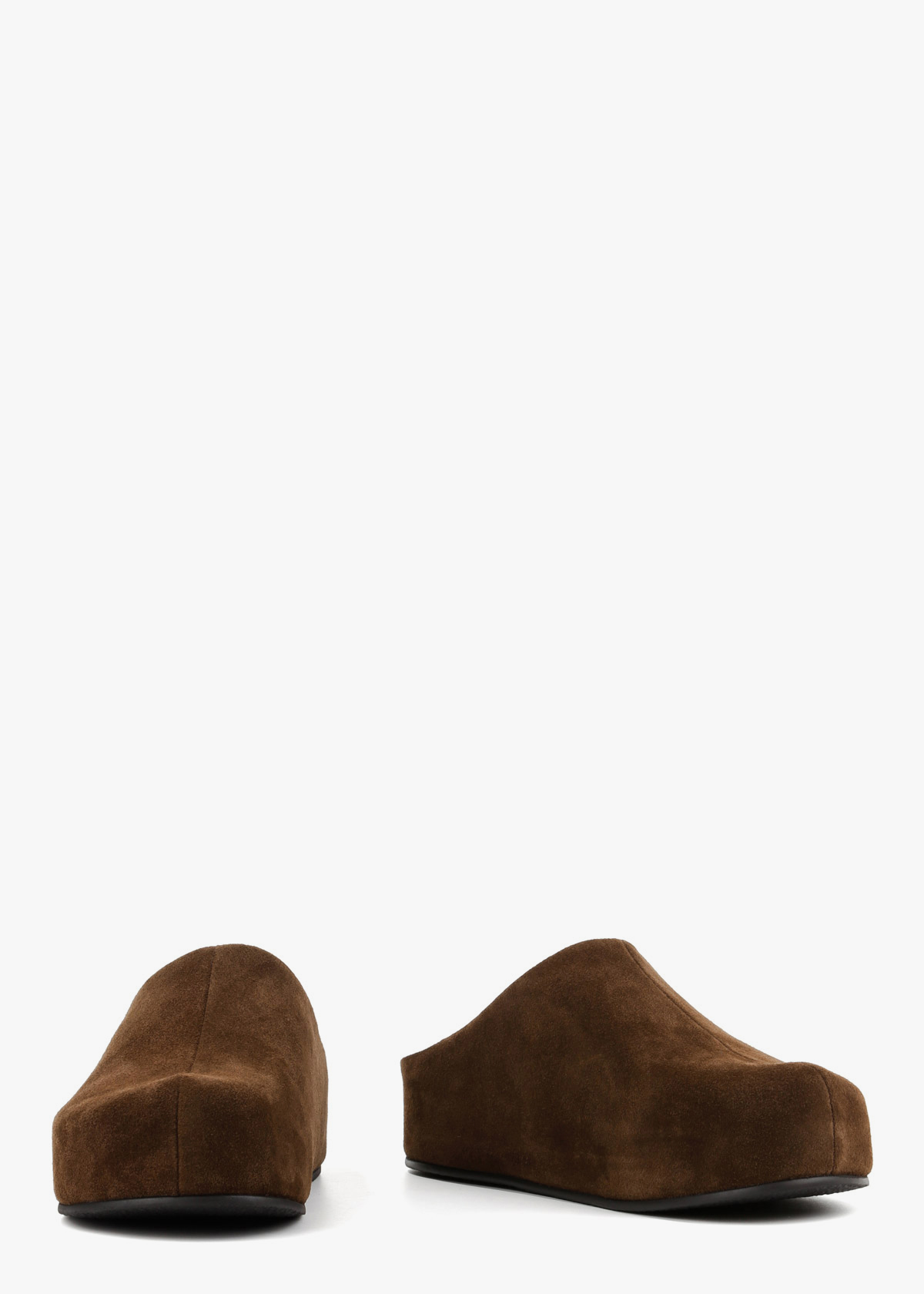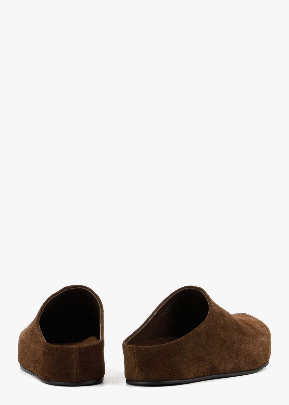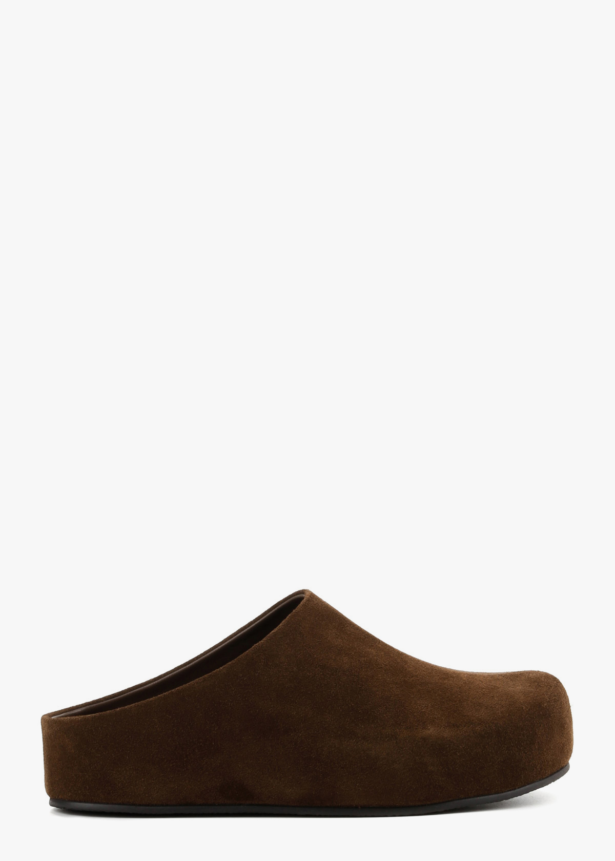Жіночі сабо коричневого кольору з натуральної замші — мінімалістична модель із закритим носком та відкритою п’ятою. Цілісний верх м’який і щільний, приємний на дотик та акуратно виглядає на нозі. Підошва висотою 4 см, міцна та стійка, не гнеться, добре ізолює від поверхні. Модель зручна у носінні, легко взувається та підходить для щоденних образів.
