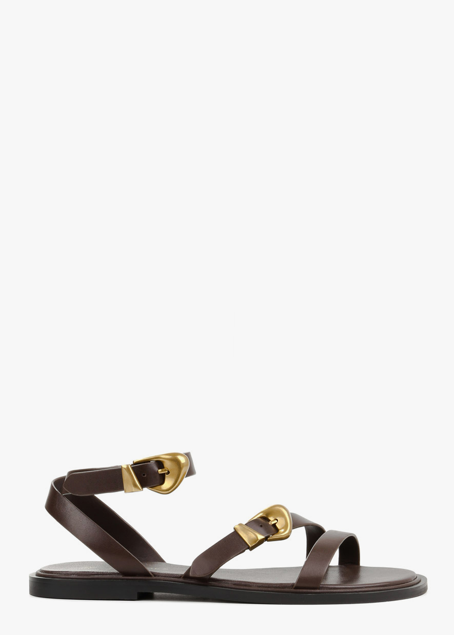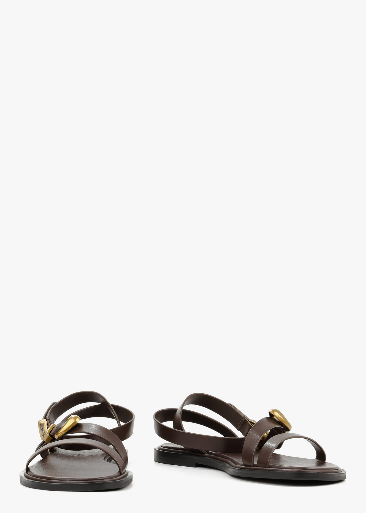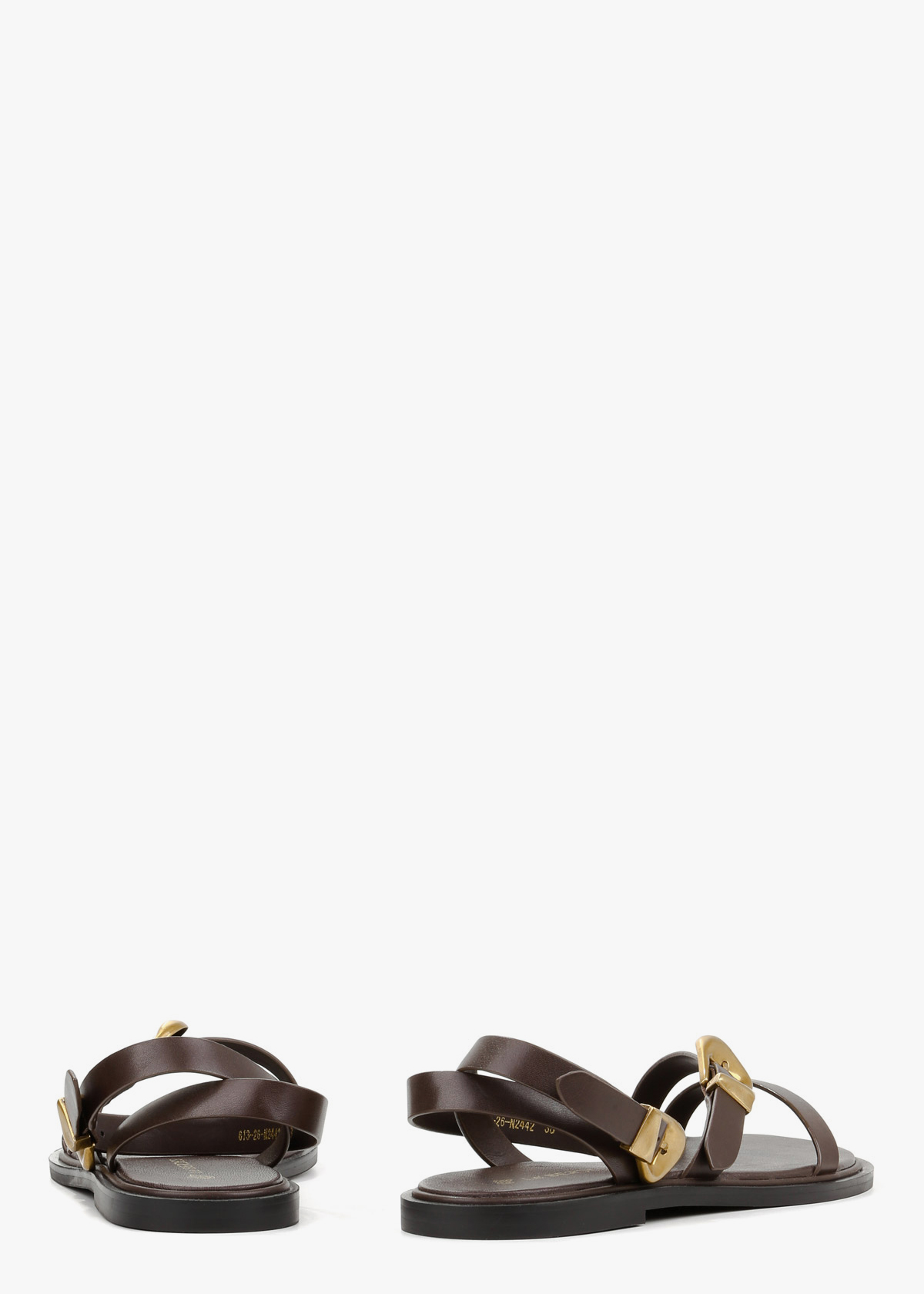 Жіночі сандалі коричневого кольору виконані з натуральної шкіри та мають мінімалістичний, чіткий дизайн. Тонкі ремінці з металевими пряжками добре фіксують стопу й дозволяють відрегулювати посадку під себе. Плоска підошва забезпечує природний крок, а в носінні модель відчувається легко й стабільно, без зайвого навантаження на ногу.