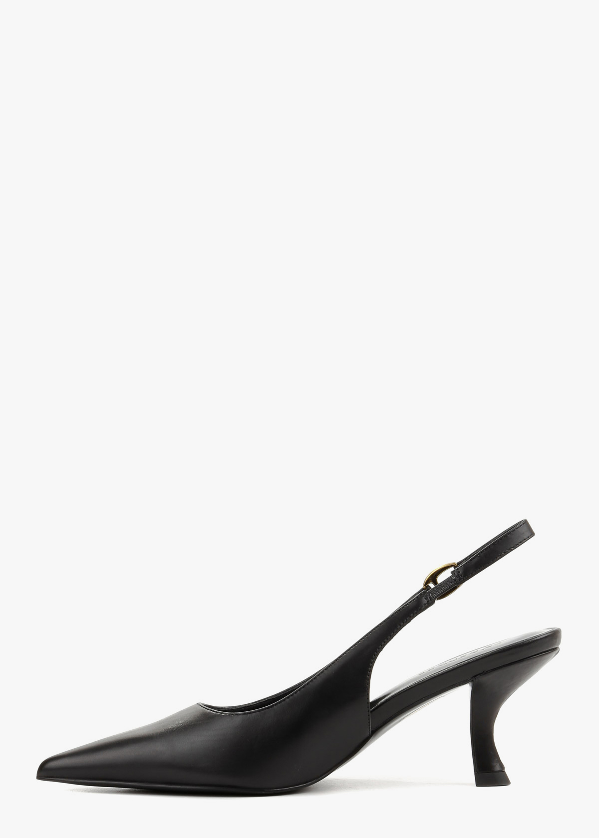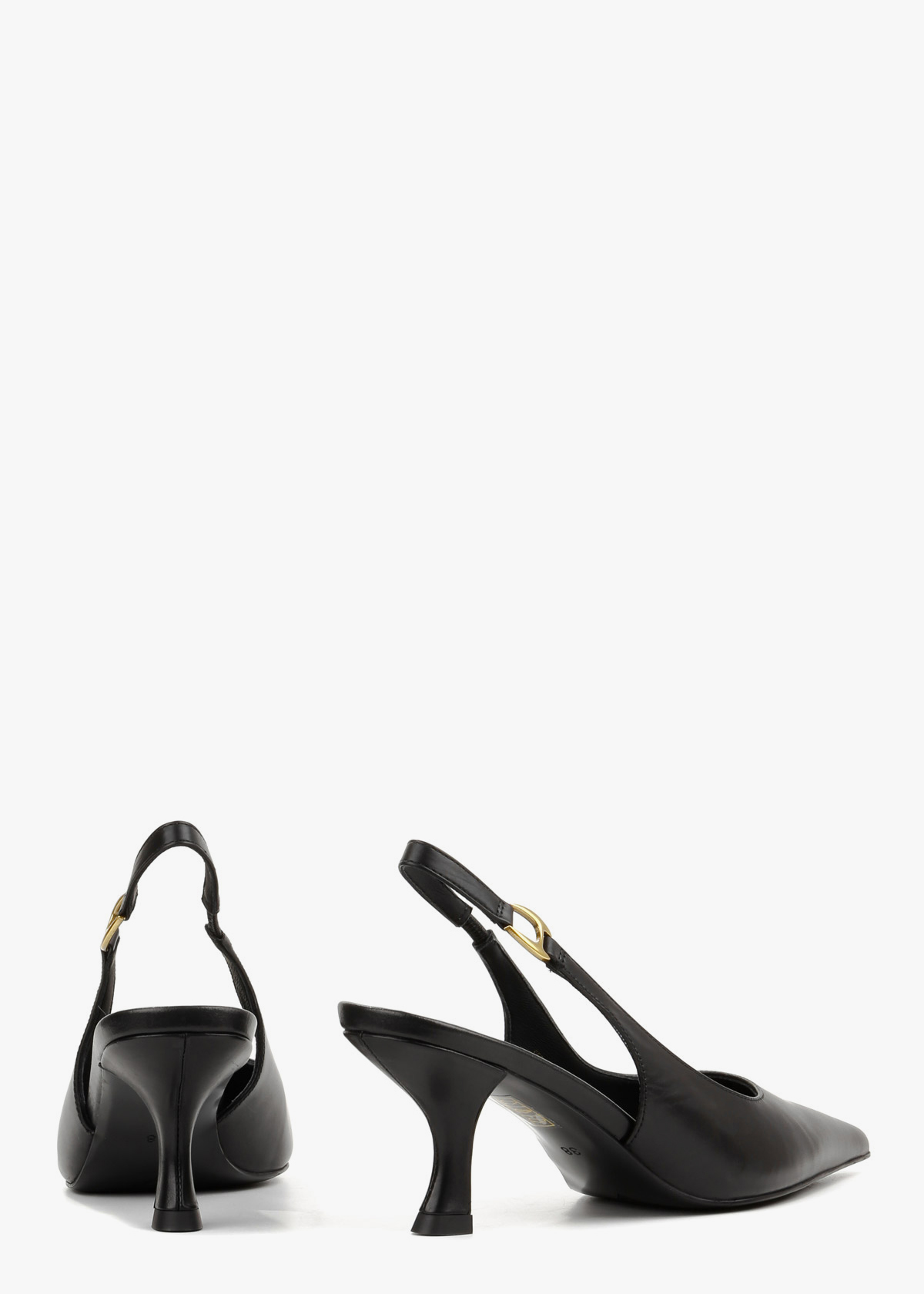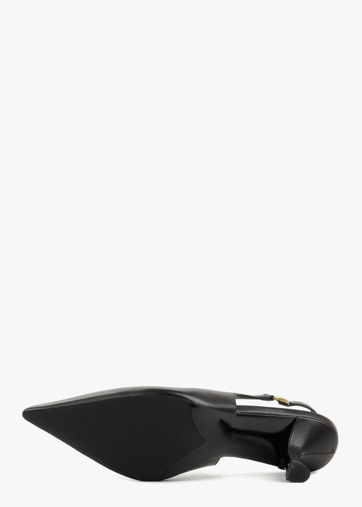 Елегантні чорні сабо виготовлені з м’якої матової шкіри, що надає взуттю класичного та стриманого вигляду. Витончений силует із гострим мисом доповнений стильним ремінцем із золотистою фурнітурою, яка надійно фіксує п’яту та додає моделі розкоші. Оригінальний фігурний каблук забезпечує стійкість і комфорт при кожному кроці, роблячи цю пару ідеальним вибором для вишуканих вечірніх та ділових образів.