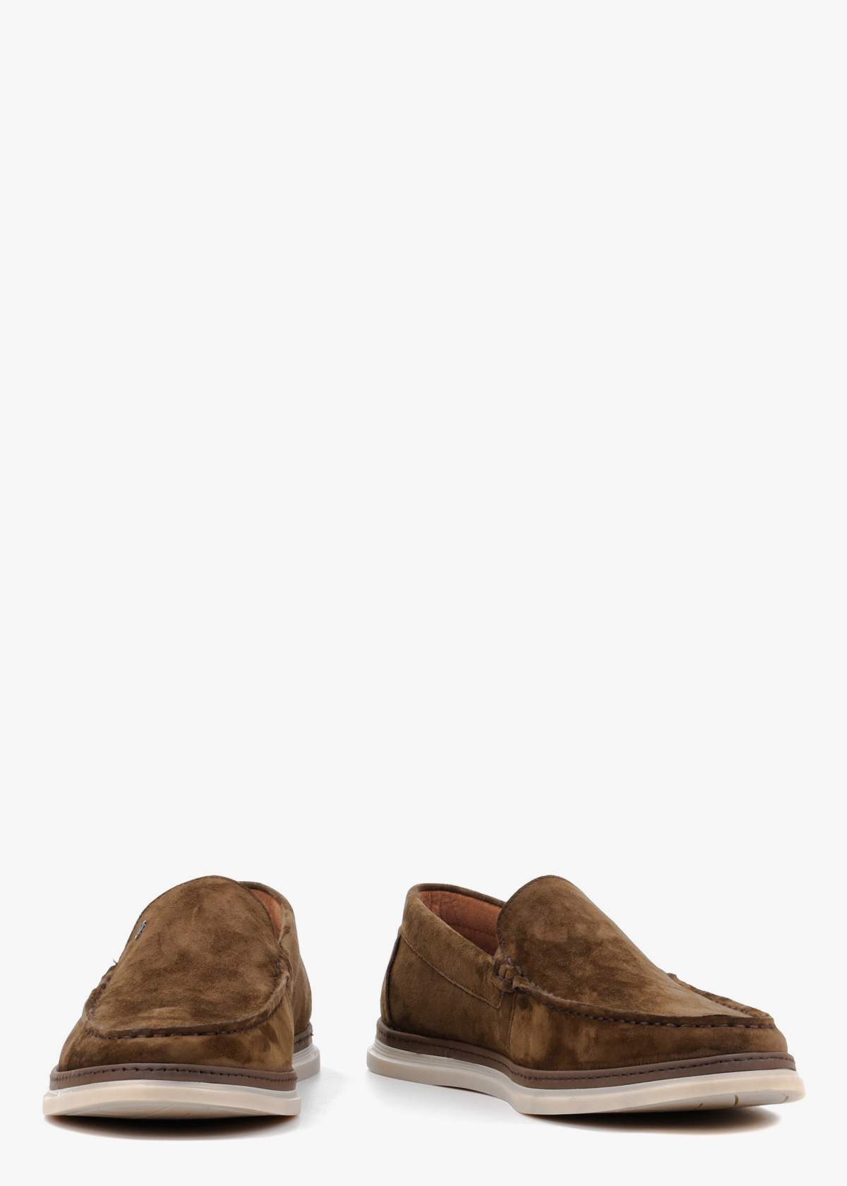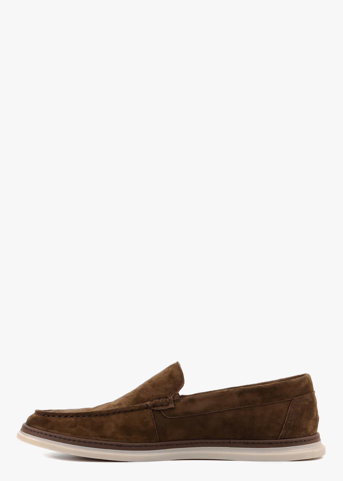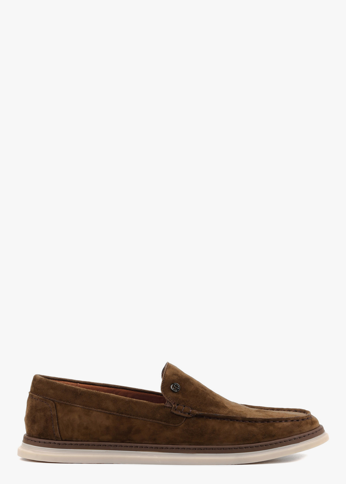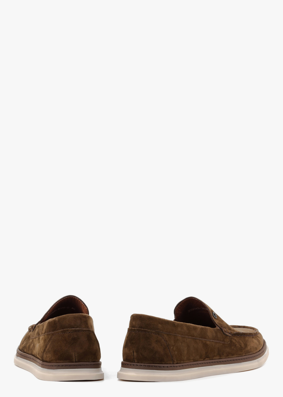 Чоловічі мокасини виготовлені з м'якої натуральної замші відтінку хакі. Взуття має еластичну світло-бежеву підошву, яка забезпечує чудову амортизацію та комфорт при щоденному носінні. Характерний зовнішній шов на миску та стриманий металевий логотип збоку додають моделі завершеного вигляду. Завдяки класичному дизайну без шнурівки, така пара ідеально доповнить ваш образ.