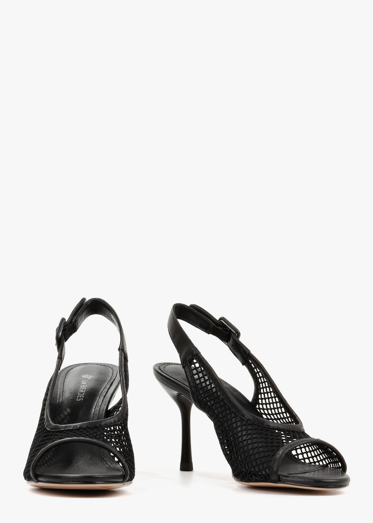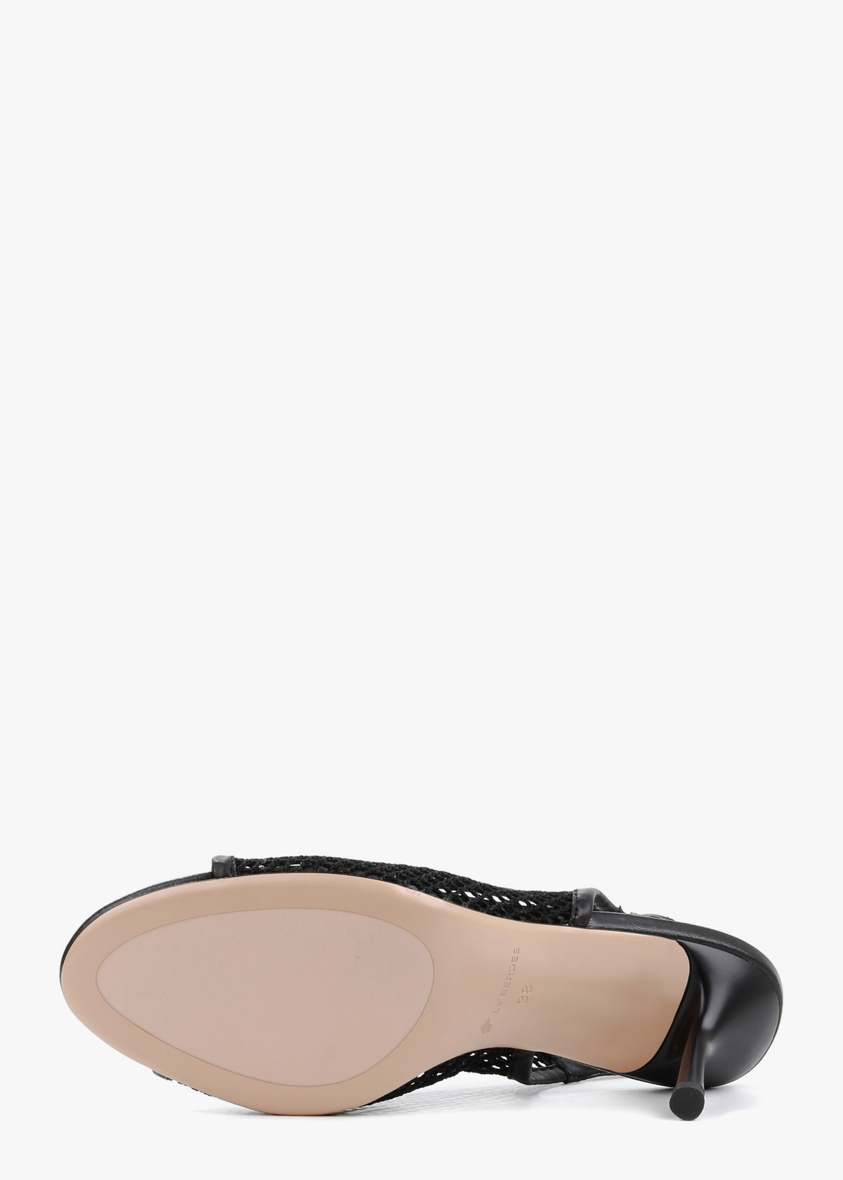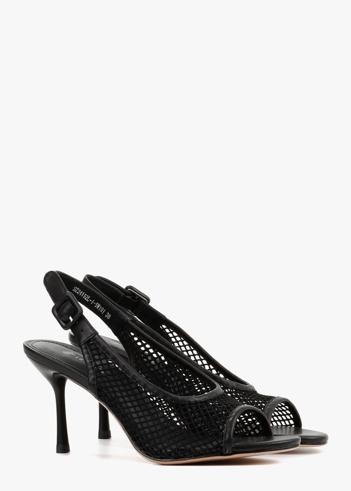 Жіночі босоніжки у чорному кольорі поєднують у собі елементи класики та сучасних трендів. Модель виконана з комбінації натуральної шкіри та великої текстильної сітки, що надає виробу особливої легкості та забезпечує ідеальну повітропроникність. Відкритий мис та ремінець із масивною обтяжною пряжкою на п'яті підкреслюють витонченість ліній стопи. Високий тонкий підбор додає образу вишуканості, роблячи цю пару ідеальним завершенням святкового літнього гардероба.