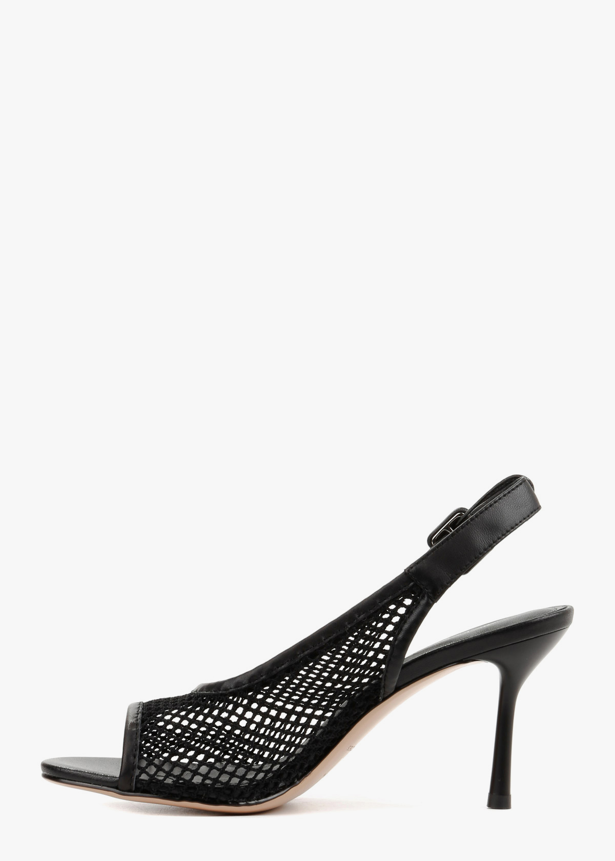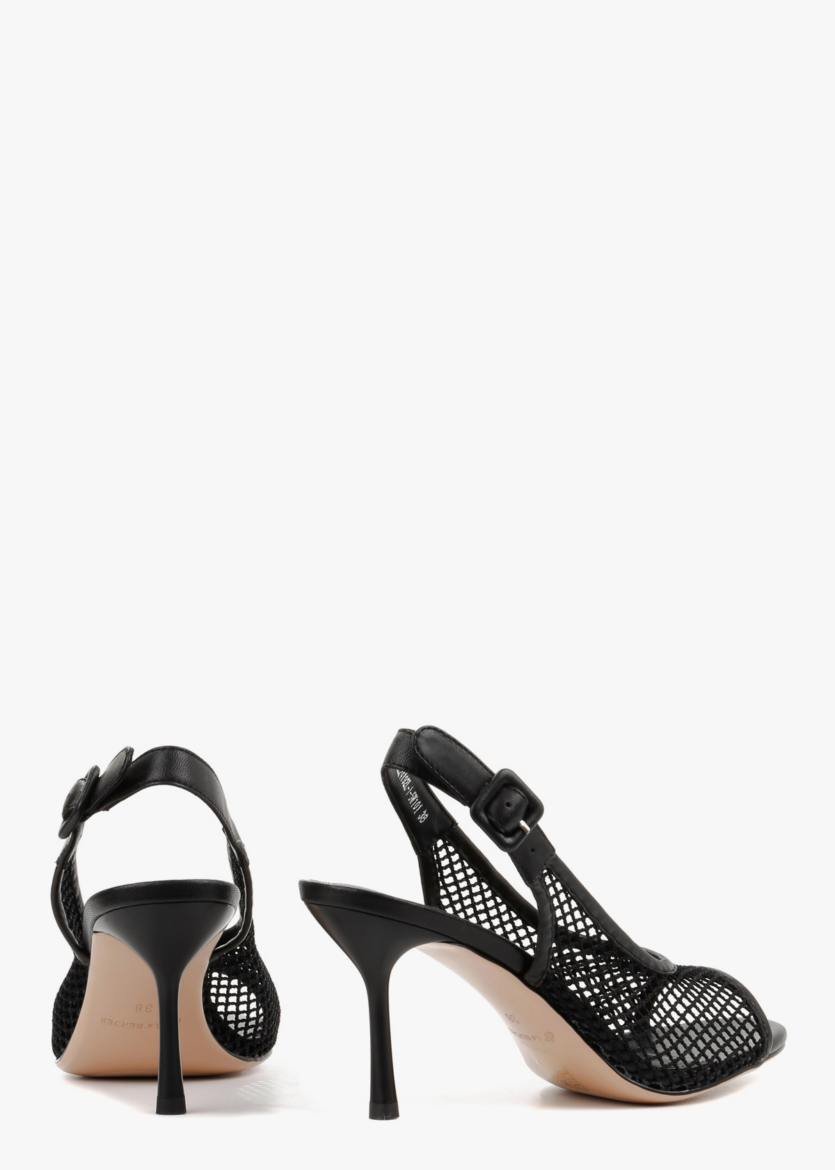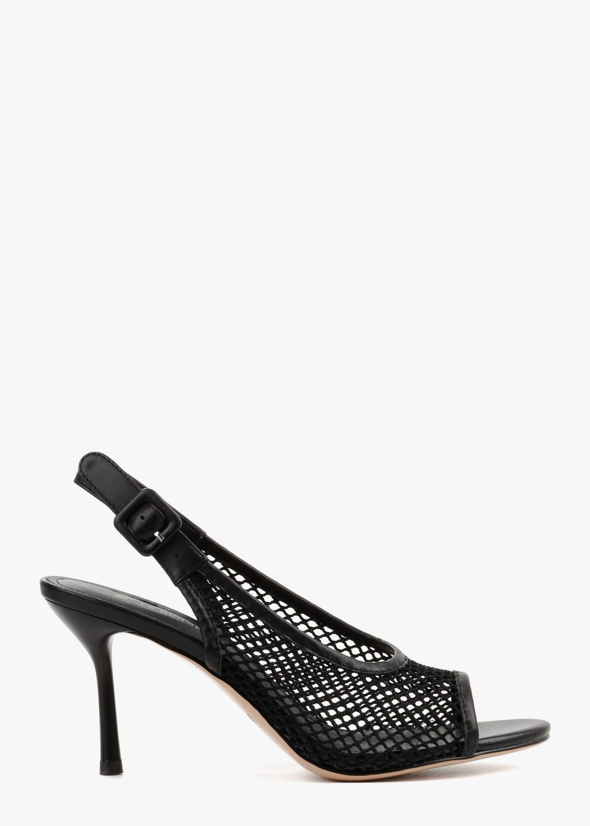 Жіночі босоніжки у чорному кольорі поєднують у собі елементи класики та сучасних трендів. Модель виконана з комбінації натуральної шкіри та великої текстильної сітки, що надає виробу особливої легкості та забезпечує ідеальну повітропроникність. Відкритий мис та ремінець із масивною обтяжною пряжкою на п'яті підкреслюють витонченість ліній стопи. Високий тонкий підбор додає образу вишуканості, роблячи цю пару ідеальним завершенням святкового літнього гардероба.