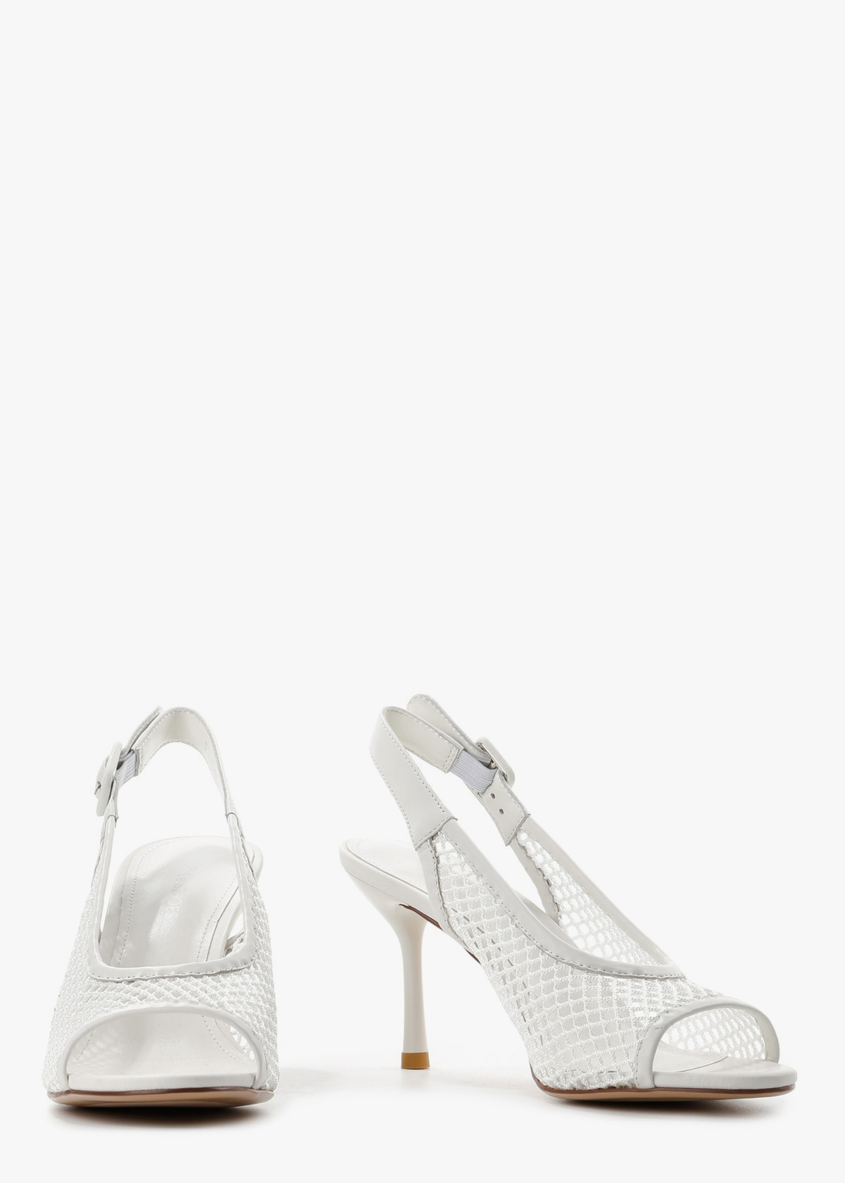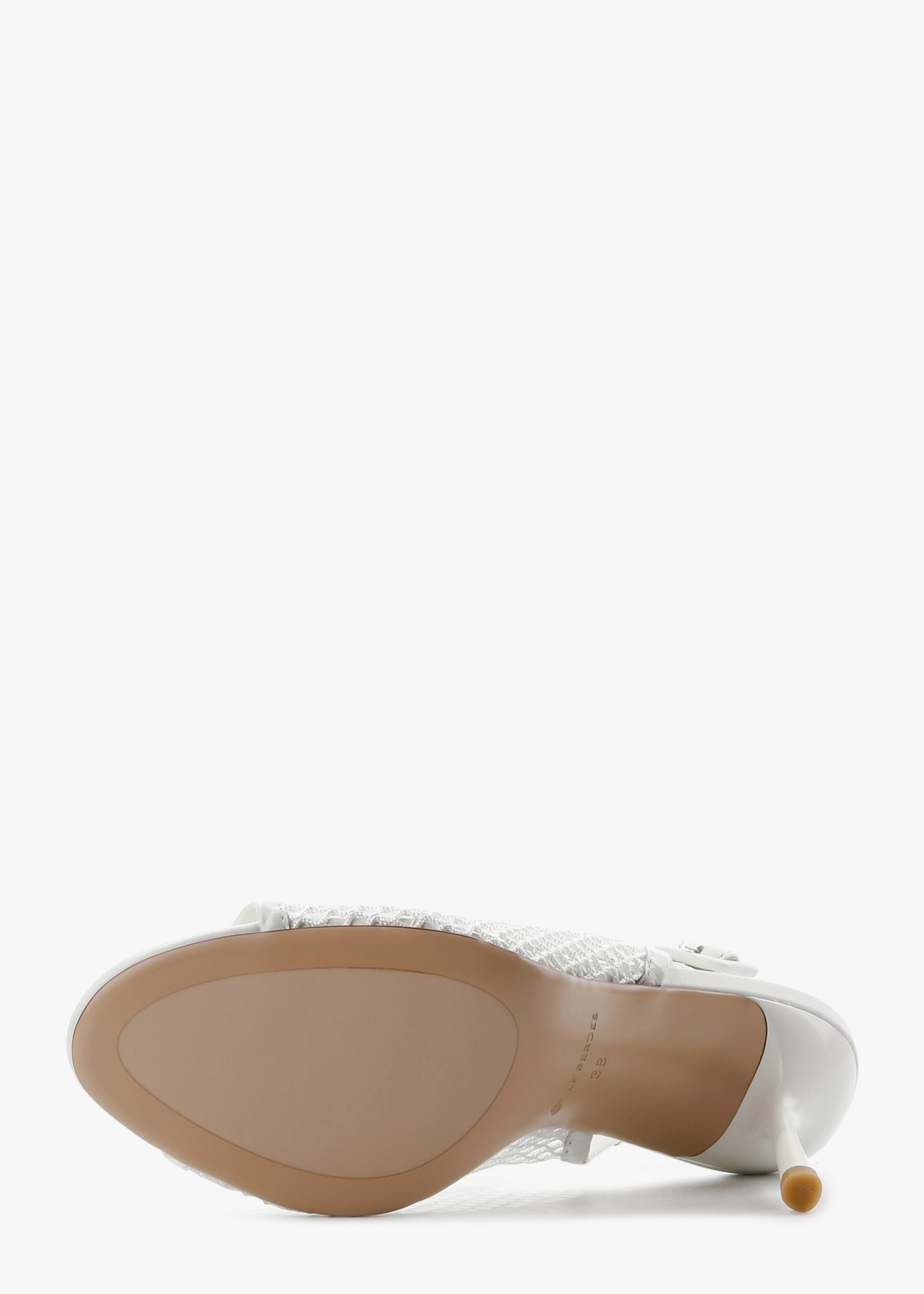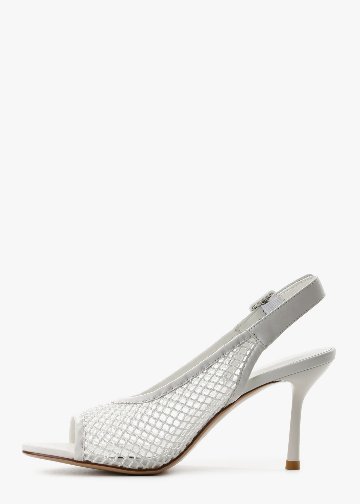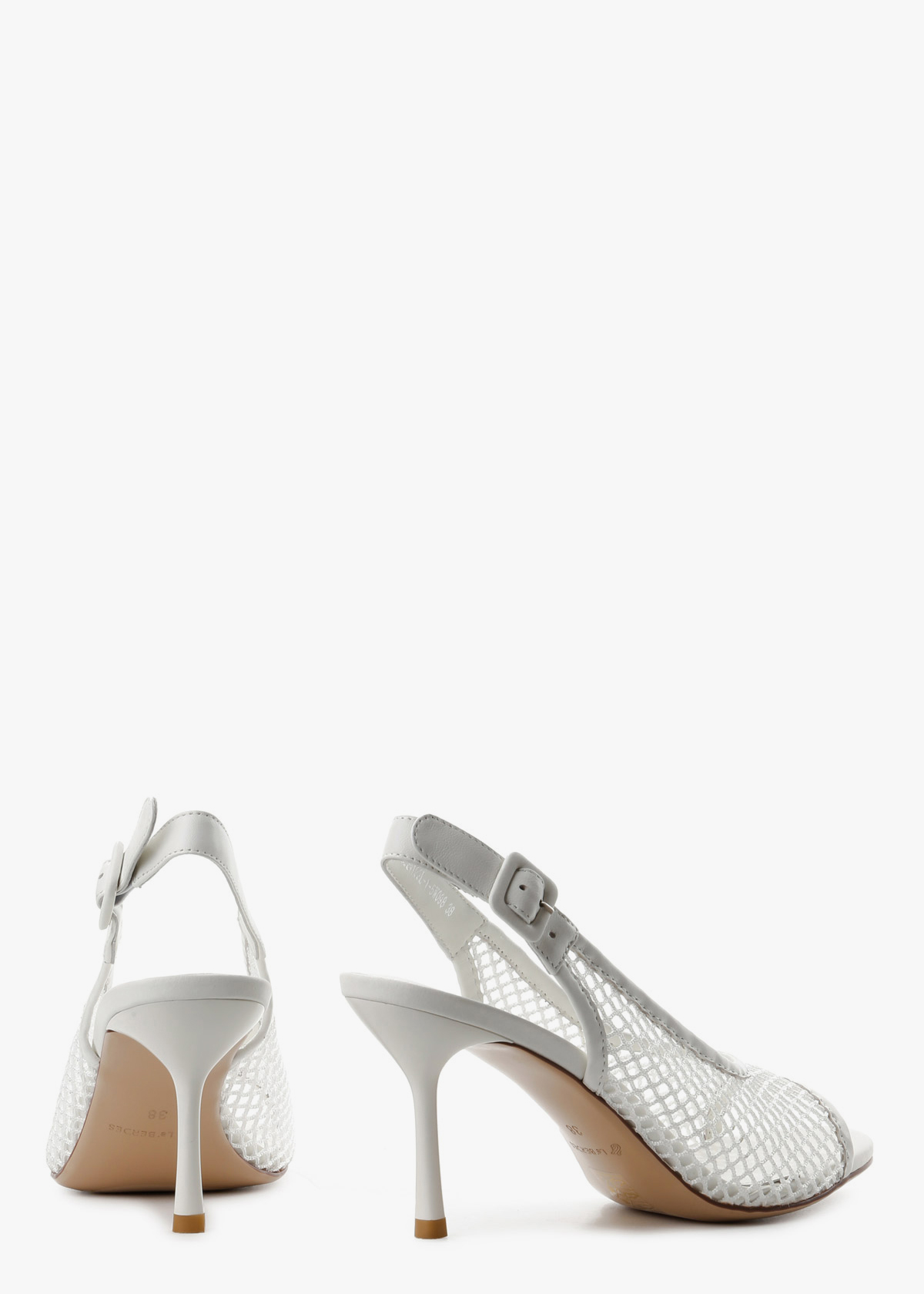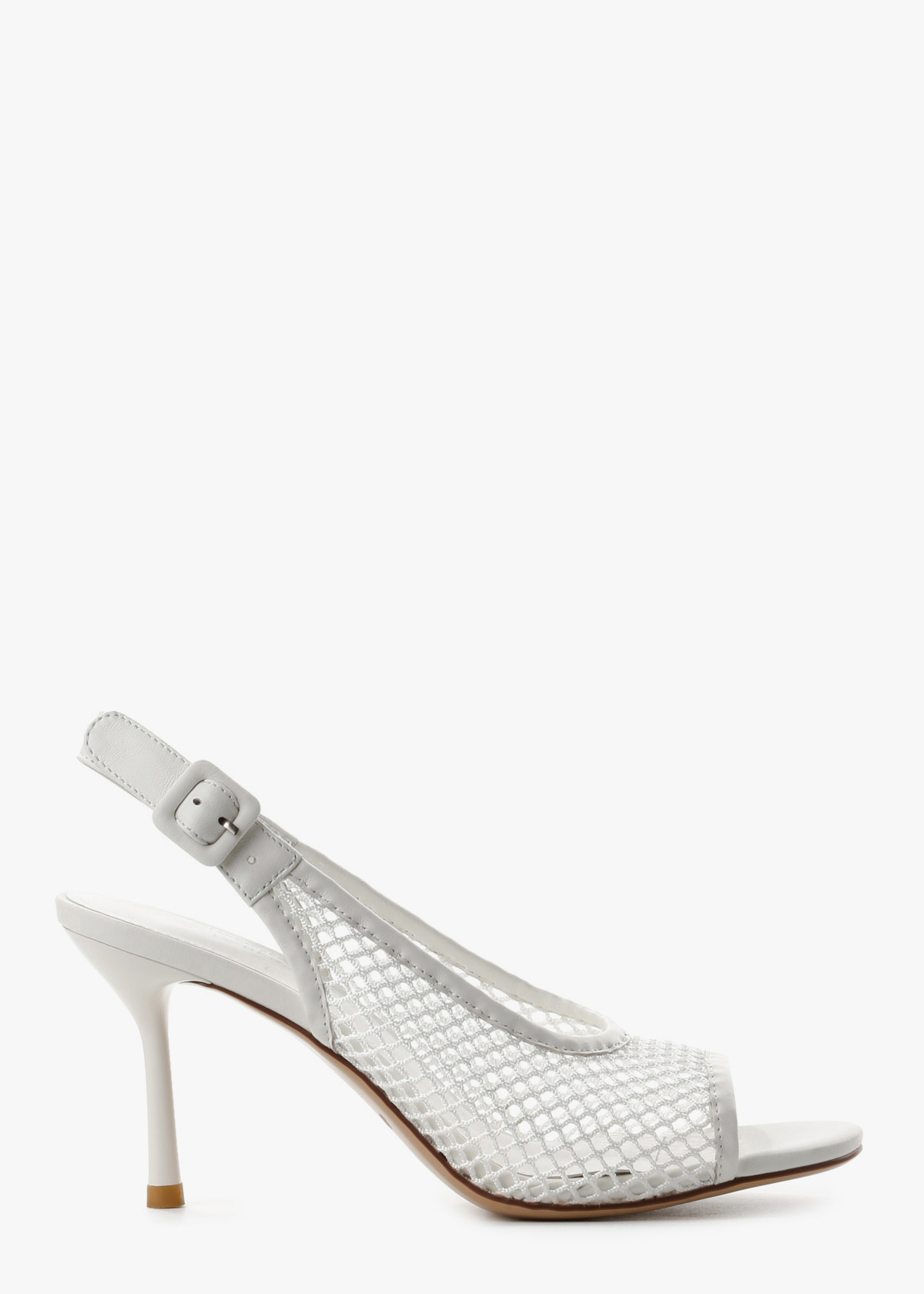Жіночі босоніжки у холодному білому кольорі поєднують у собі елементи класики та сучасних трендів. Модель виконана з комбінації натуральної шкіри та великої текстильної сітки, що надає виробу особливої легкості та забезпечує ідеальну повітропроникність. Відкритий мис та ремінець із масивною обтяжною пряжкою на п'яті підкреслюють витонченість ліній стопи. Високий тонкий підбор додає образу вишуканості, роблячи цю пару ідеальним завершенням святкового літнього гардероба.