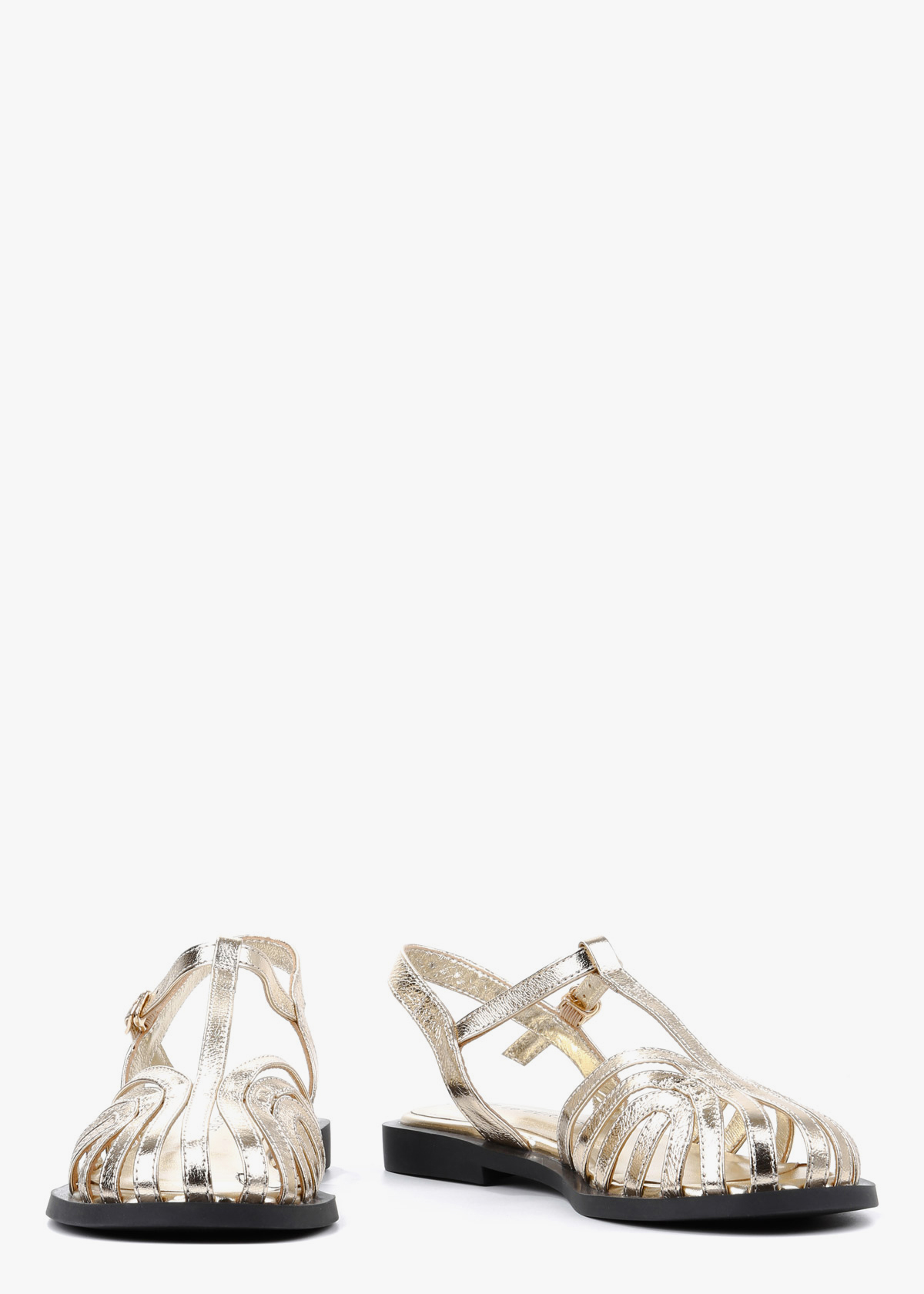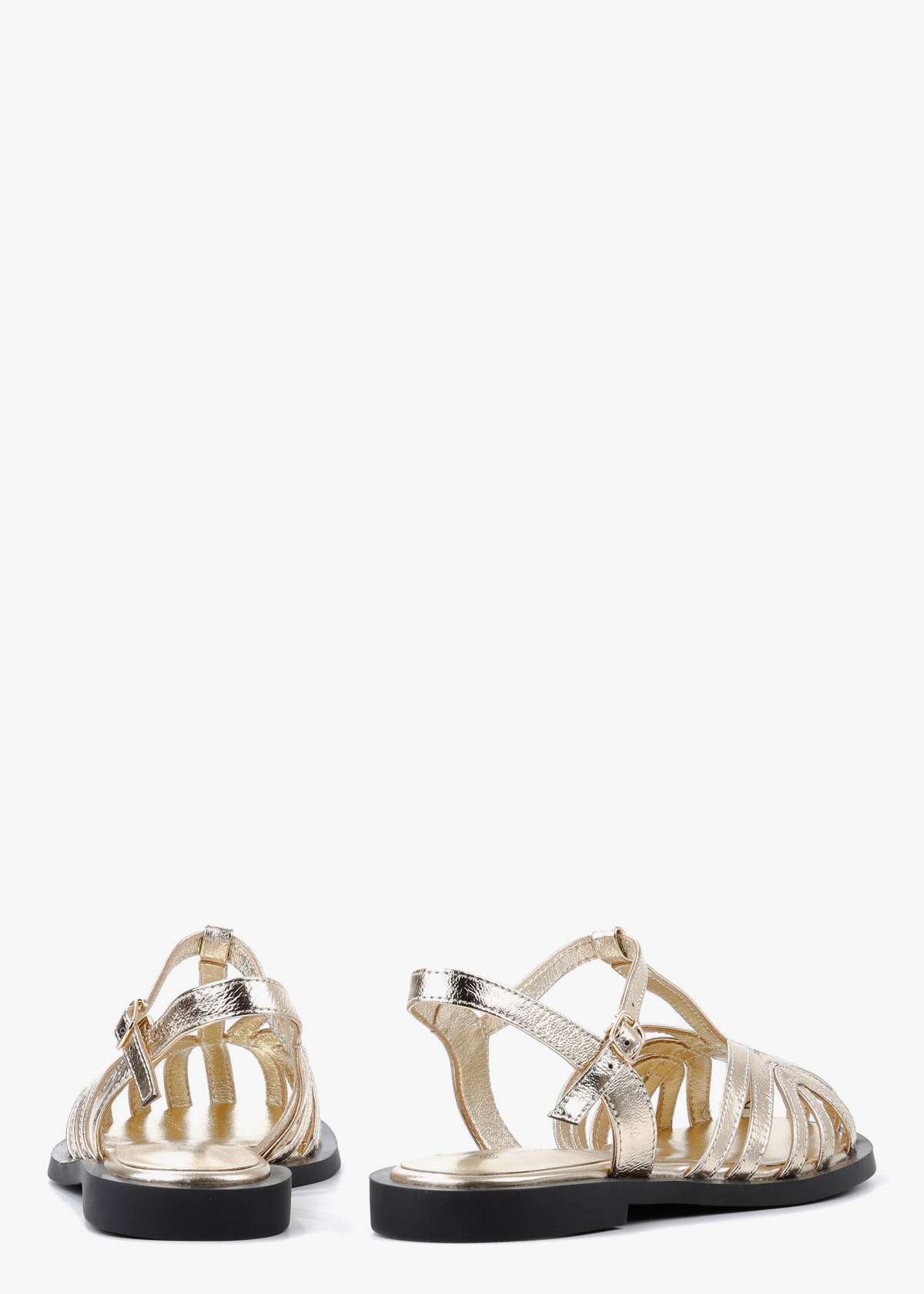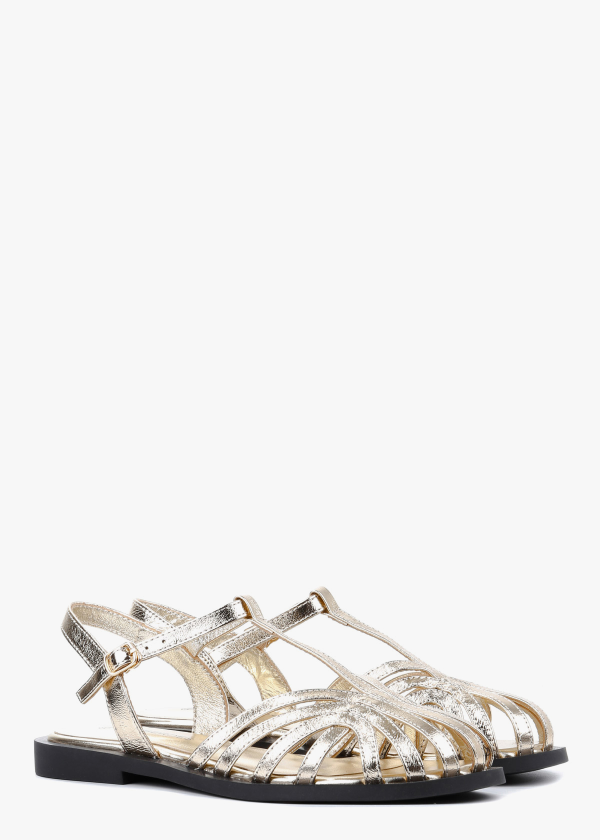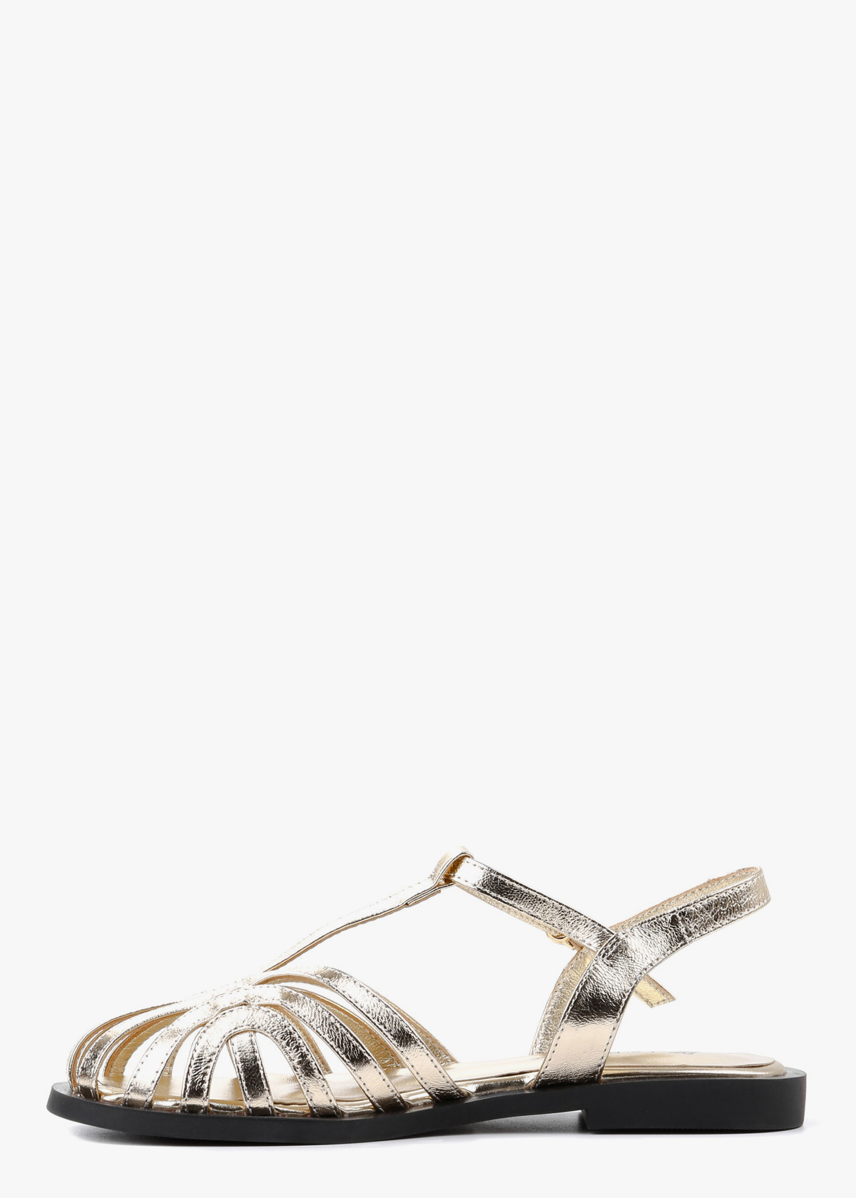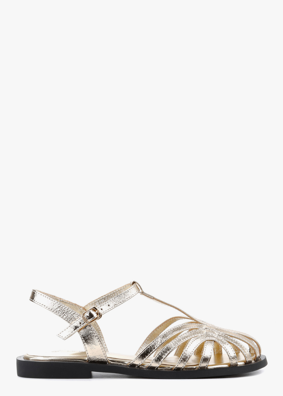 Жіночі босоніжки золотого кольору виконані з натуральної шкіри та мають лаконічний, стриманий дизайн. Один регульований ремінець із застібкою дозволяє підлаштувати посадку під себе й добре фіксує стопу. Плоска підошва забезпечує природний крок, а в носінні модель відчувається легкою та зручною протягом усього дня.