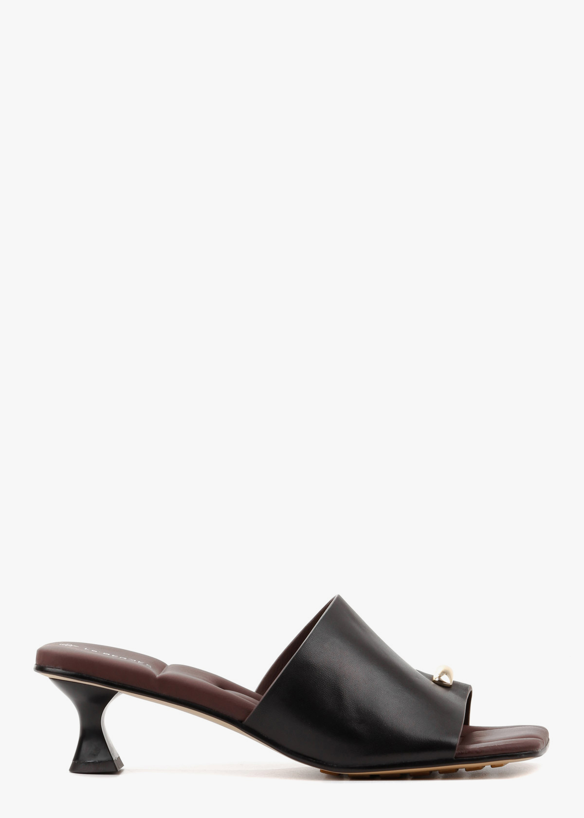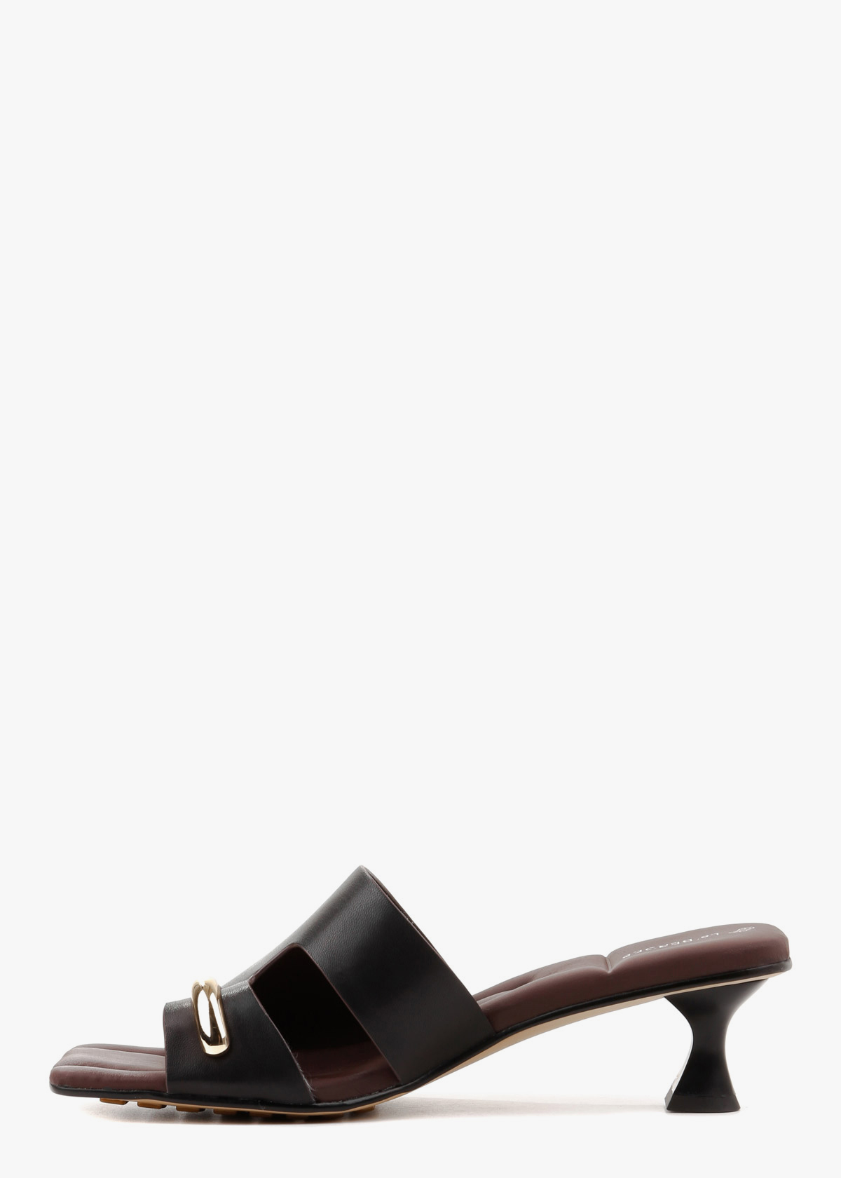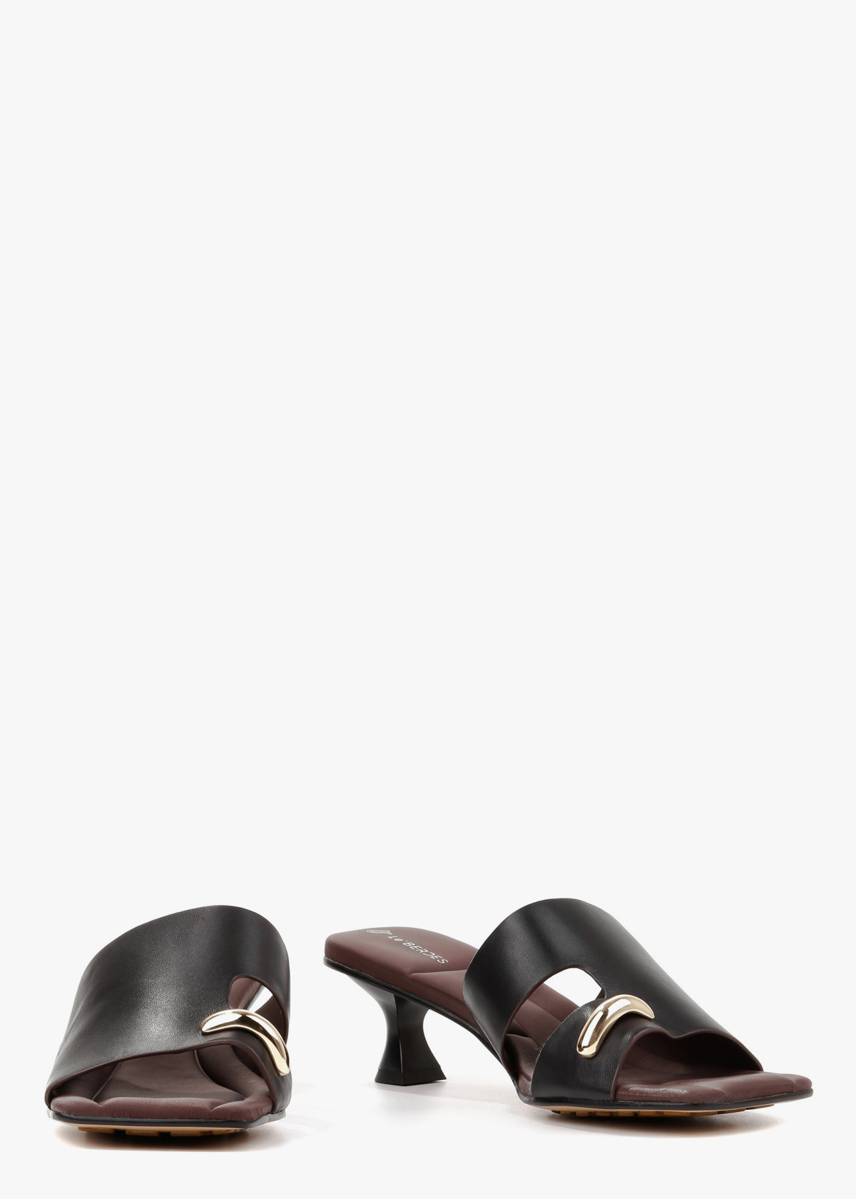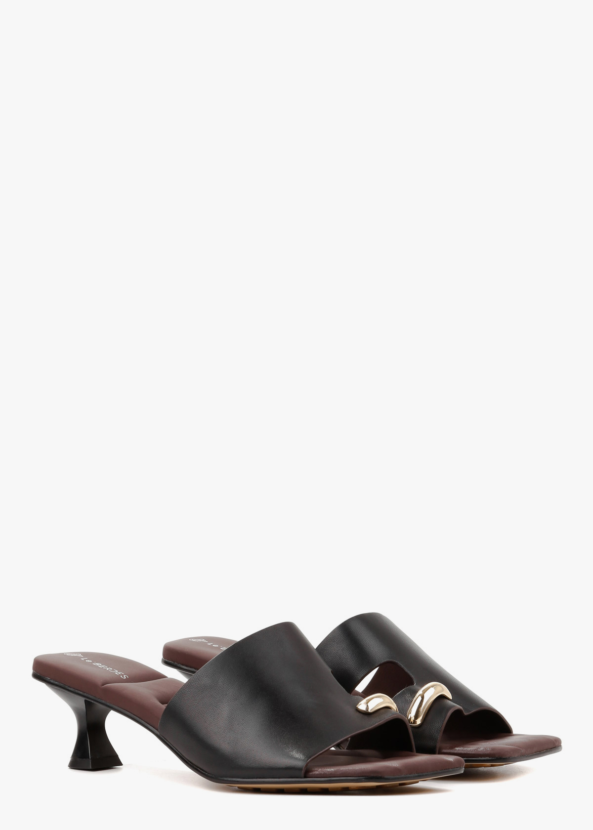 Жіночі шльопанці чорного кольору з елегантним квадратним мисом і невисоким каблуком, виготовлені з натуральної шкіри. Стильний золотий аксесуар додає виробу вишуканості та робить образ більш елегантним. Підошва виконана з м’якої, трохи «дутової» шкіри, що забезпечує неймовірний комфорт під час ходьби, даруючи відчуття легкості та зручності протягом усього дня. Ідеальний вибір для щоденного носіння або витонченого літнього образу.