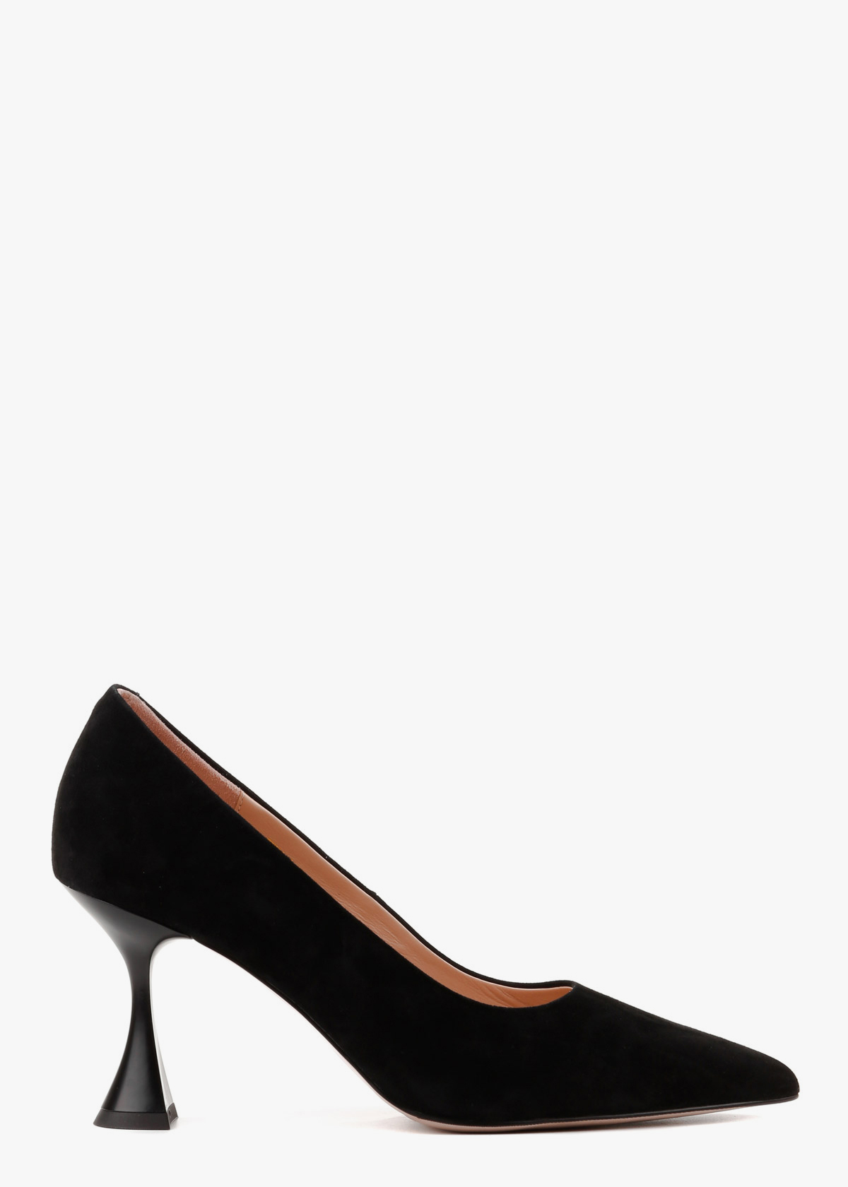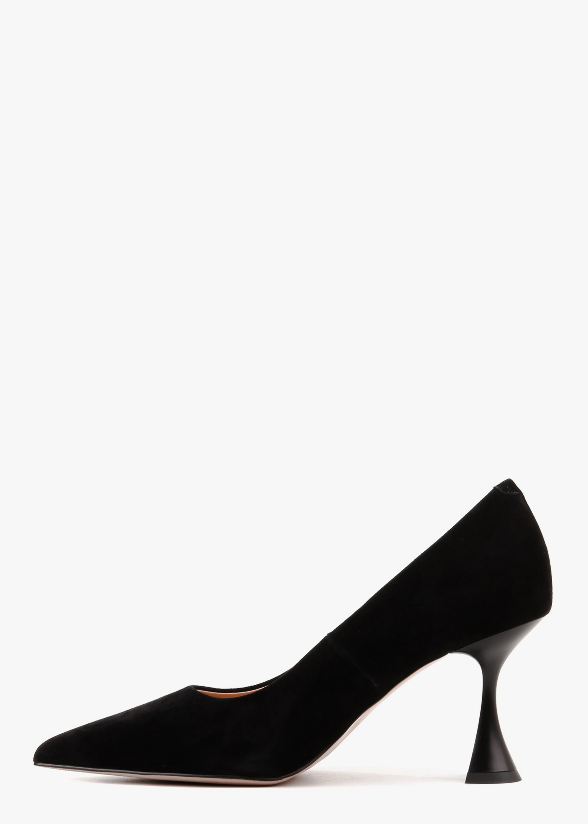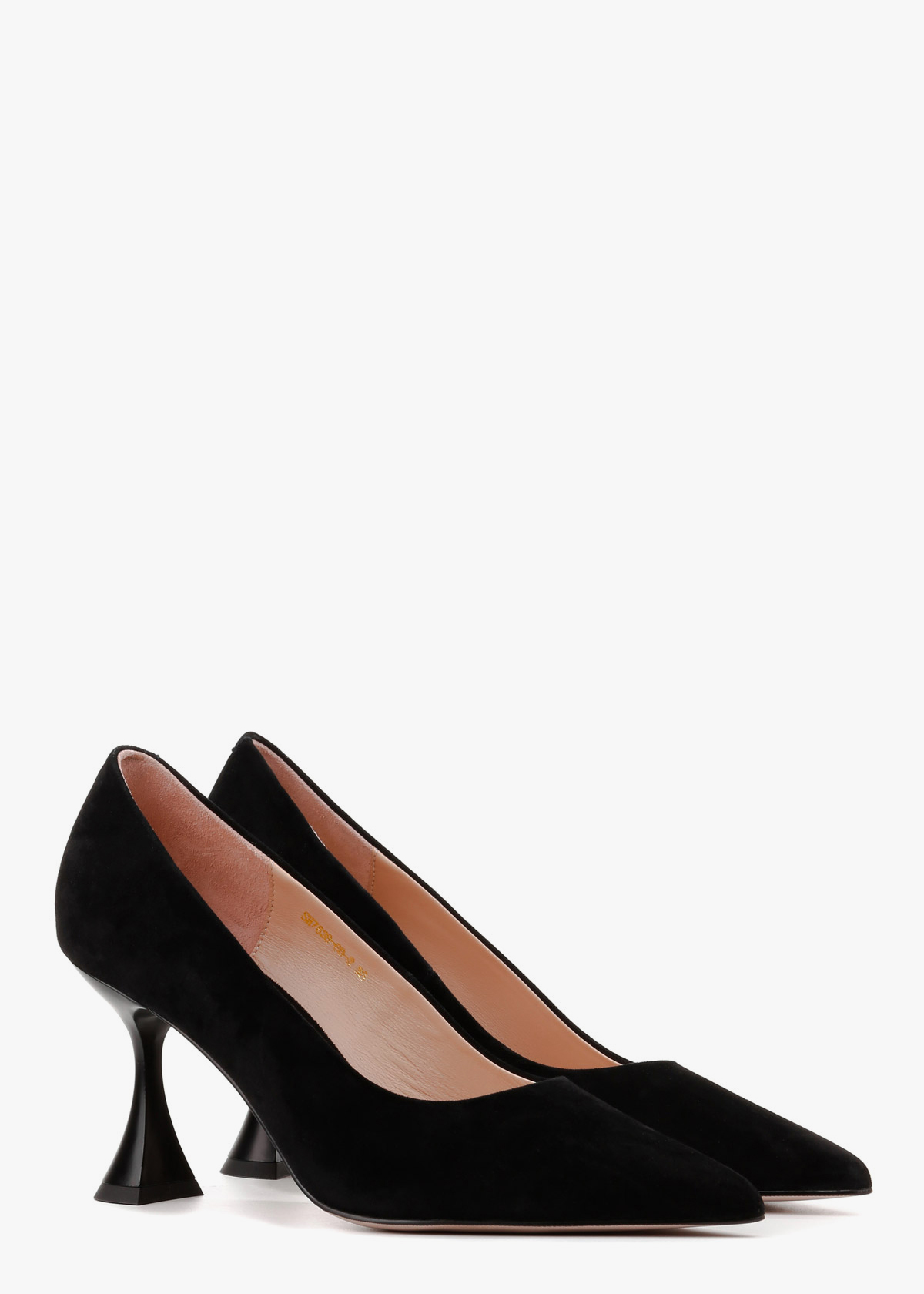 Жіночі туфлі-човники чорного кольору з натуральної замші — елегантна модель із витягнутим носком та акуратним вирізом. М’який замшевий верх має приємну текстуру та комфортно сідає по нозі. Каблук розширюється донизу, що забезпечує кращу стійкість і впевненість під час ходьби. Модель зручна, добре тримає стопу та підходить для тривалого носіння.