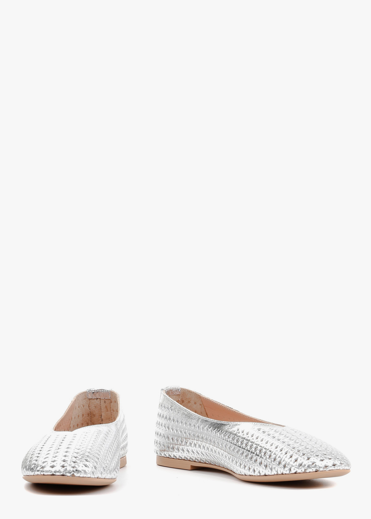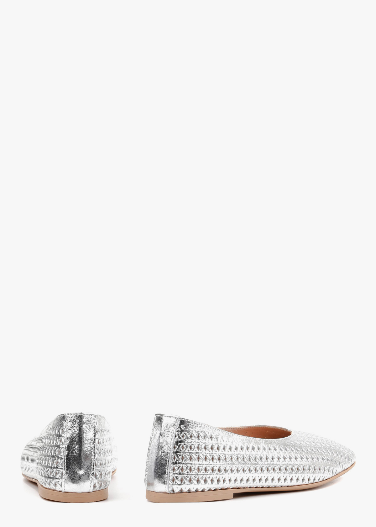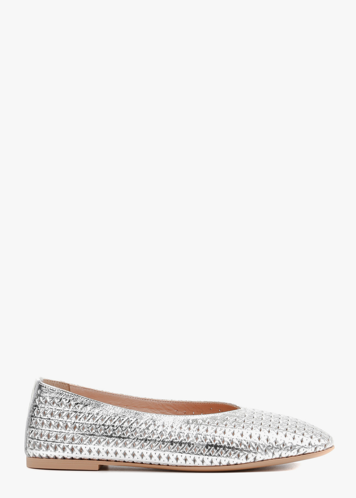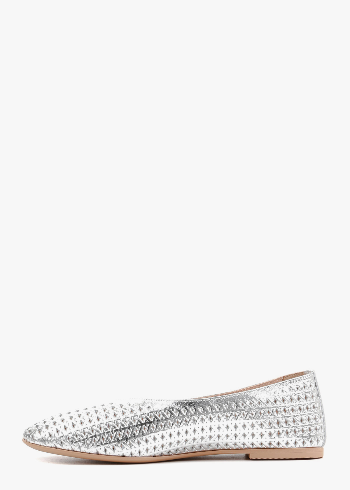 Жіночі шкіряні балетки срібного кольору з перфорацією по всій поверхні, що надає виробу легкості та елегантності. Високоякісна натуральна шкіра забезпечує комфорт та приємні відчуття під час носіння, а витончений дизайн робить балетки універсальним варіантом як для щоденного стилю, так і для святкових образів.