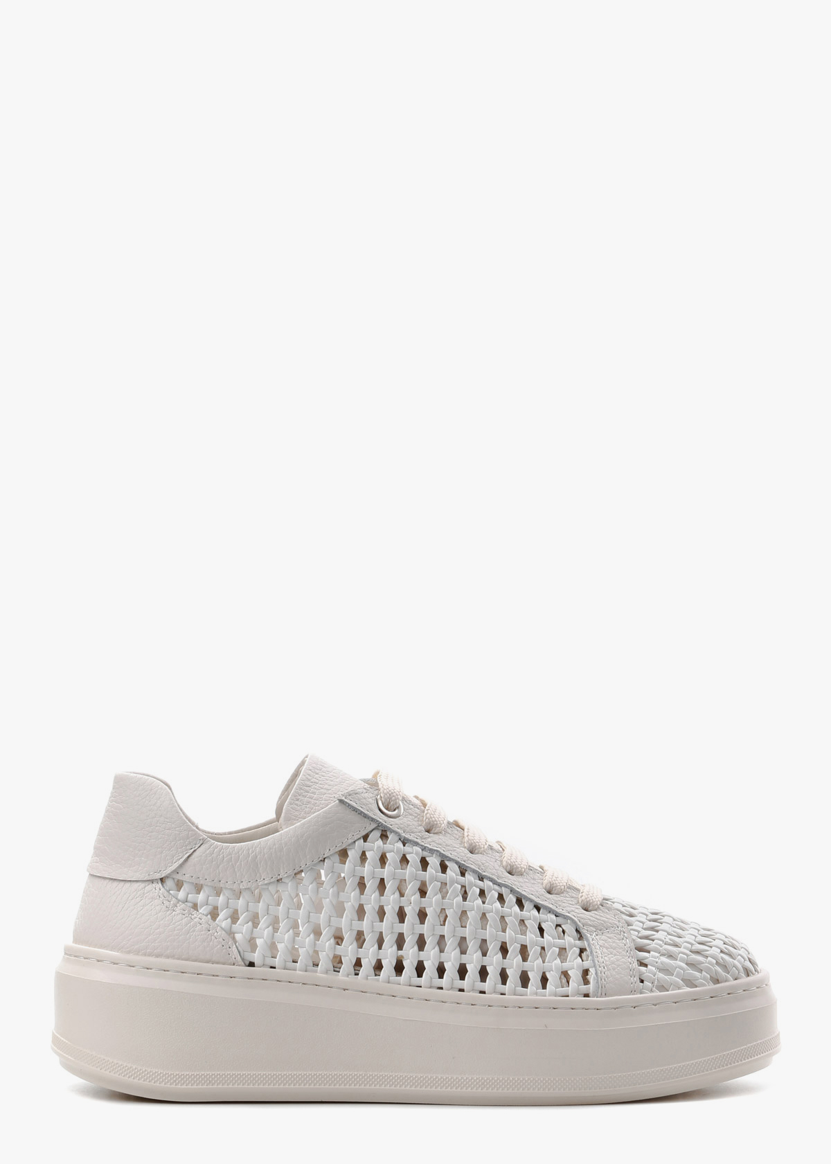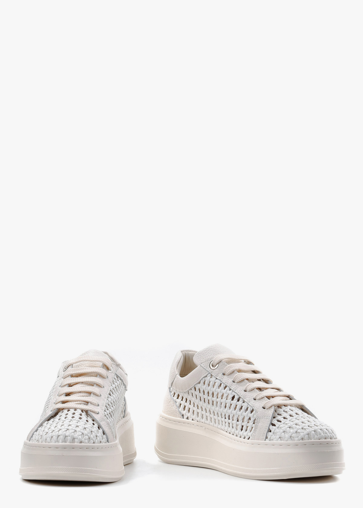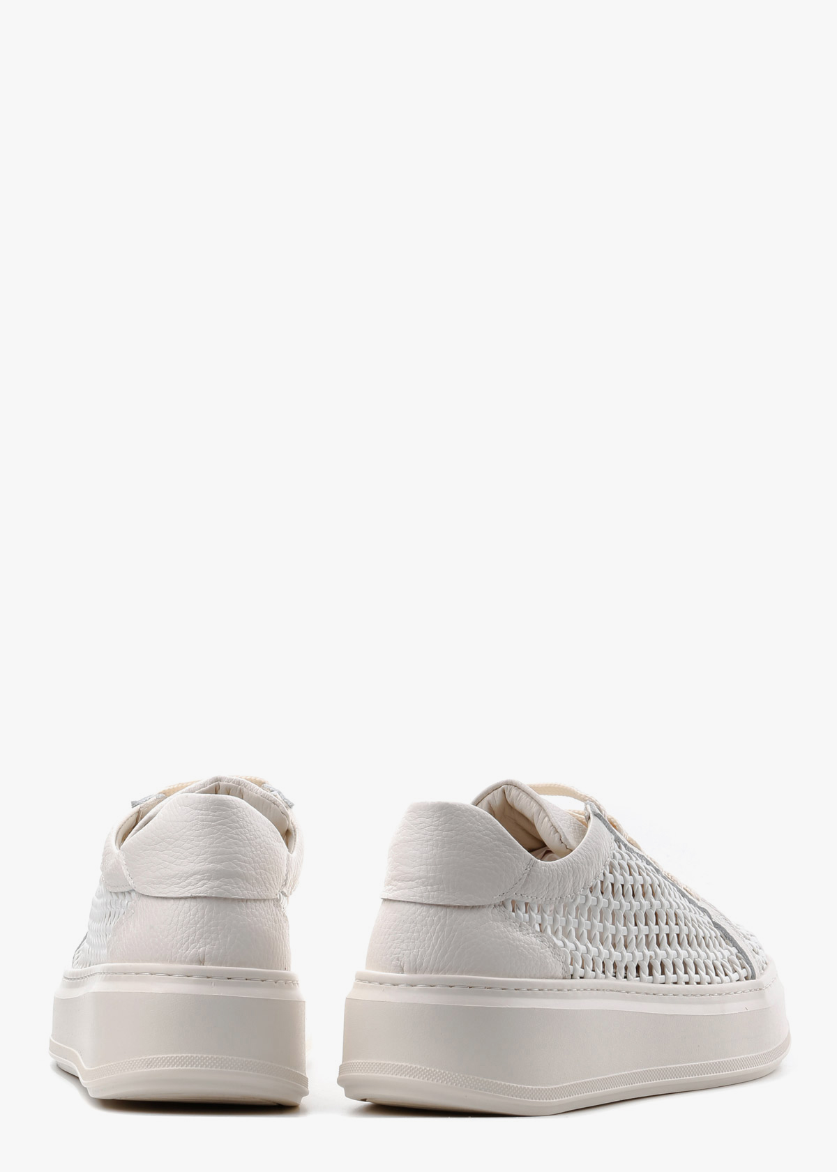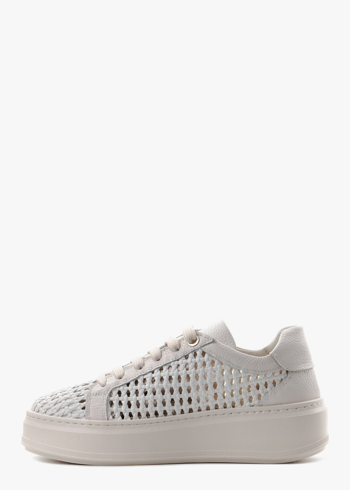 Жіночі кеди на високій платформі у молочному відтінку, виготовлені з натуральної шкіри. Основна частина моделі виконана з майстерного шкіряного плетіння, що створює ефектну перфорацію та забезпечує чудову циркуляцію повітря. Масивна рівна підошва в тон верху додає парі сучасного вигляду та комфорту, роблячи ці кеди стильним акцентом літнього образу.