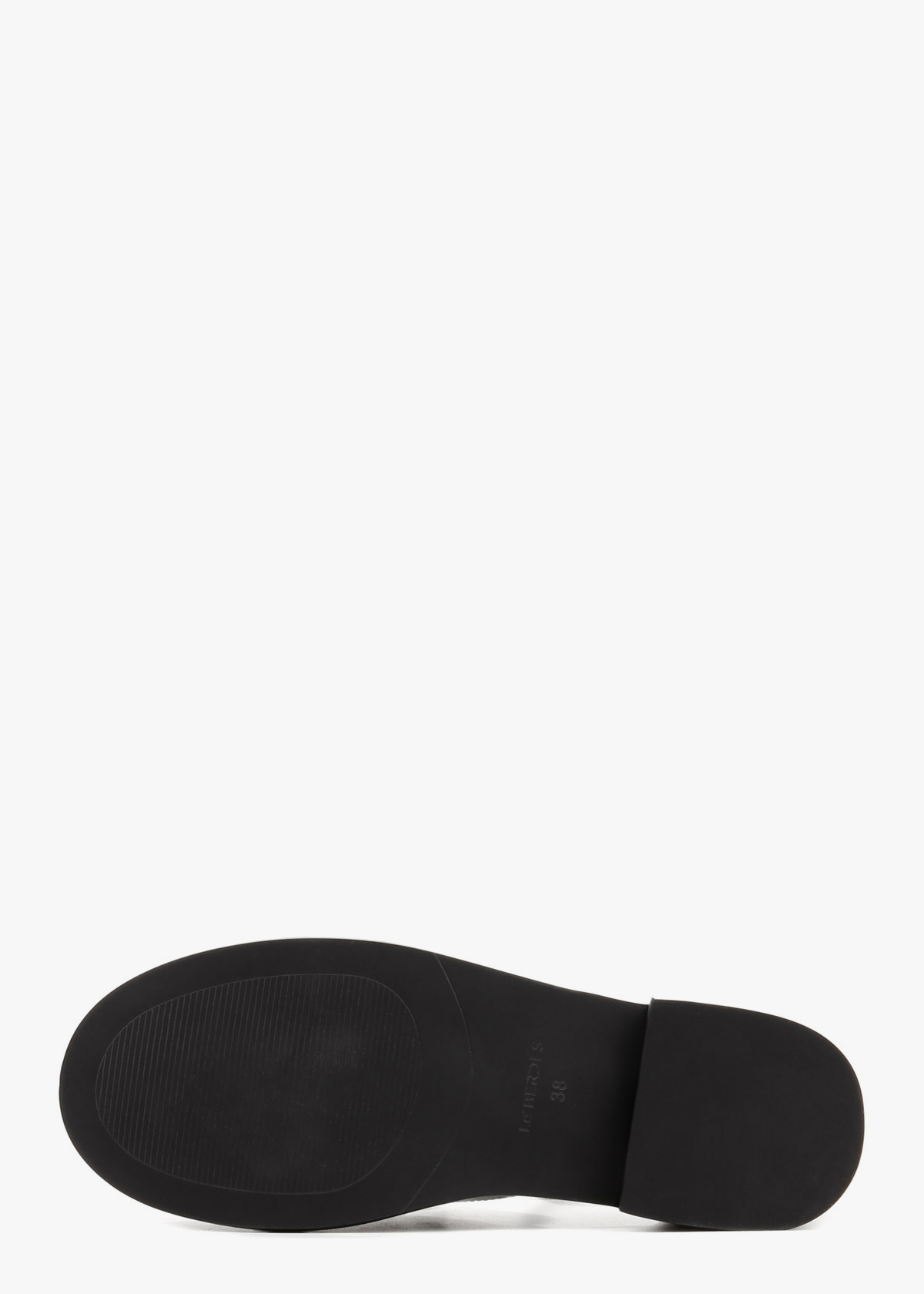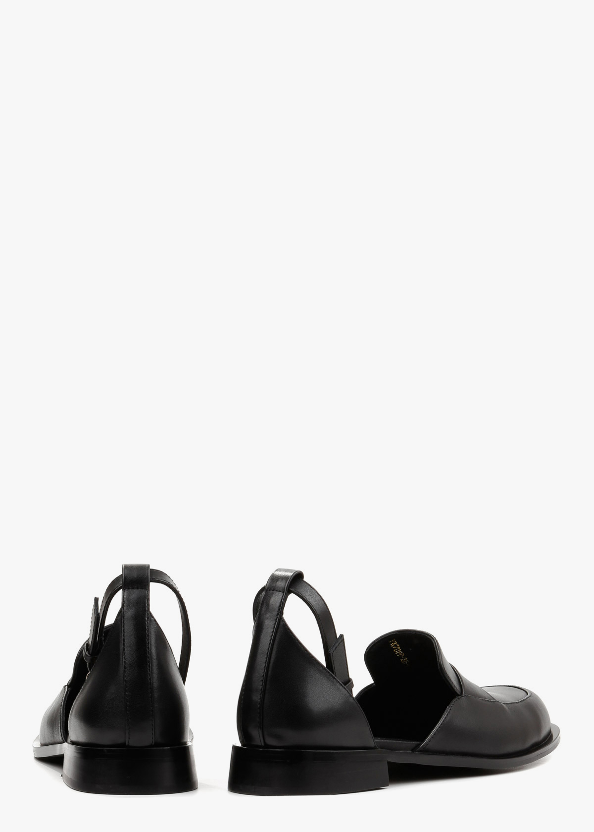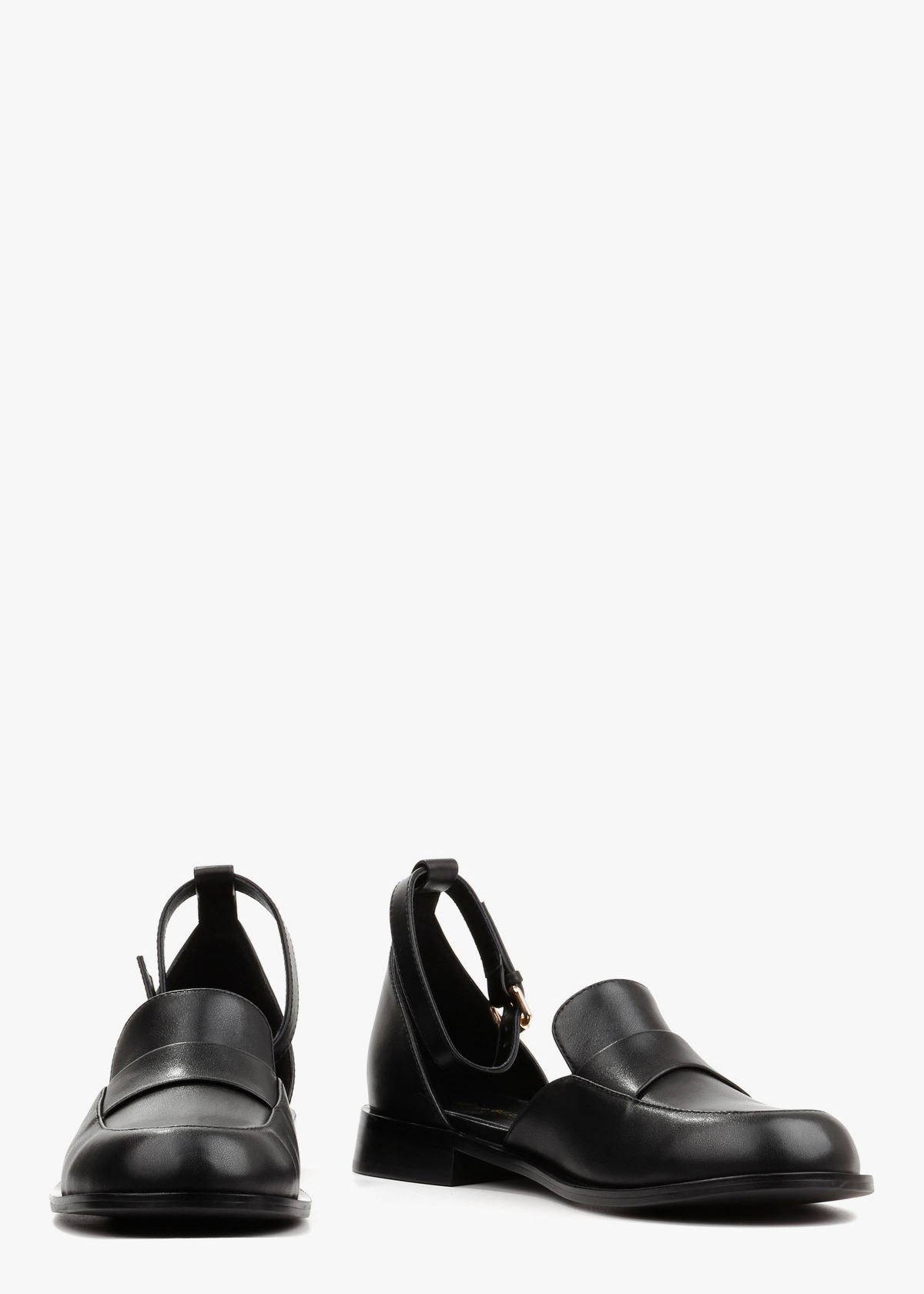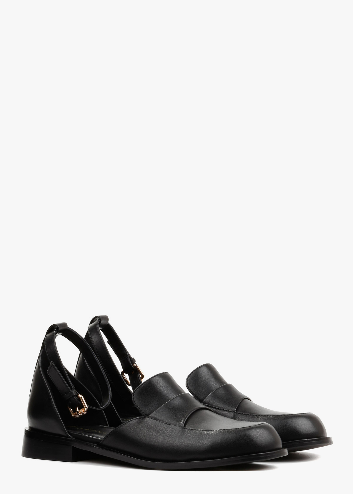 Жіночі туфлі з відкритими боковими частинами, виконані з гладкої натуральної шкіри чорного кольору. Модель поєднує в собі елементи класичних лоферів із характерним швом на мисі та витончений ремінець навколо щиколотки з золотистою пряжкою. Невисокий стійкий каблук та м'яка устілка з логотипом бренду забезпечують комфорт, роблячи цю пару ідеальним варіантом для стильного ділового або повсякденного гардероба.