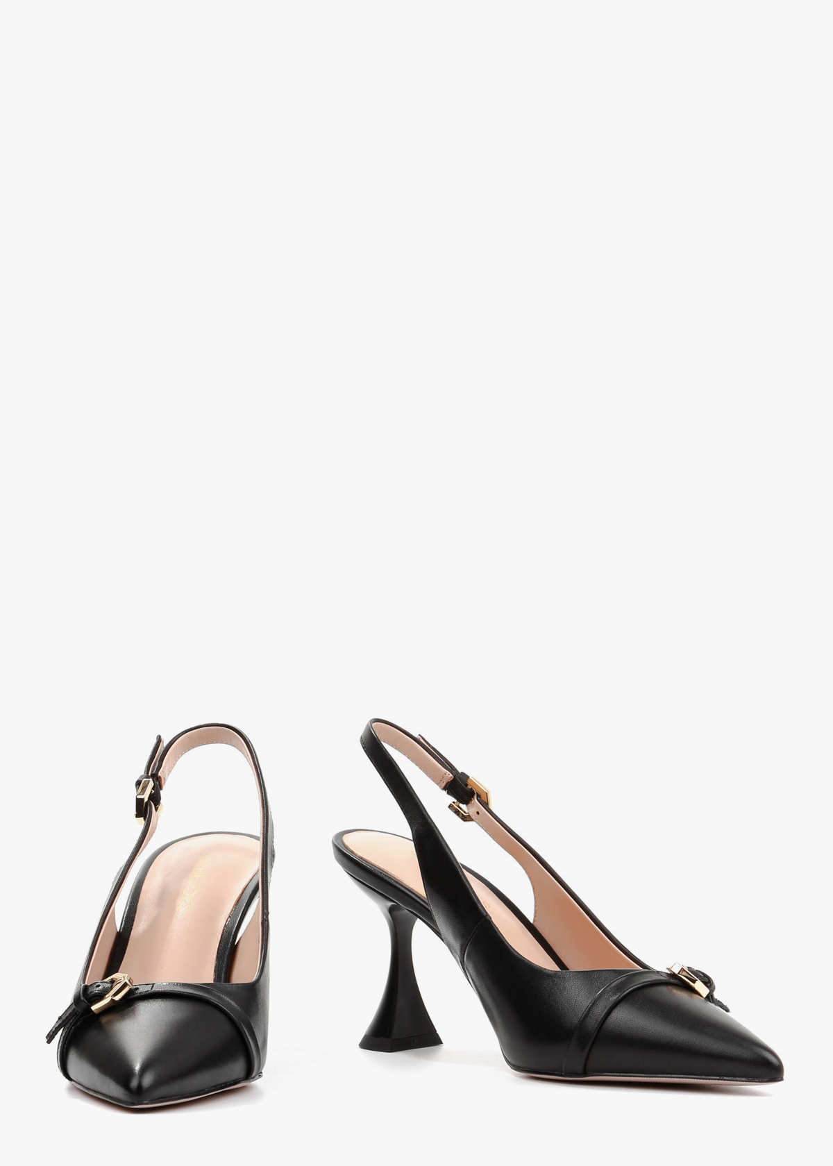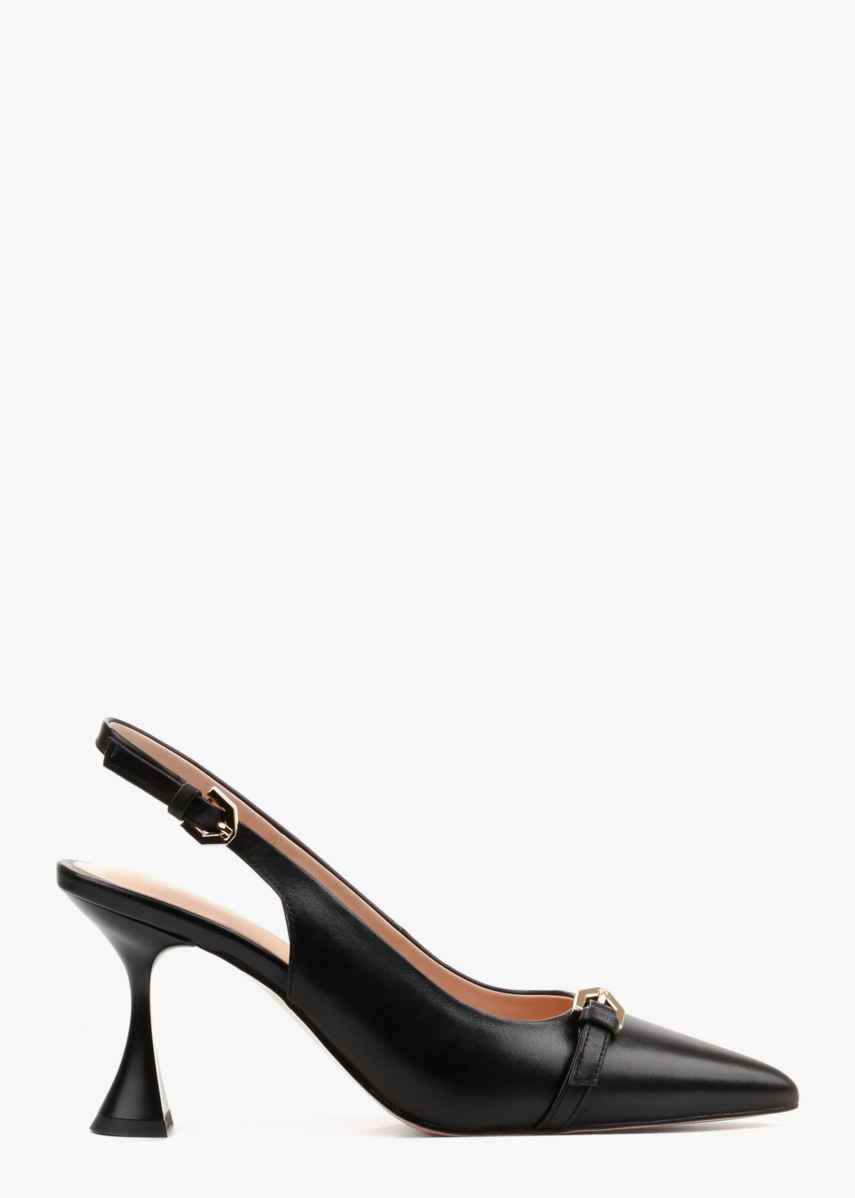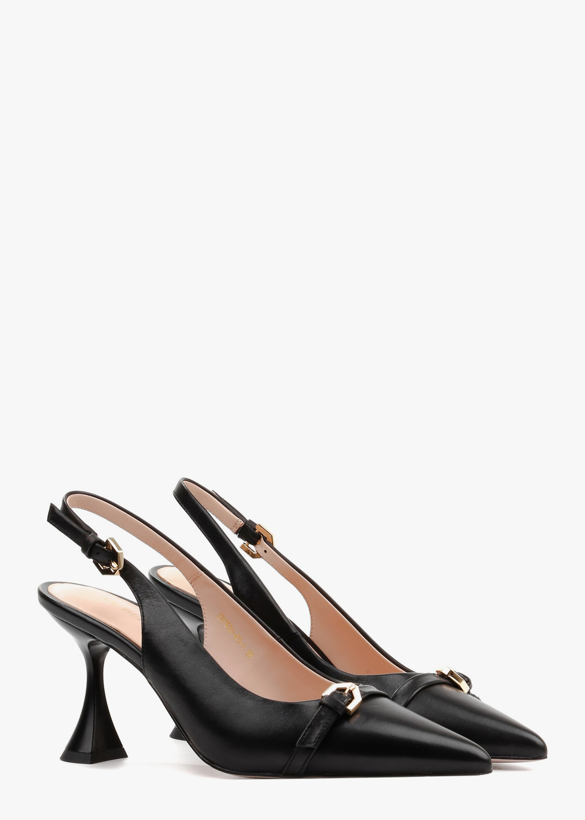 Чорні шкіряні сабо з елегантним загостреним мисом, декорованим тонким ремінцем у тон і золотою фурнітурою, яка додає виробу витонченості. Каблук сабо розширюється до низу, що забезпечує стійкість і комфорт при ходьбі. Високоякісна натуральна шкіра робить виріб приємним на дотик і довговічним, а продумана конструкція каблука дозволяє відчувати легкість і впевненість протягом усього дня.