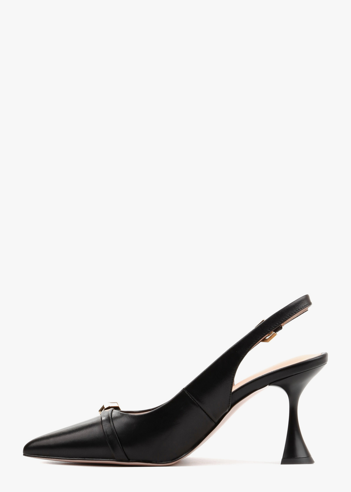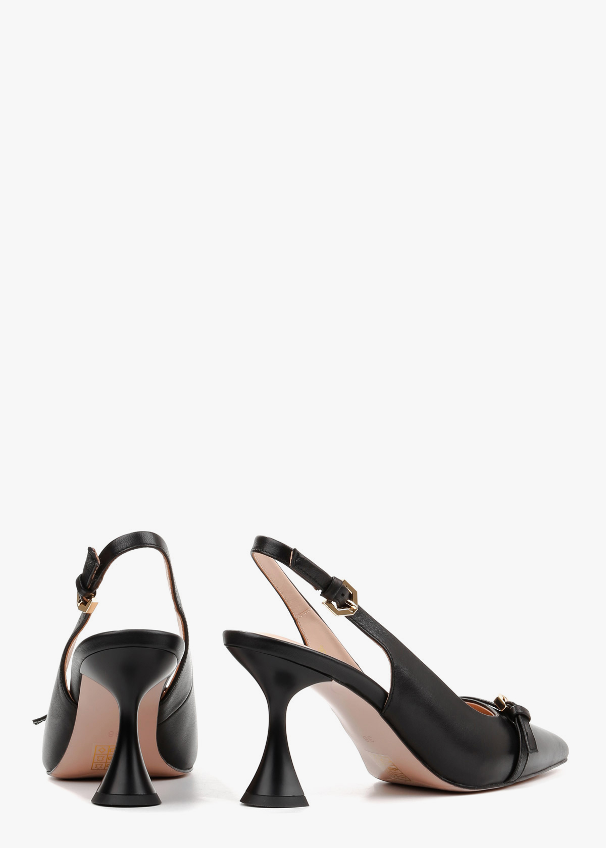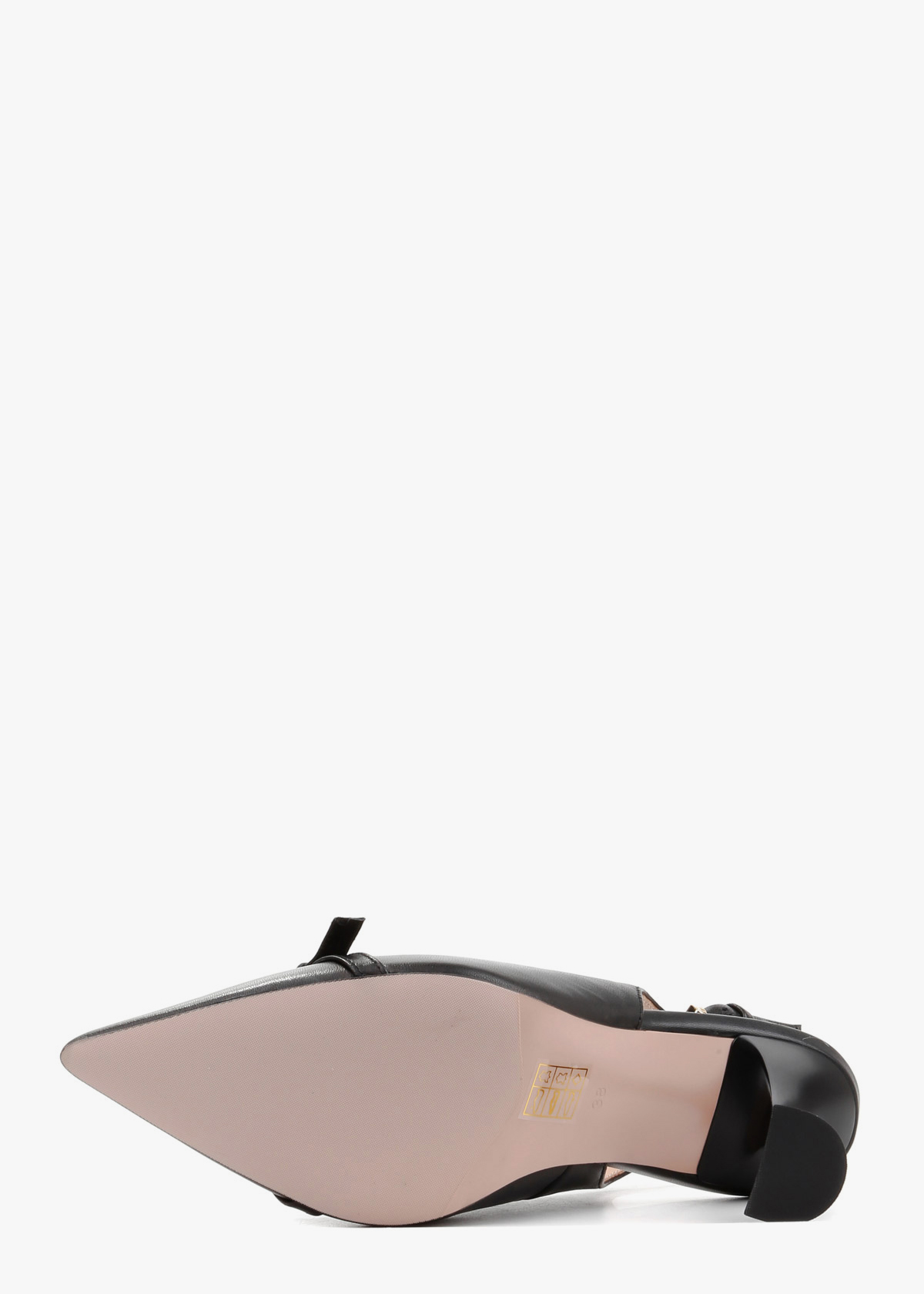 Чорні шкіряні сабо з елегантним загостреним мисом, декорованим тонким ремінцем у тон і золотою фурнітурою, яка додає виробу витонченості. Каблук сабо розширюється до низу, що забезпечує стійкість і комфорт при ходьбі. Високоякісна натуральна шкіра робить виріб приємним на дотик і довговічним, а продумана конструкція каблука дозволяє відчувати легкість і впевненість протягом усього дня.