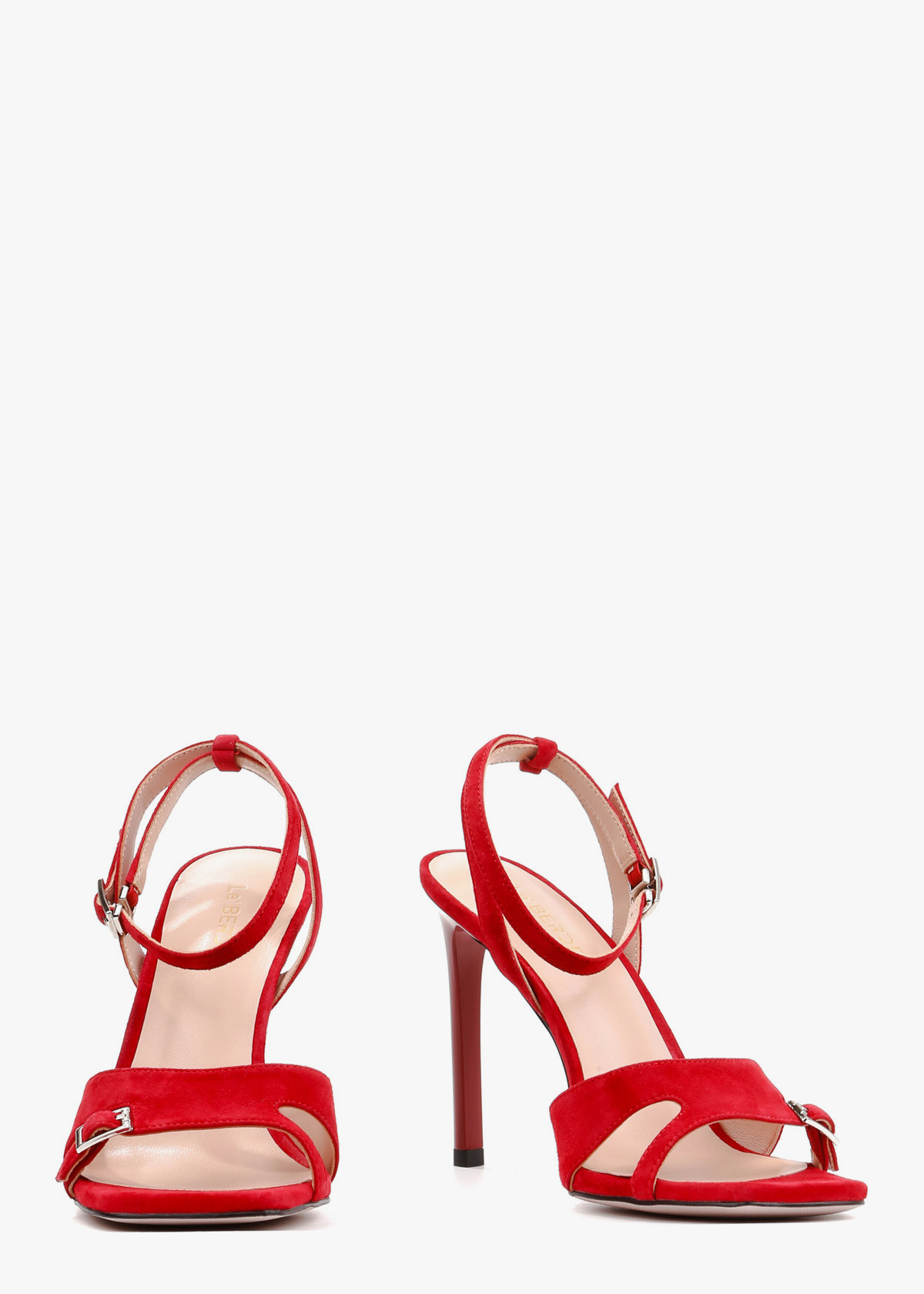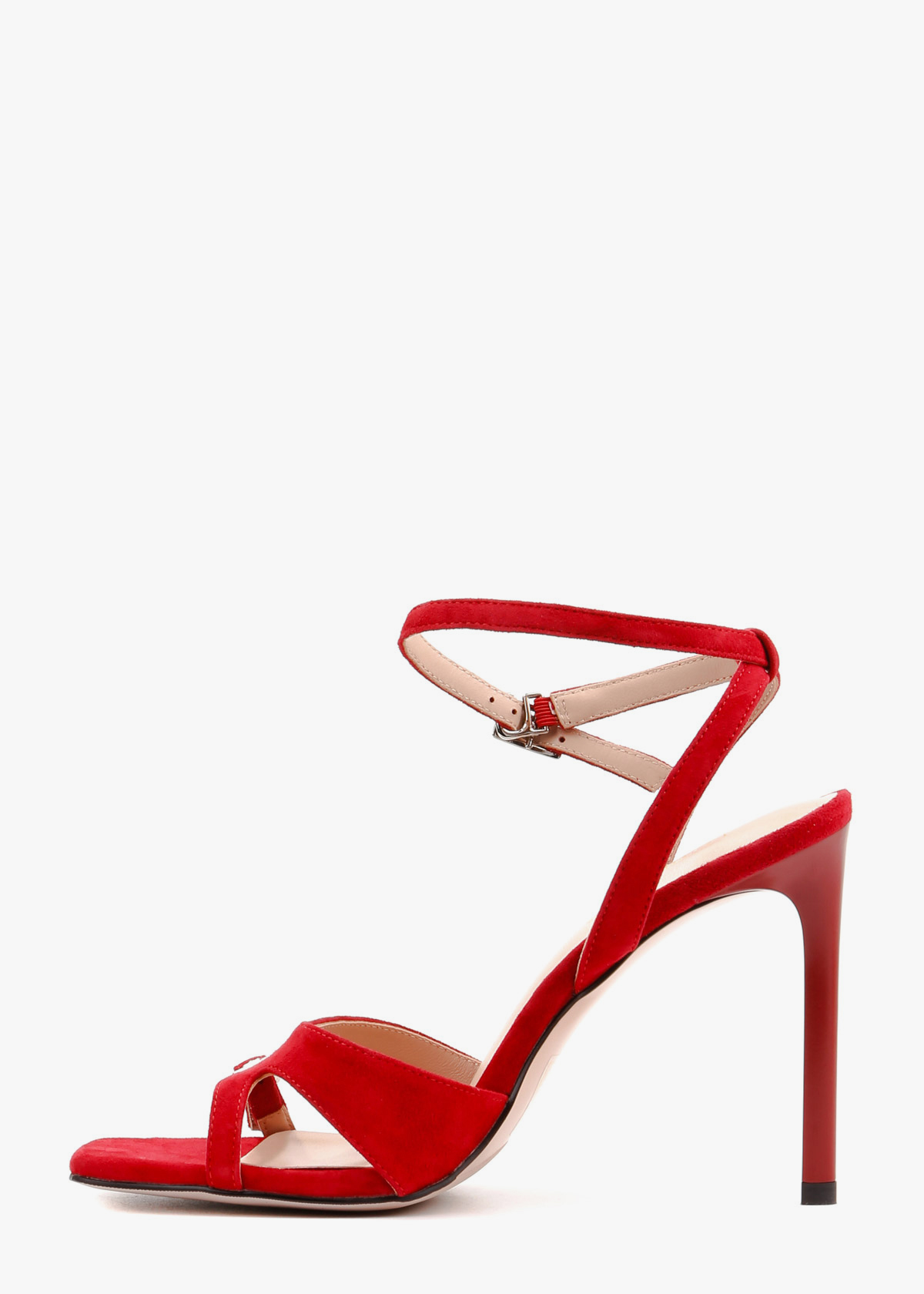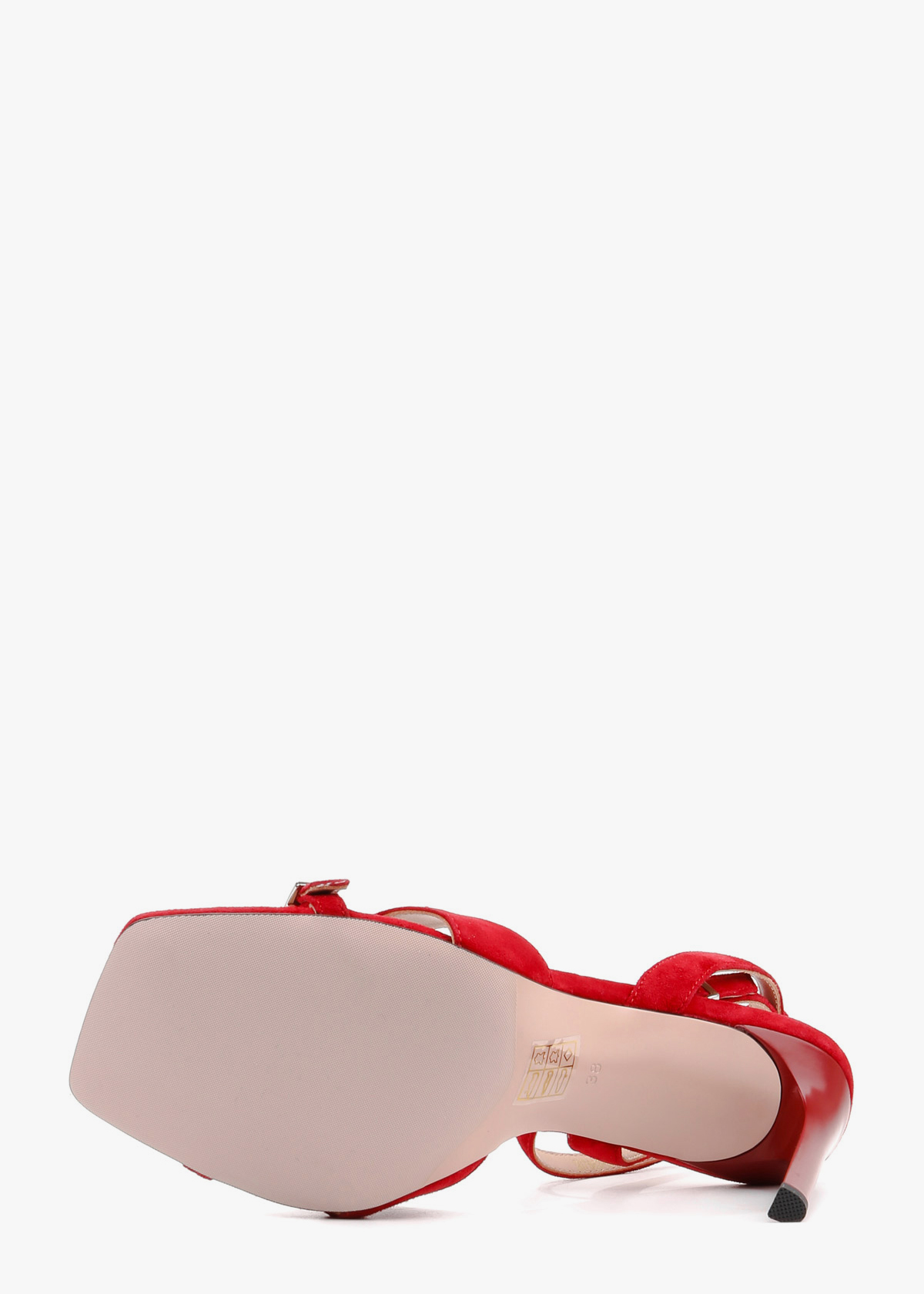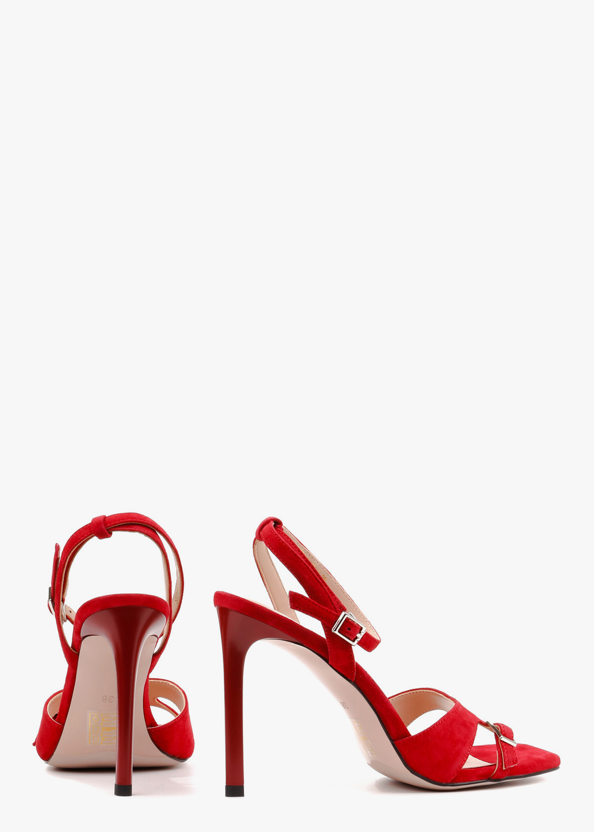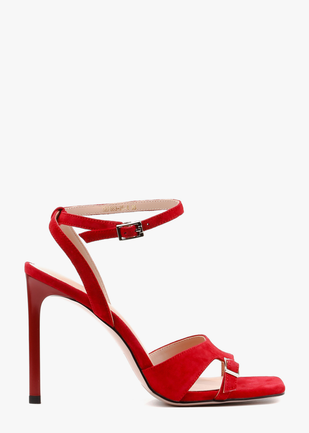 Жіночі босоніжки червоного кольору з натуральної замші — елегантна модель із квадратним носком та відкритою п’ятою. Широкий передній ремінець доповнений невеликою декоративною пряжкою, а тонкий ремінець навколо щиколотки регулюється застібкою. Високий тонкий каблук візуально подовжує силует і підкреслює жіночність. На нозі виглядають витончено, добре фіксуються та підходять для святкових і вечірніх образів.