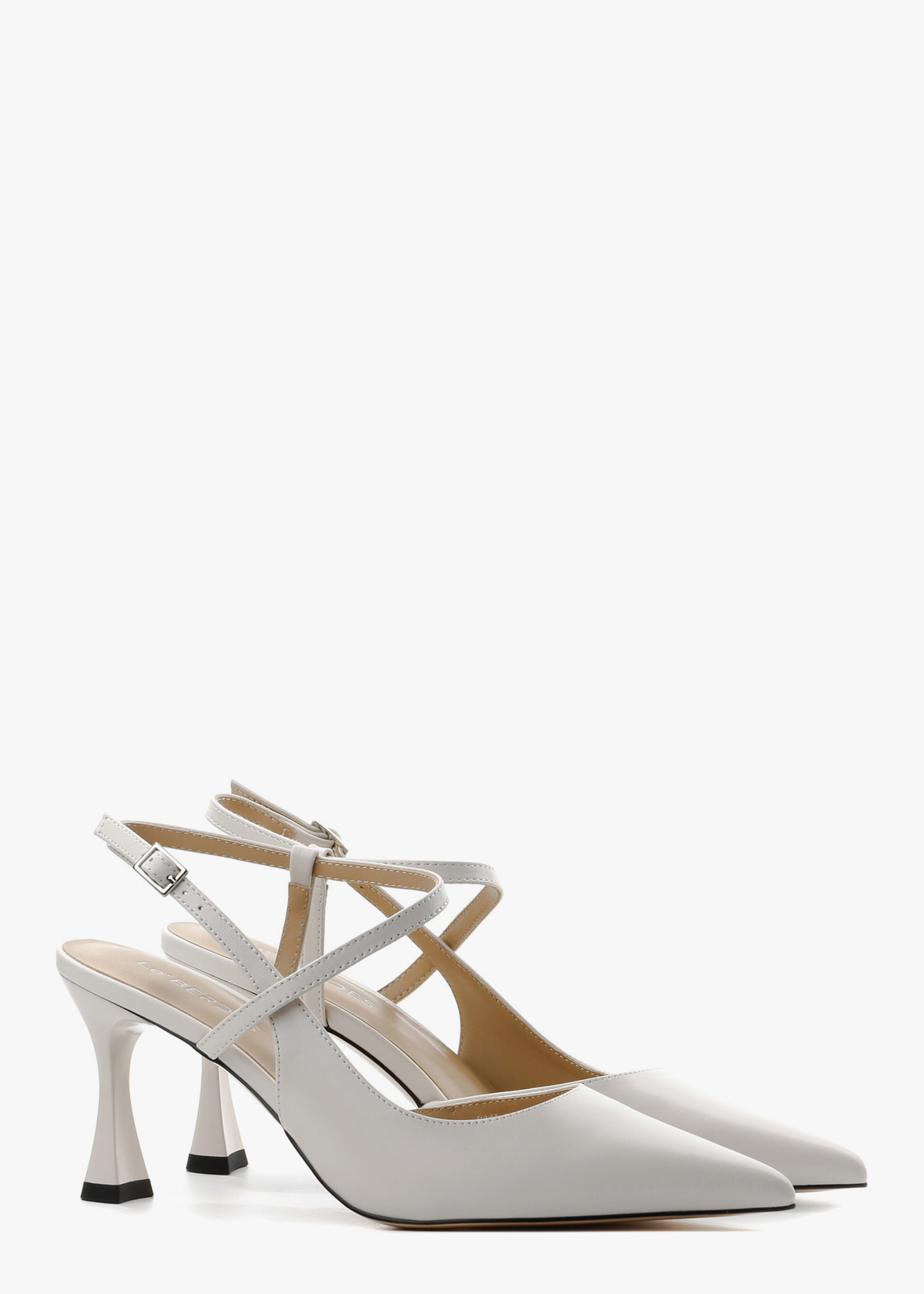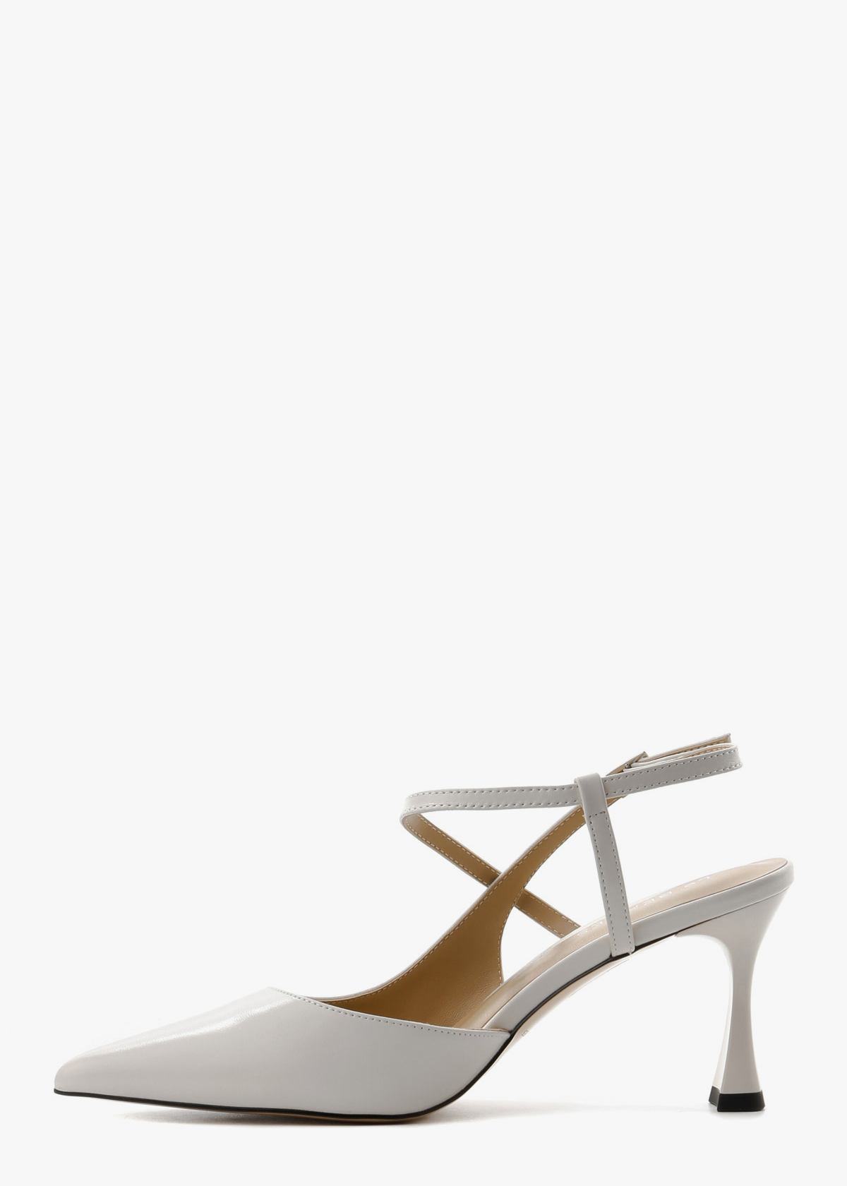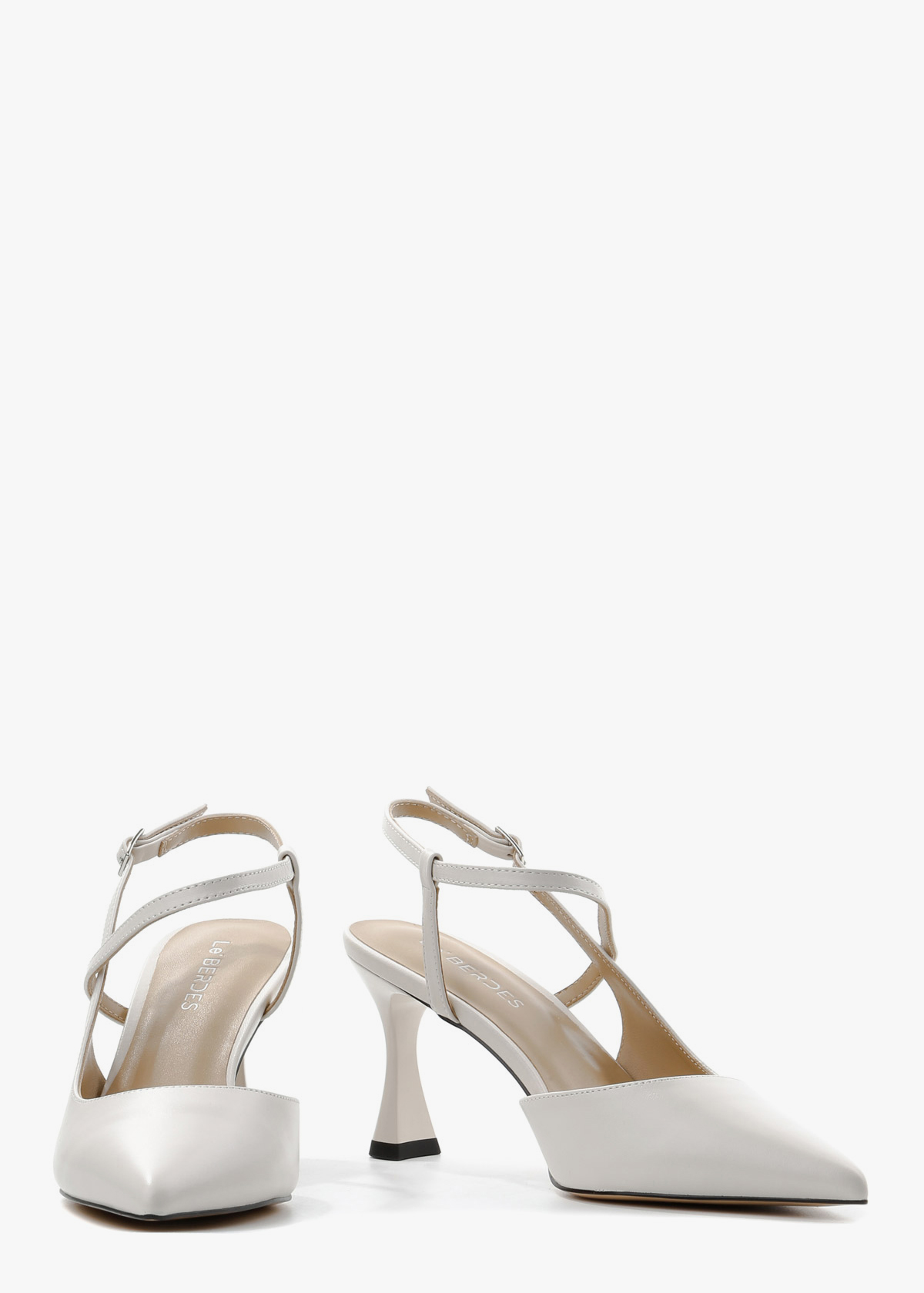 Жіночі сабо у молочно-білому кольорі, виготовлені з гладкої натуральної шкіри. Модель має класичний загострений мис та оригінальну систему тонких ремінців, що елегантно перехрещуються на підйомі та фіксуються на щиколотці. Стійкий фігурний каблук середньої висоти в тон основного матеріалу додає парі сучасної естетики, роблячи ці туфлі ідеальним вибором для святкових подій або літніх ділових зустрічей.