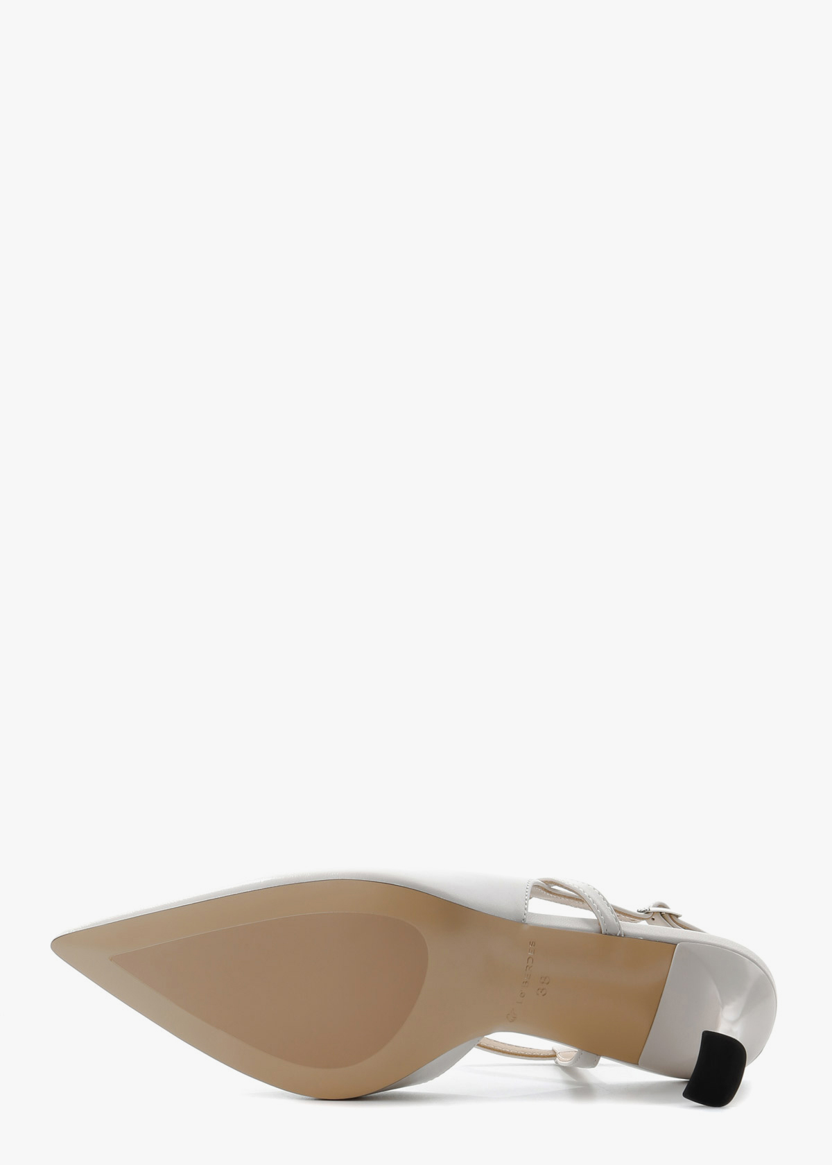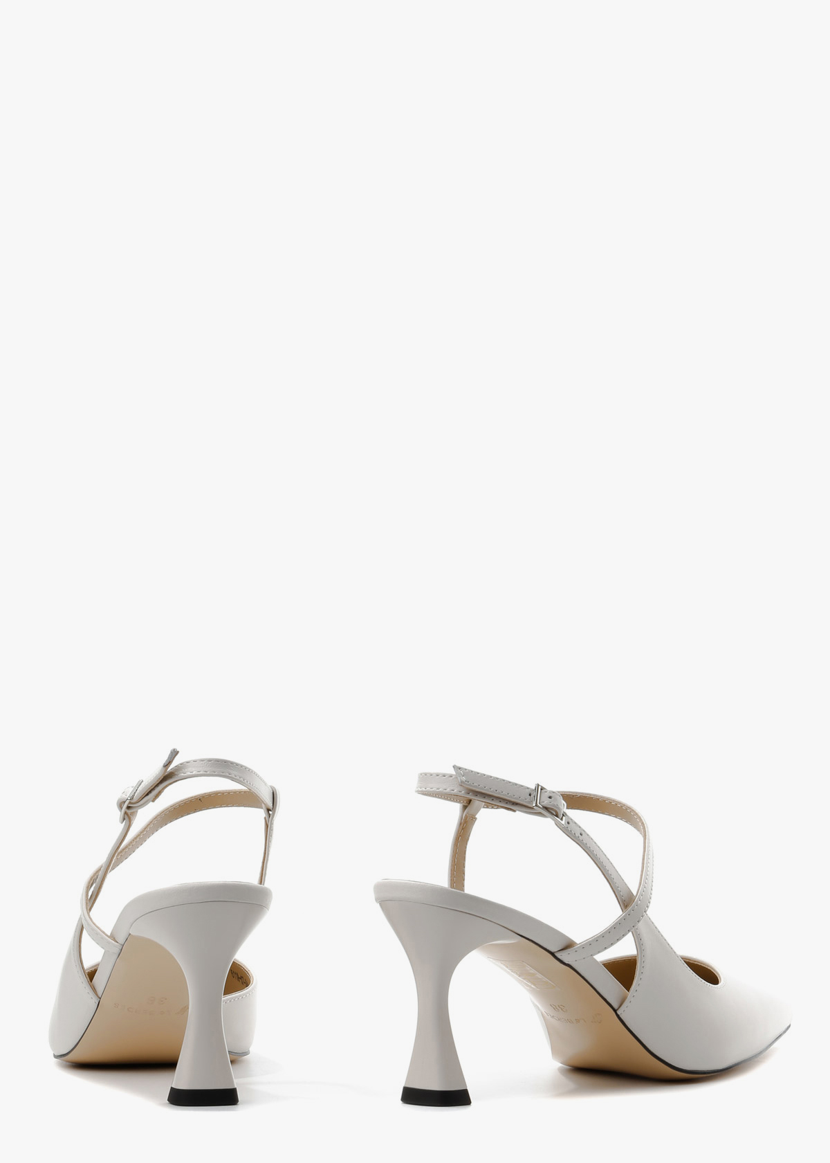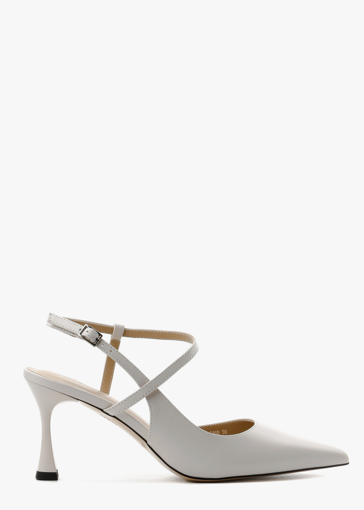 Жіночі сабо у молочно-білому кольорі, виготовлені з гладкої натуральної шкіри. Модель має класичний загострений мис та оригінальну систему тонких ремінців, що елегантно перехрещуються на підйомі та фіксуються на щиколотці. Стійкий фігурний каблук середньої висоти в тон основного матеріалу додає парі сучасної естетики, роблячи ці туфлі ідеальним вибором для святкових подій або літніх ділових зустрічей.