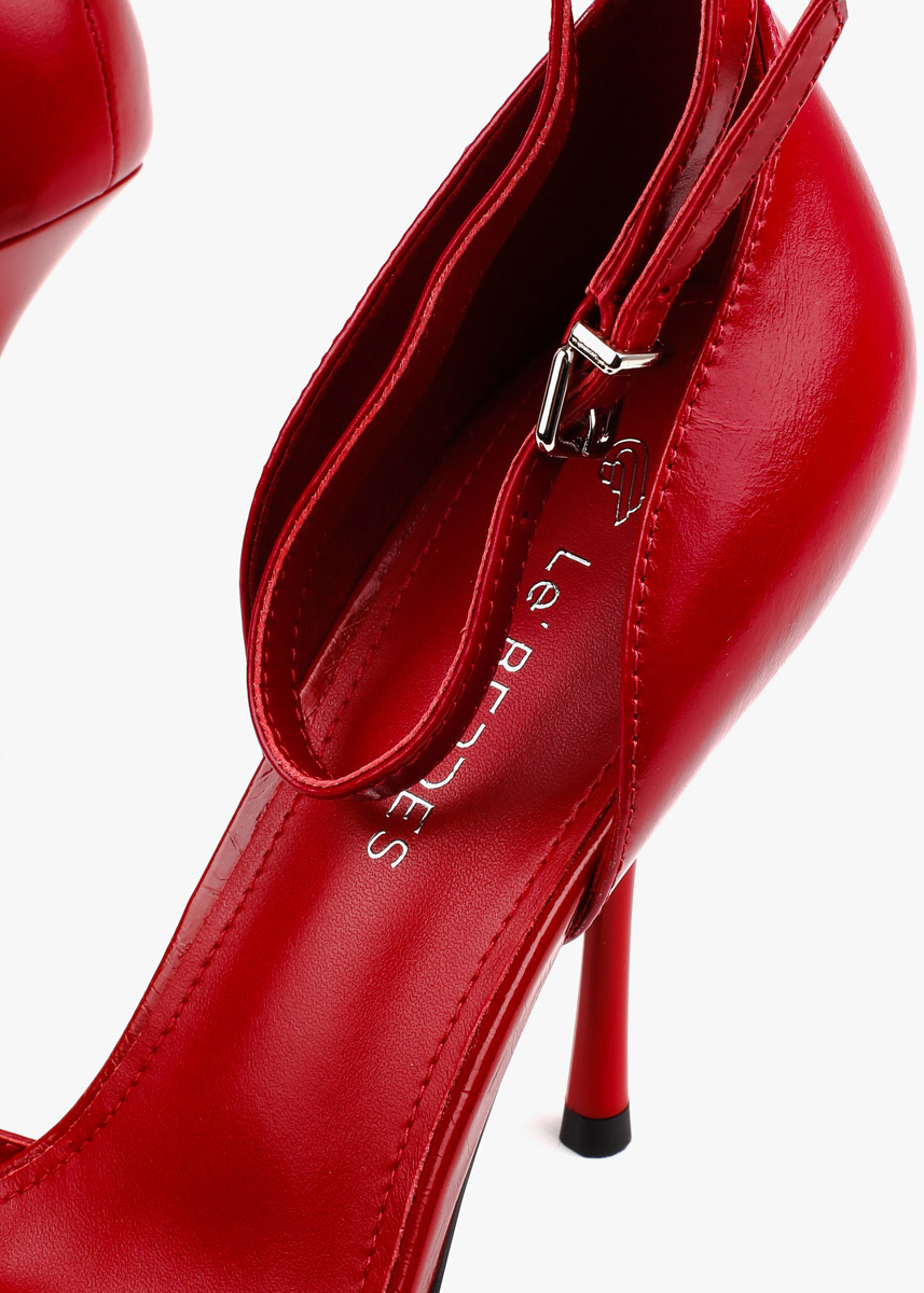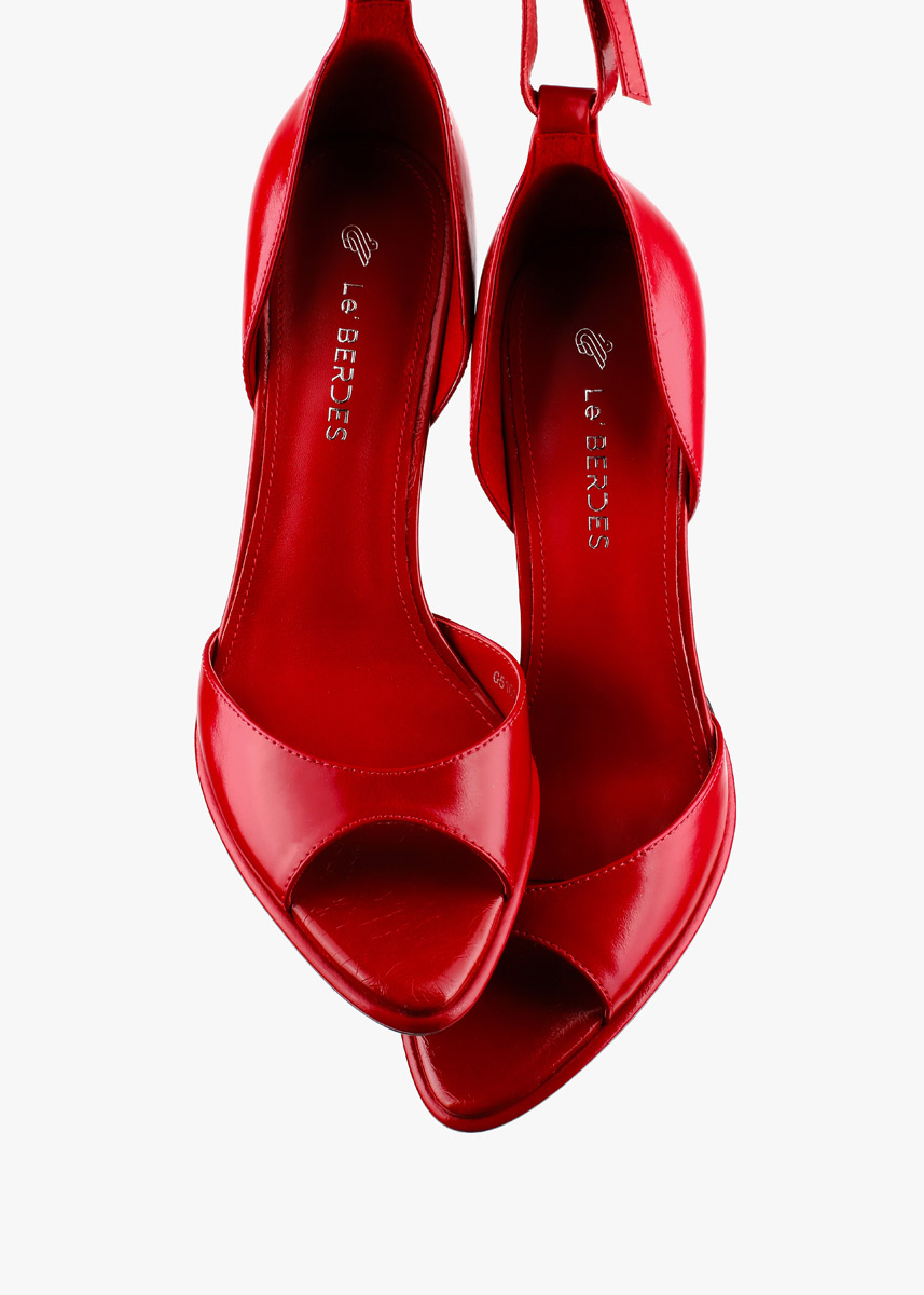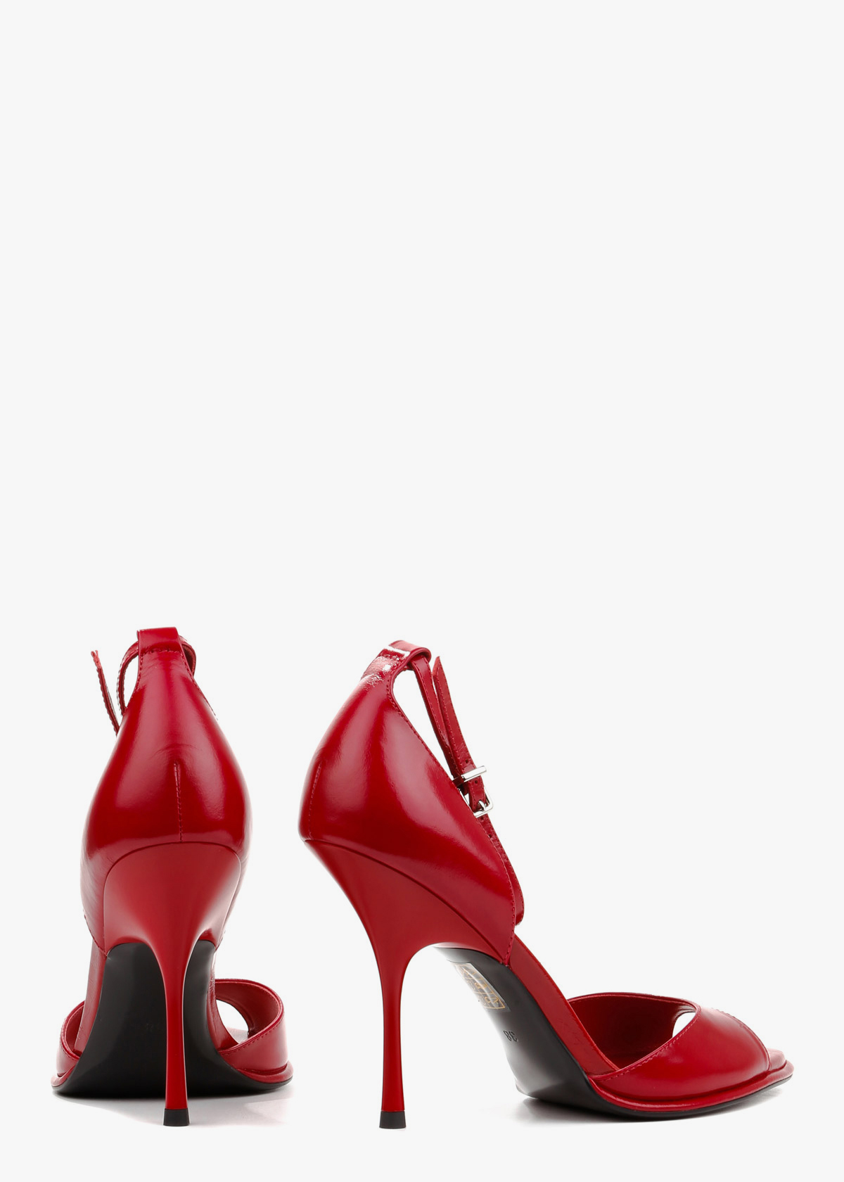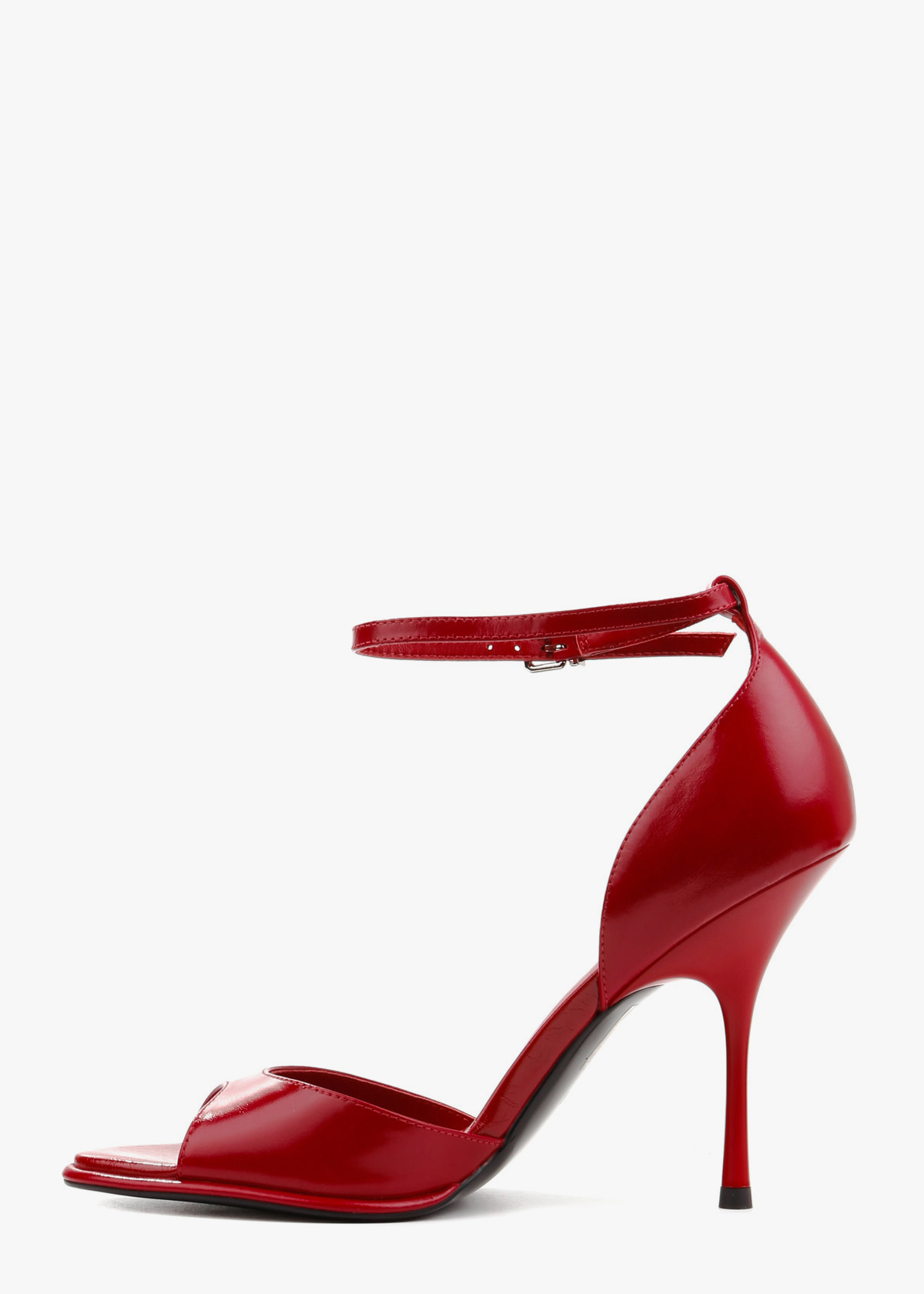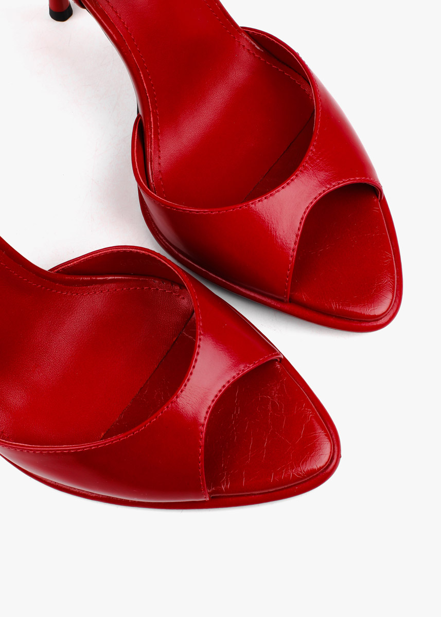 Елегантні босоніжки у насиченому червоному відтінку виконані з гладкої натуральної шкіри з делікатним глянцевим блиском. Витончена тонка шпилька та відкритий мис формують виразний силует, а висока закрита п'ята забезпечує стабільну посадку. Тонкий ремінець навколо щиколотки з мініатюрною металевою пряжкою срібного кольору дозволяє надійно зафіксувати стопу. Сміливий колір у поєднанні з класичною формою робить це взуття головним акцентом для вечірнього образу.
