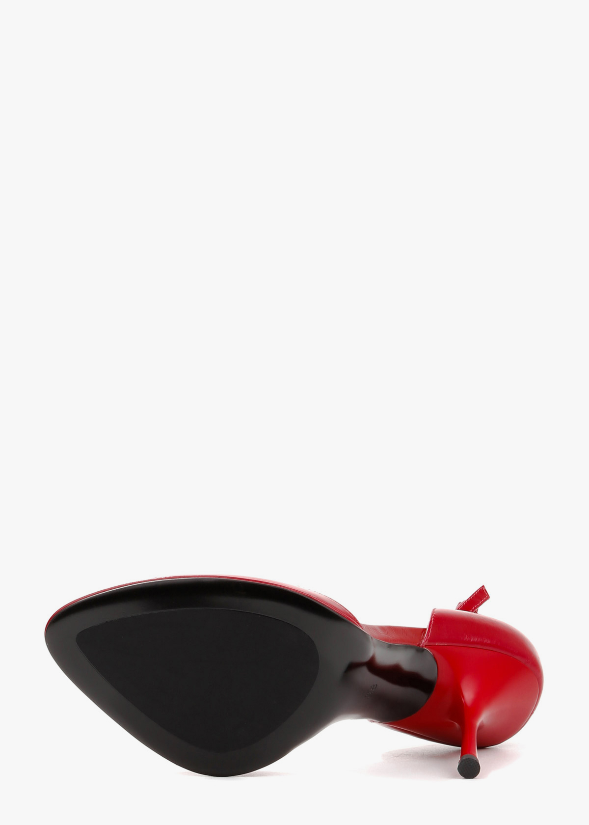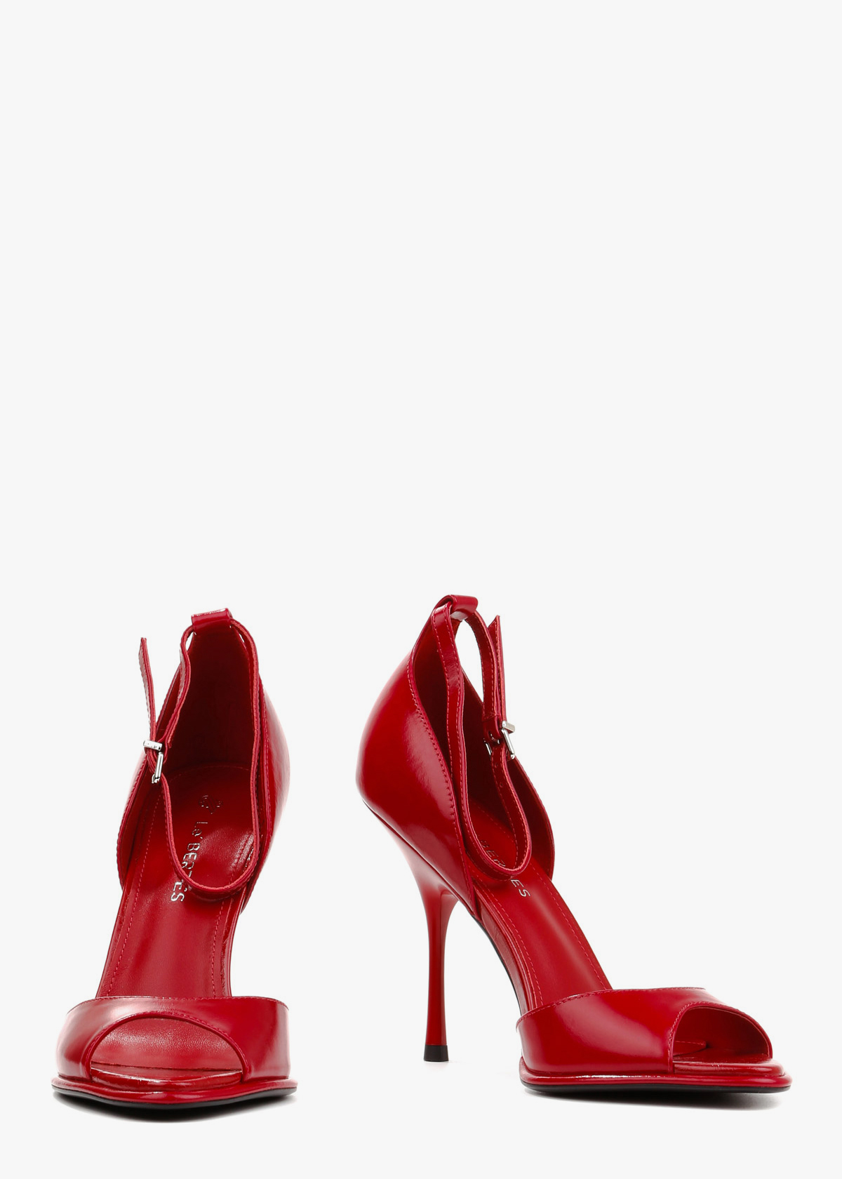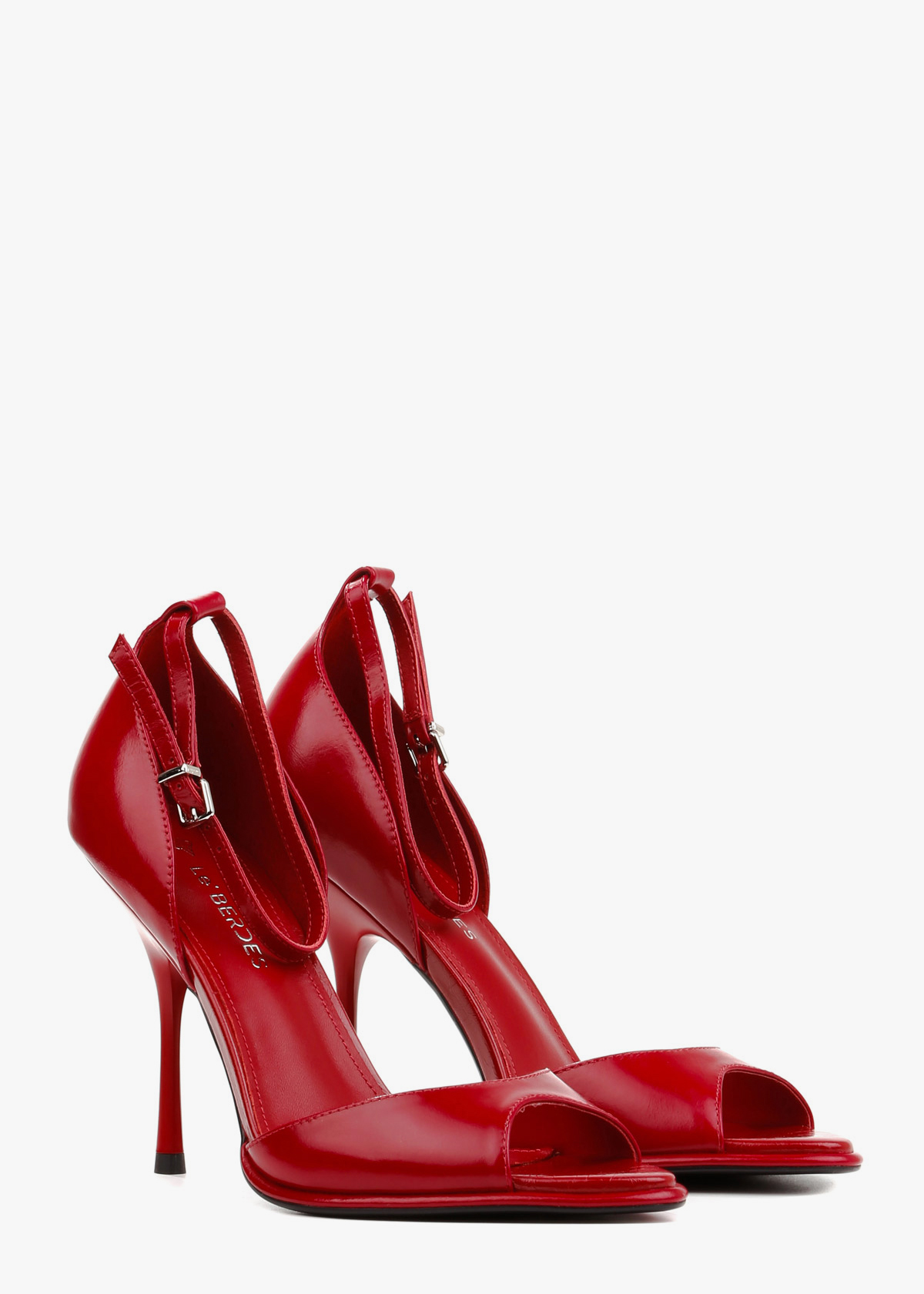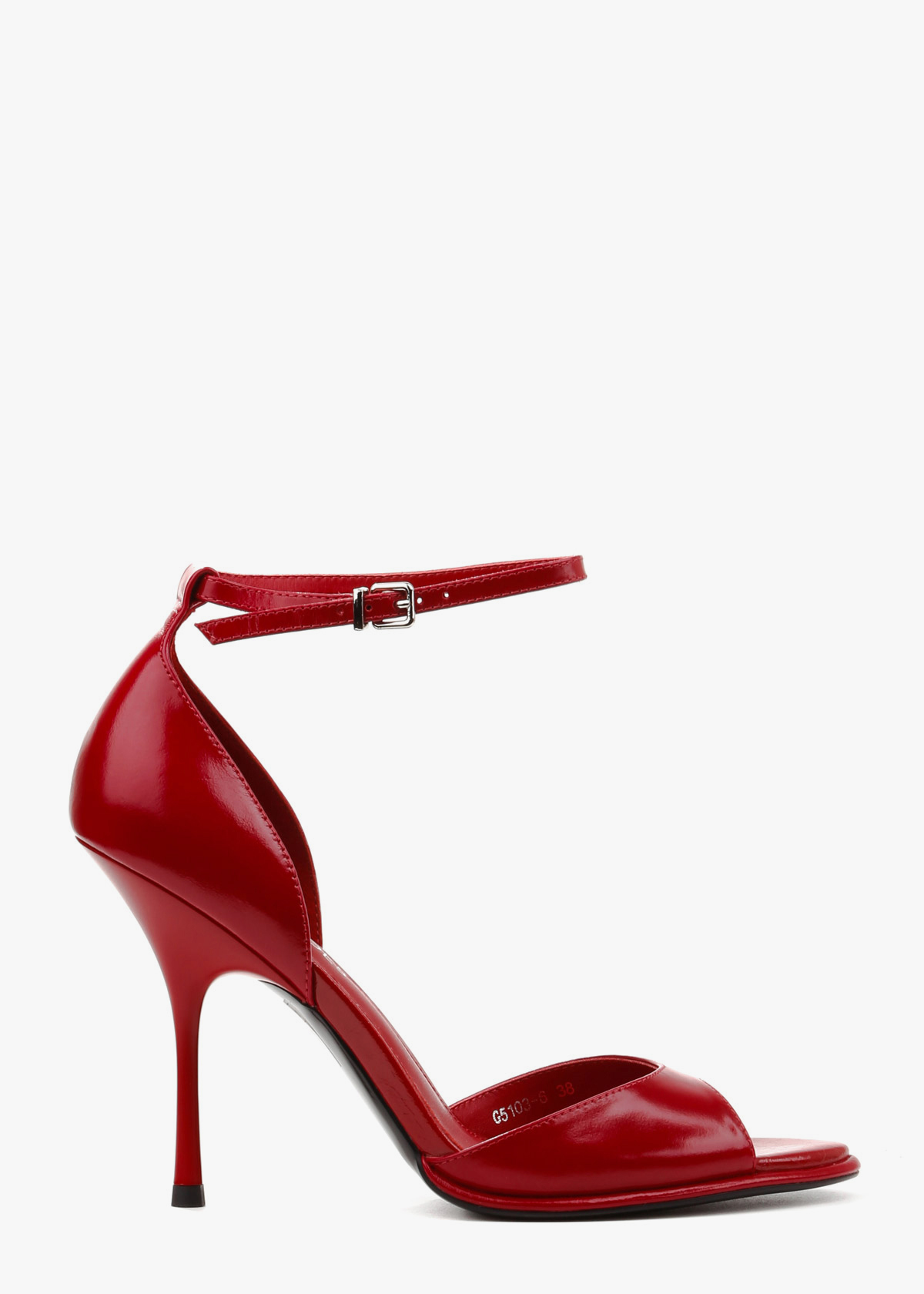 Елегантні босоніжки у насиченому червоному відтінку виконані з гладкої натуральної шкіри з делікатним глянцевим блиском. Витончена тонка шпилька та відкритий мис формують виразний силует, а висока закрита п'ята забезпечує стабільну посадку. Тонкий ремінець навколо щиколотки з мініатюрною металевою пряжкою срібного кольору дозволяє надійно зафіксувати стопу. Сміливий колір у поєднанні з класичною формою робить це взуття головним акцентом для вечірнього образу.