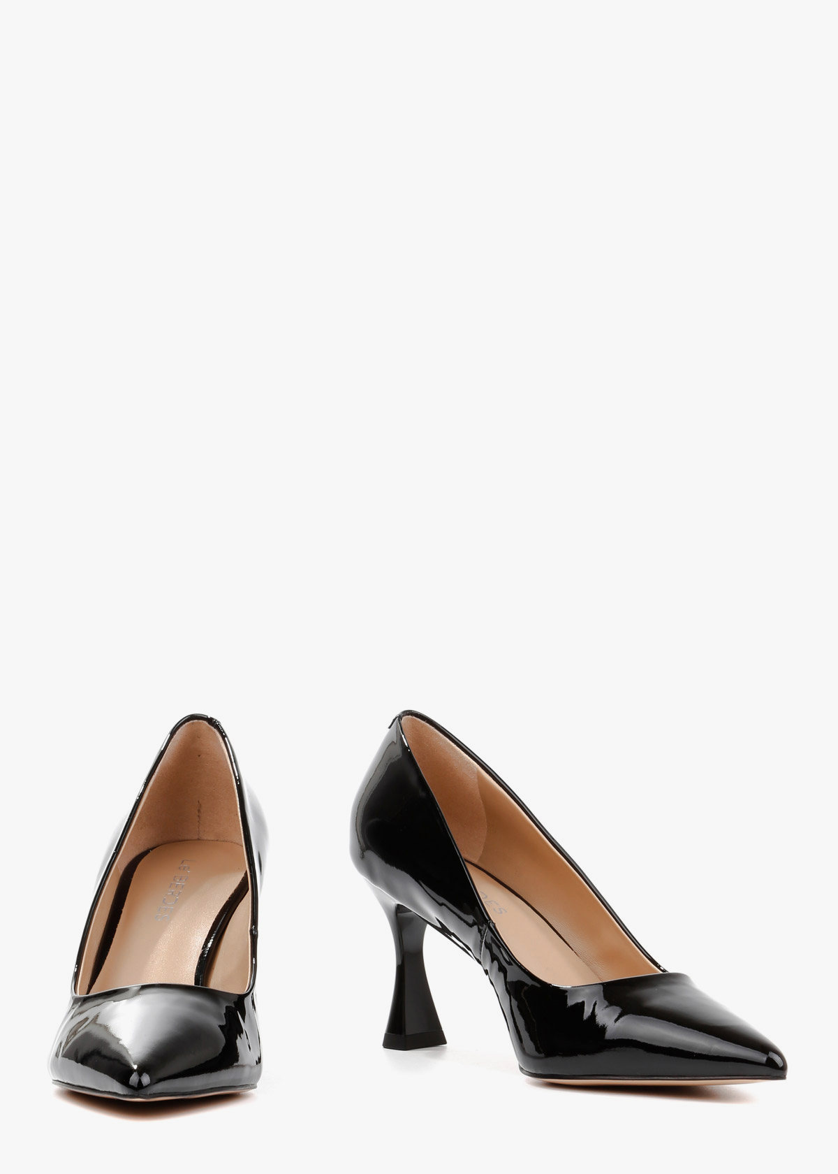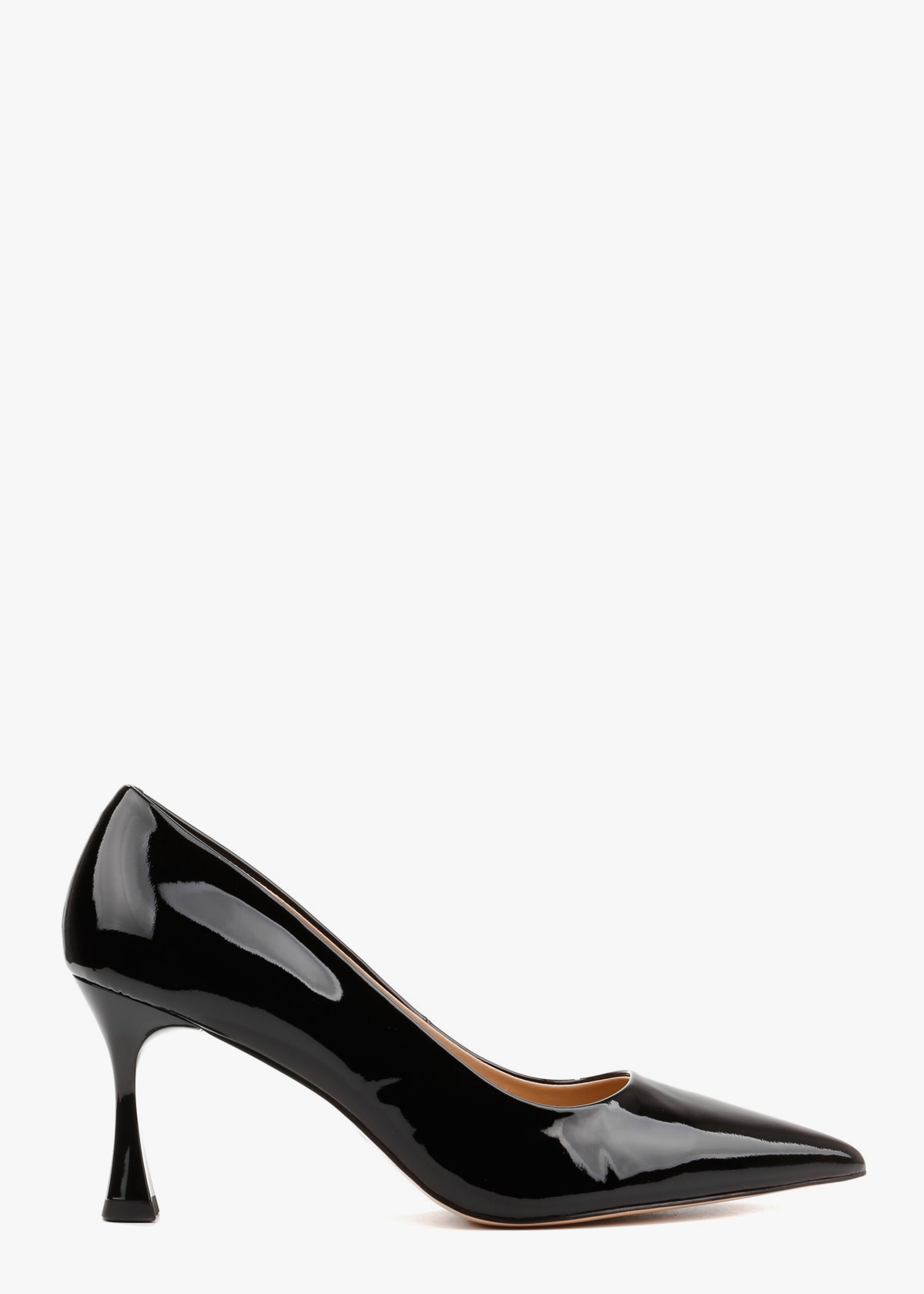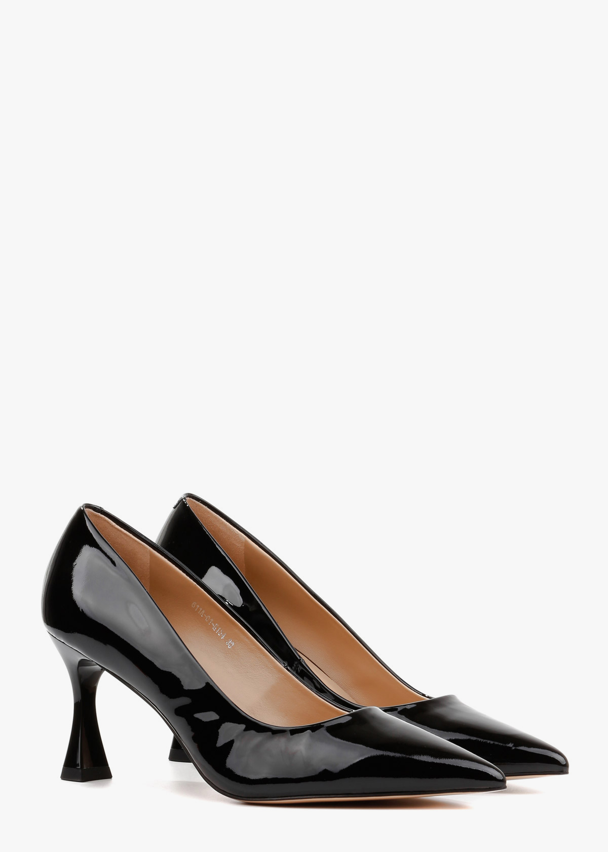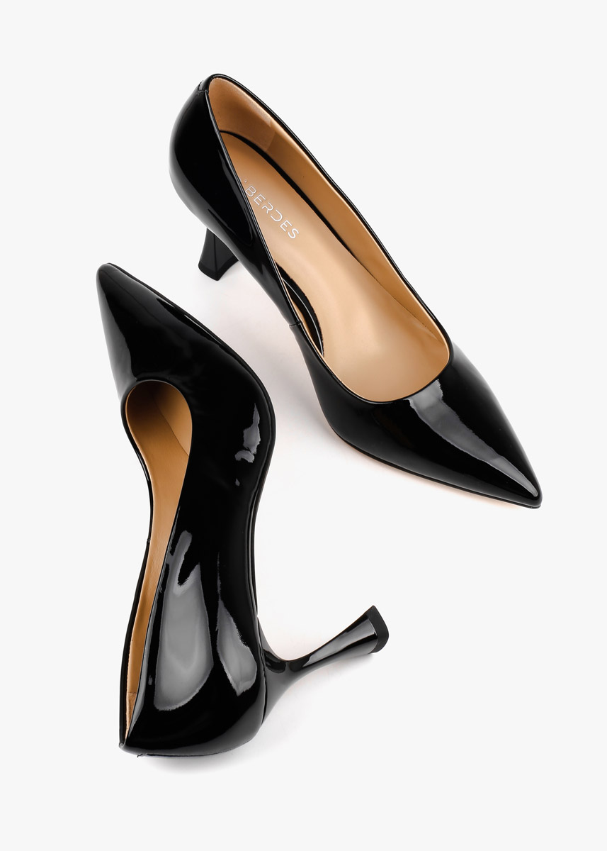 Класичні жіночі туфлі-човники, виготовлені з натуральної лакованої шкіри глибокого чорного кольору. Модель має витончений загострений мис та елегантний силует, що підкреслює красу стопи. Особливістю пари є стійкий фігурний каблук середньої висоти, який додає взуттю сучасного вигляду та забезпечує комфорт під час ходьби.