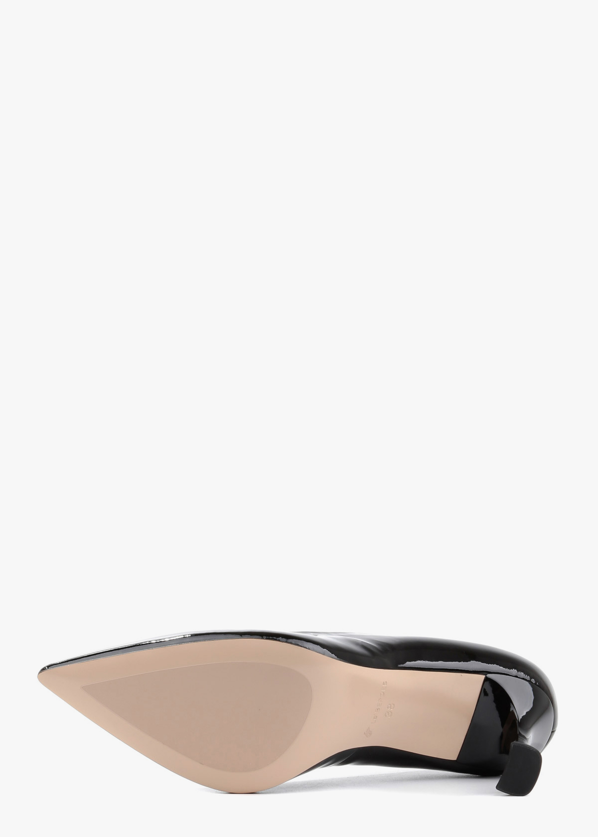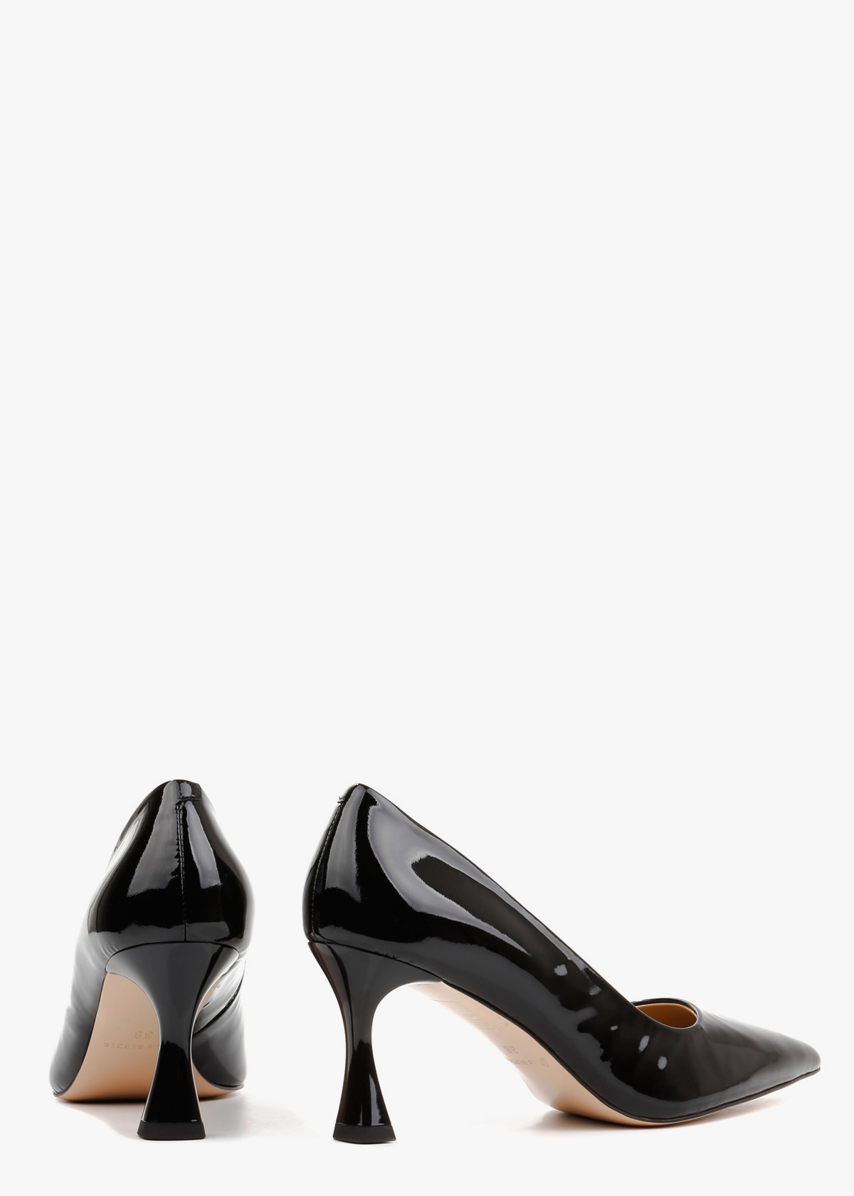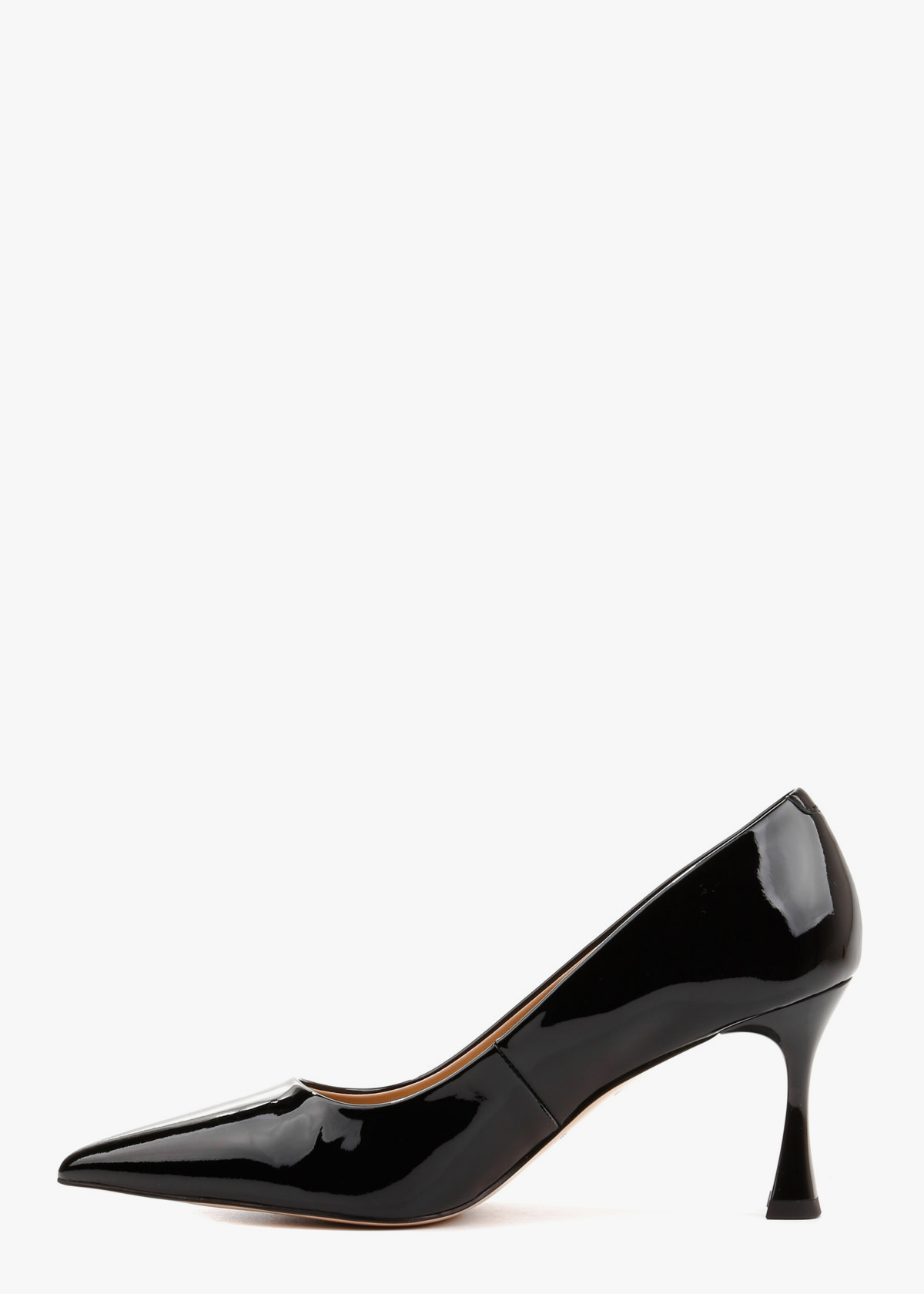 Класичні жіночі туфлі-човники, виготовлені з натуральної лакованої шкіри глибокого чорного кольору. Модель має витончений загострений мис та елегантний силует, що підкреслює красу стопи. Особливістю пари є стійкий фігурний каблук середньої висоти, який додає взуттю сучасного вигляду та забезпечує комфорт під час ходьби.