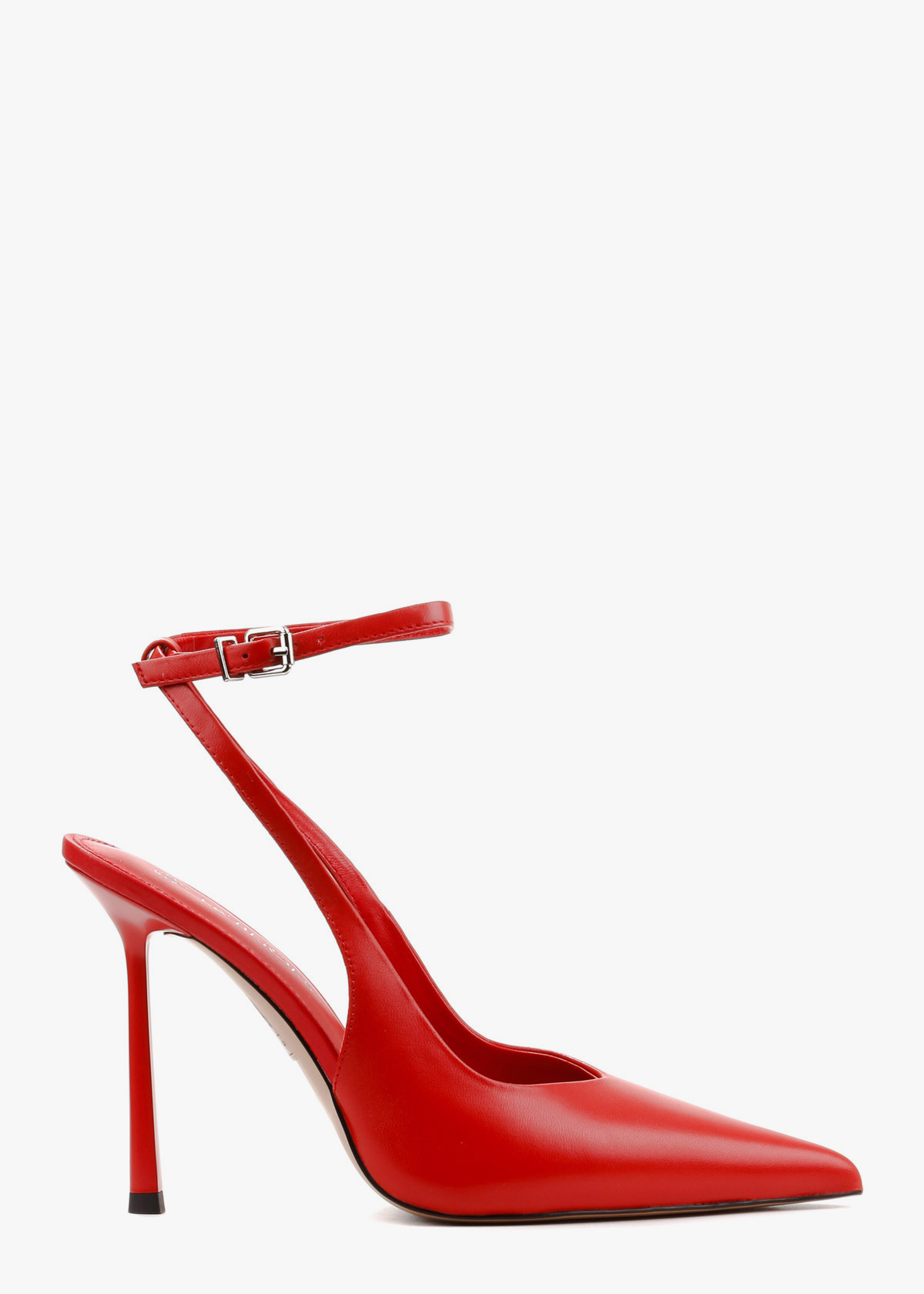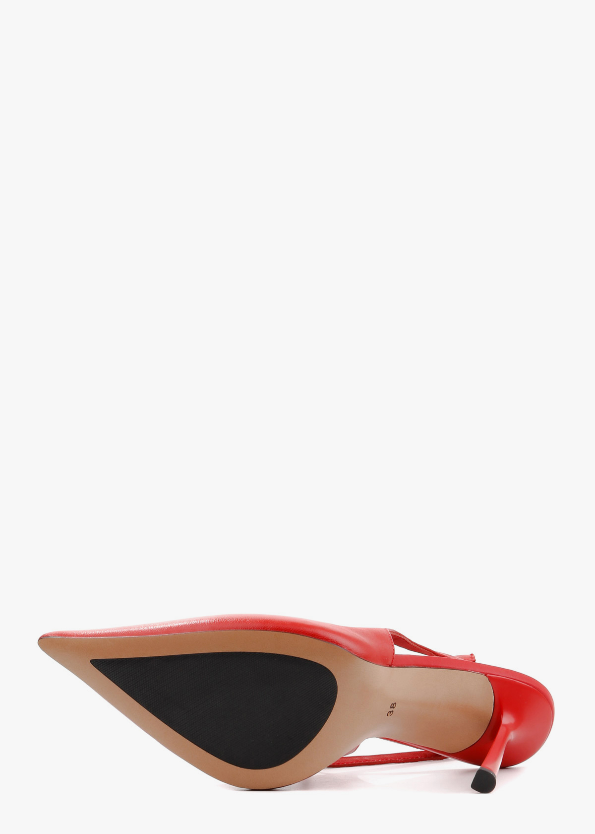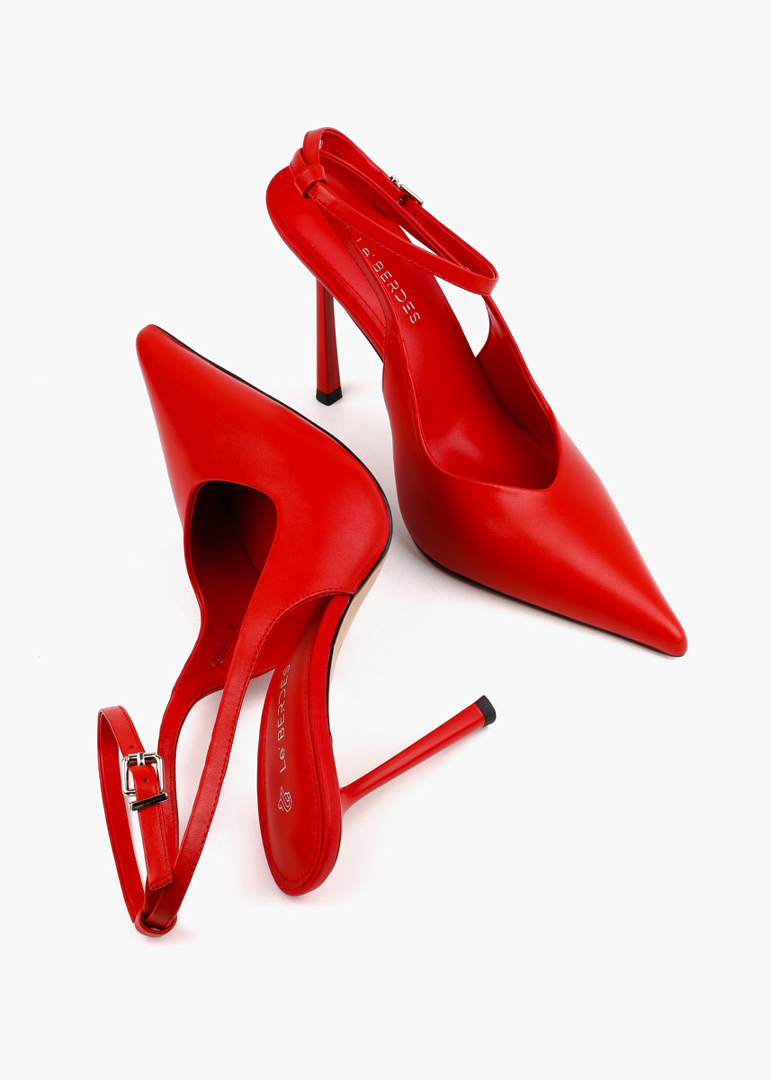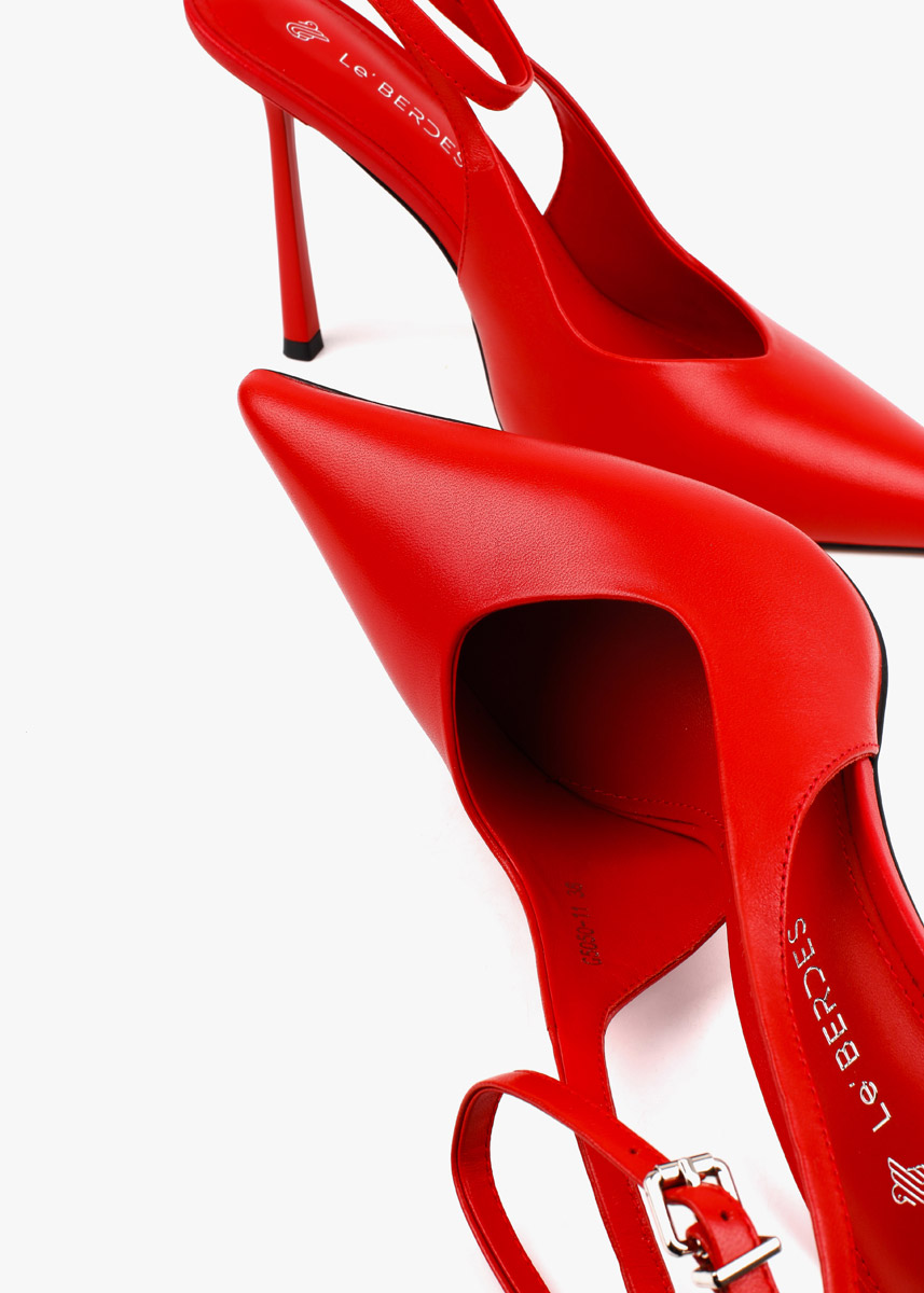 Елегантні жіночі сабо у класичному червоному кольорі, виготовлені з гладкої натуральної шкіри. Модель вирізняється витонченим загостреним мисом та тонкими ремінцями, що граційно обвивають щиколотку, додаючи образу жіночності. Високий підбор-шпилька створює стрункий силует, роблячи цю пару ідеальним вибором для вечірнього виходу або особливої події.