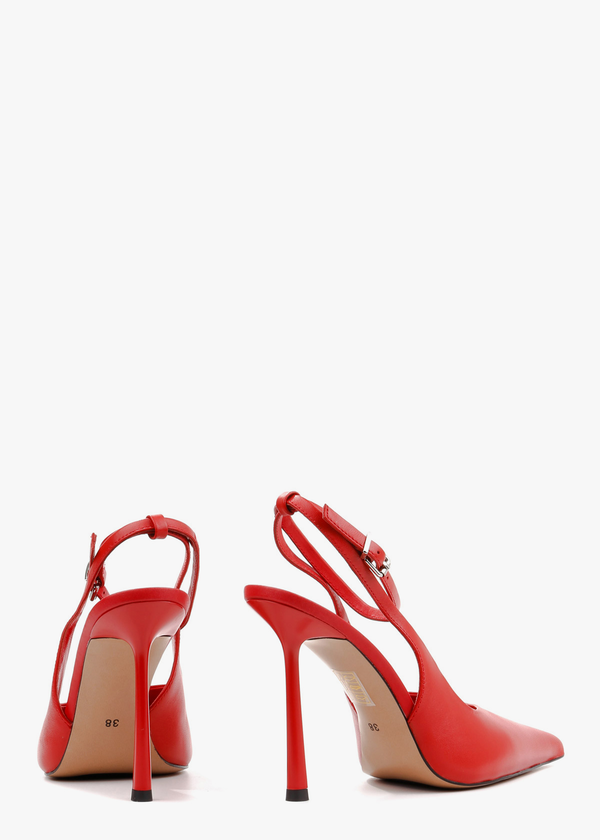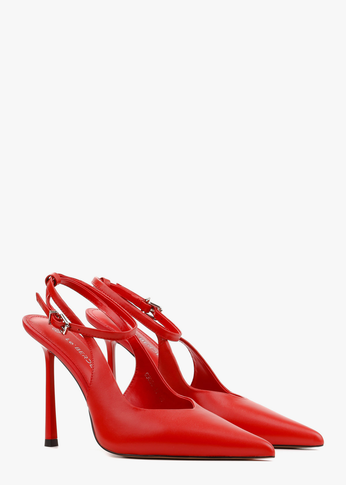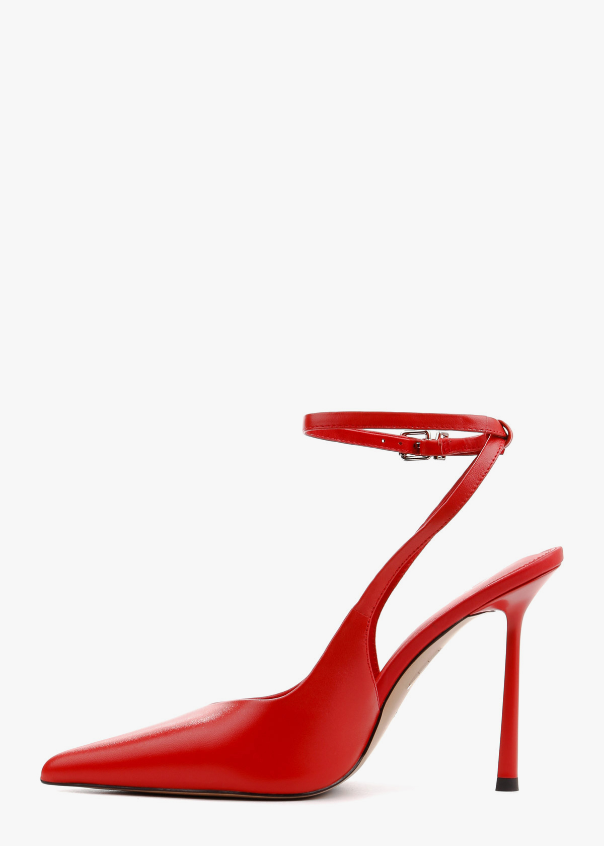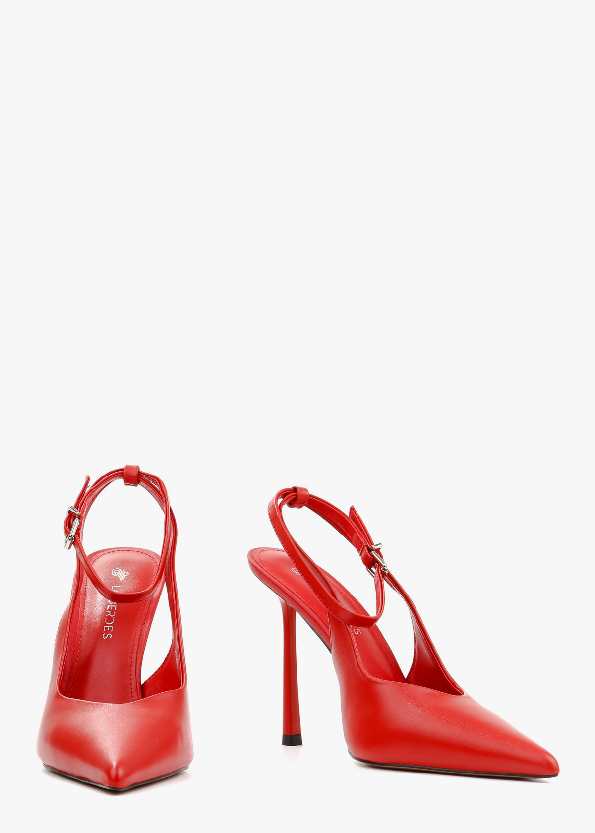 Елегантні жіночі сабо у класичному червоному кольорі, виготовлені з гладкої натуральної шкіри. Модель вирізняється витонченим загостреним мисом та тонкими ремінцями, що граційно обвивають щиколотку, додаючи образу жіночності. Високий підбор-шпилька створює стрункий силует, роблячи цю пару ідеальним вибором для вечірнього виходу або особливої події.