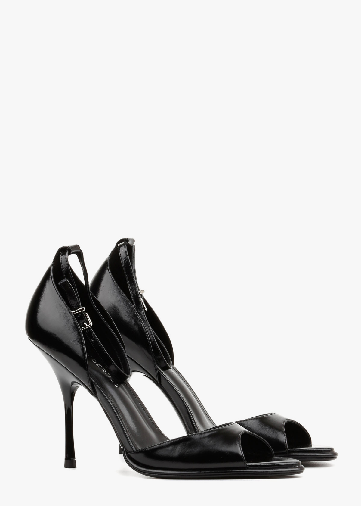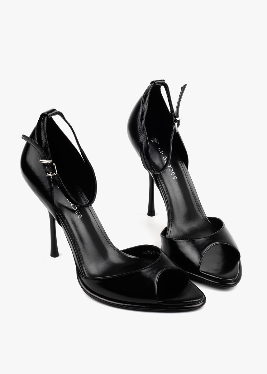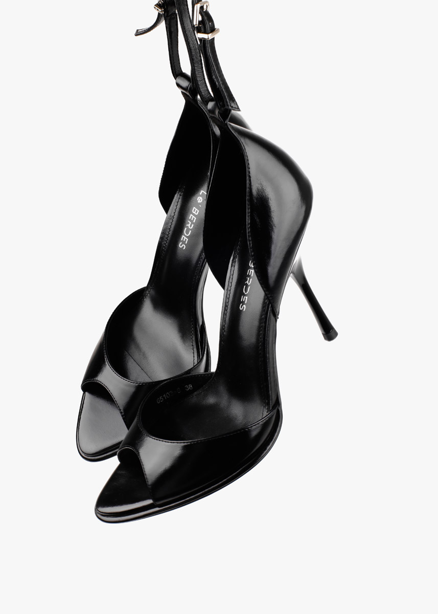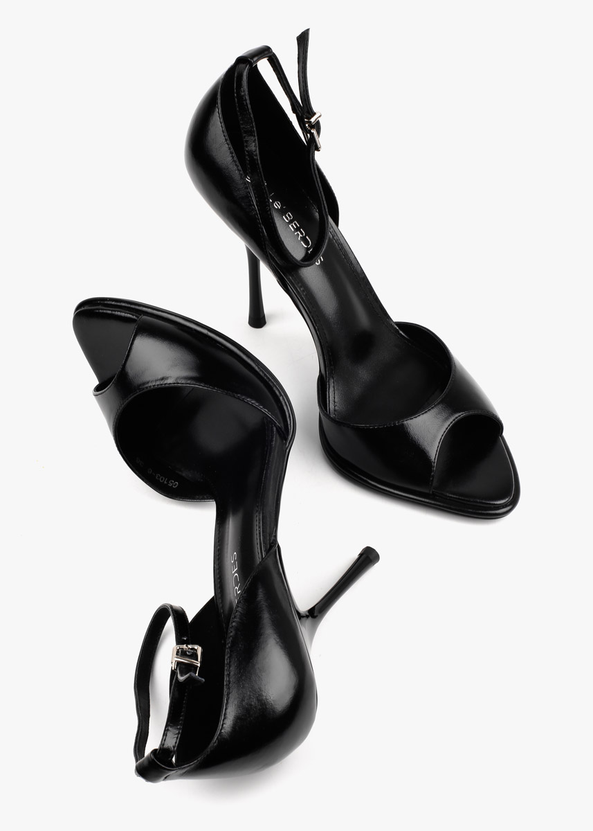 Елегантні босоніжки у чорному кольорі виконані з гладкої натуральної шкіри з делікатним глянцевим блиском. Витончена тонка шпилька та відкритий мис формують виразний силует, а висока закрита п'ята забезпечує стабільну посадку. Тонкий ремінець навколо щиколотки з мініатюрною металевою пряжкою срібного кольору дозволяє надійно зафіксувати стопу. Сміливий колір у поєднанні з класичною формою робить це взуття головним акцентом для вечірнього образу.