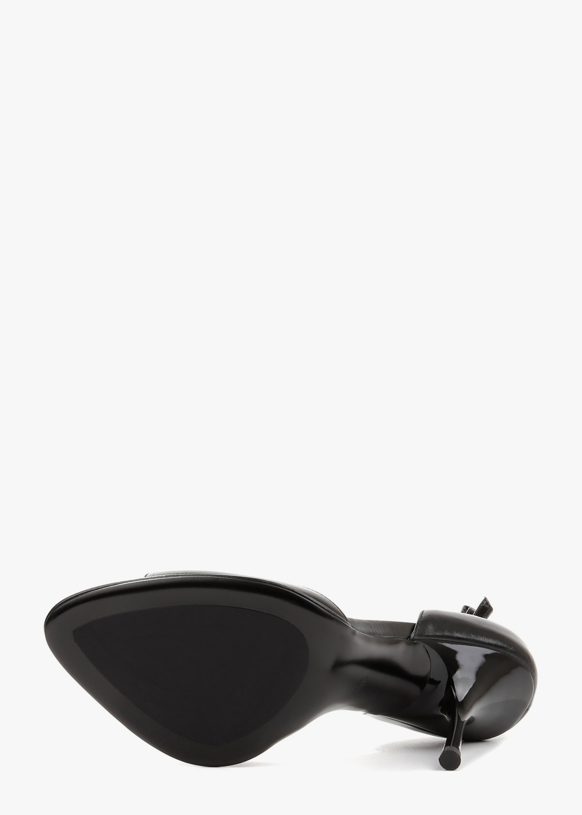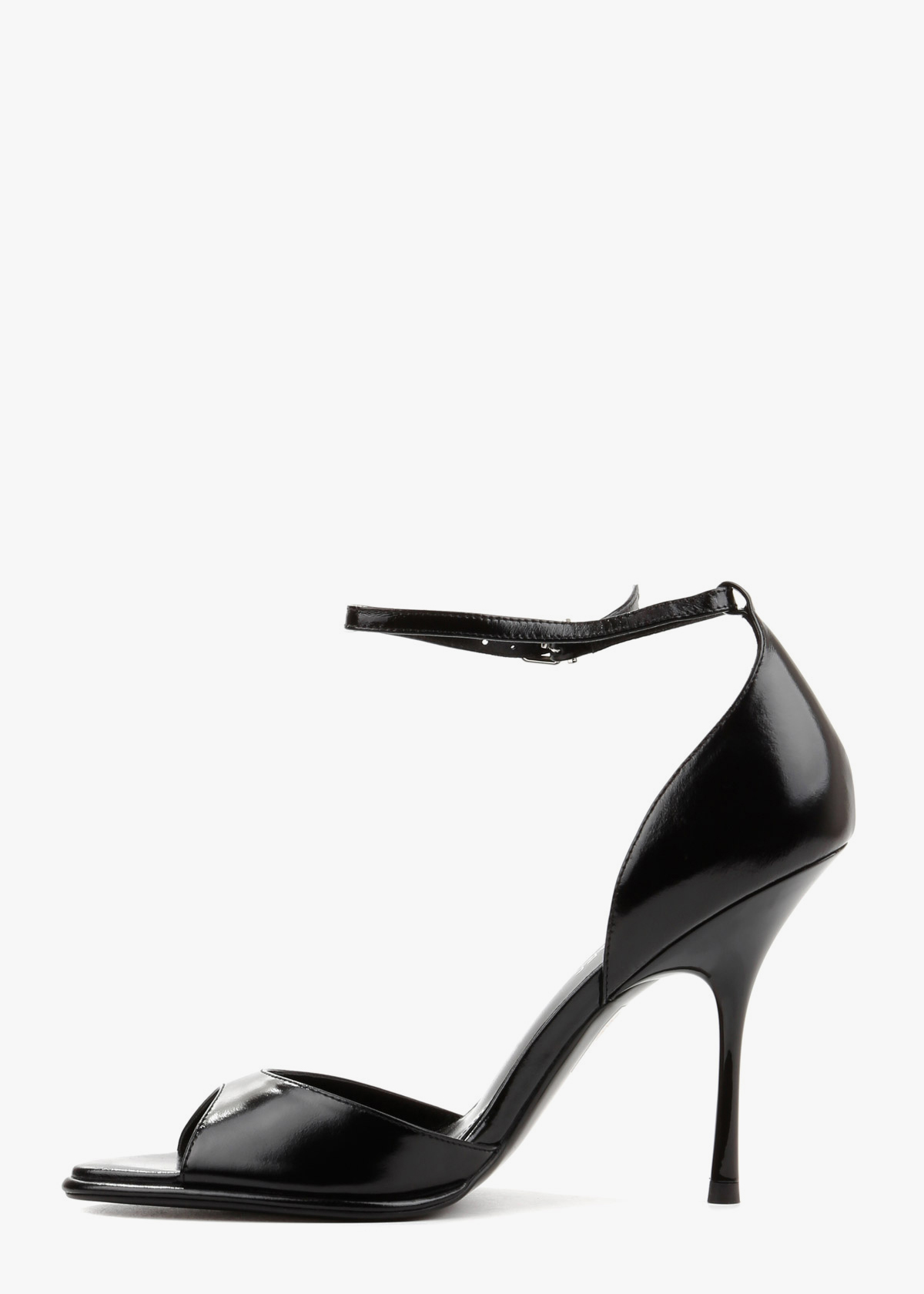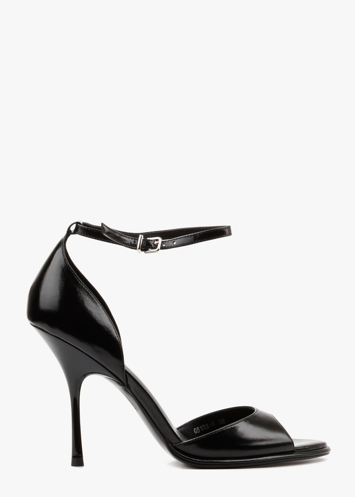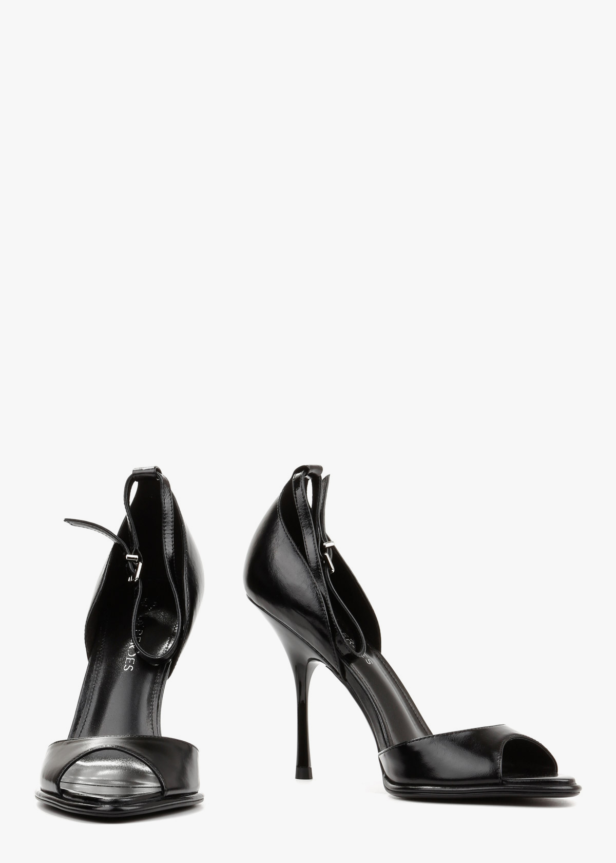 Елегантні босоніжки у чорному кольорі виконані з гладкої натуральної шкіри з делікатним глянцевим блиском. Витончена тонка шпилька та відкритий мис формують виразний силует, а висока закрита п'ята забезпечує стабільну посадку. Тонкий ремінець навколо щиколотки з мініатюрною металевою пряжкою срібного кольору дозволяє надійно зафіксувати стопу. Сміливий колір у поєднанні з класичною формою робить це взуття головним акцентом для вечірнього образу.