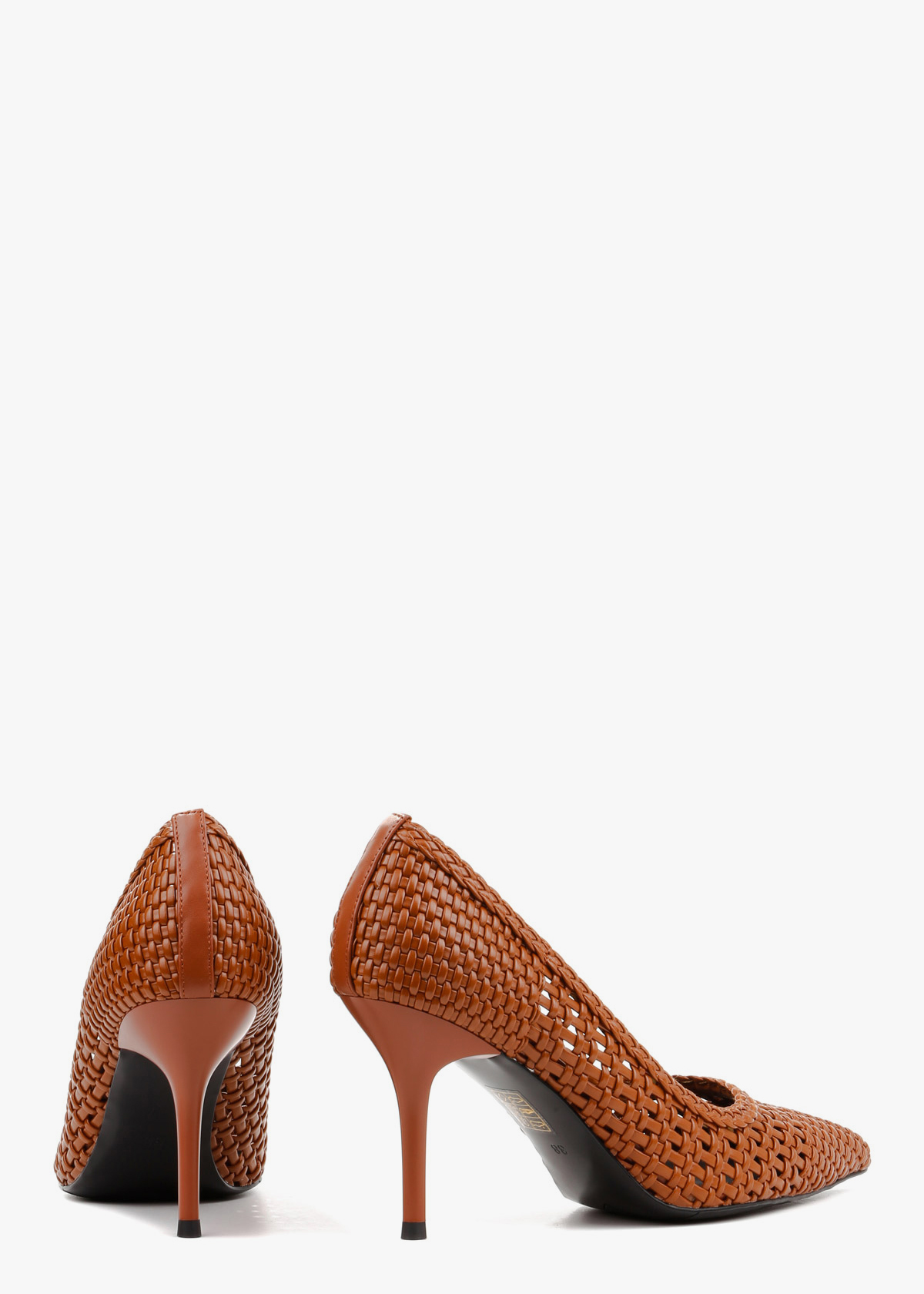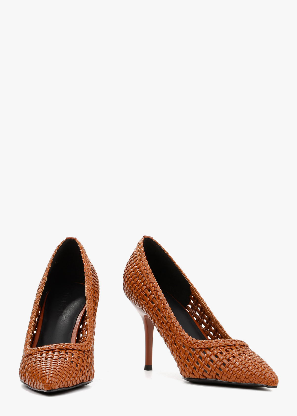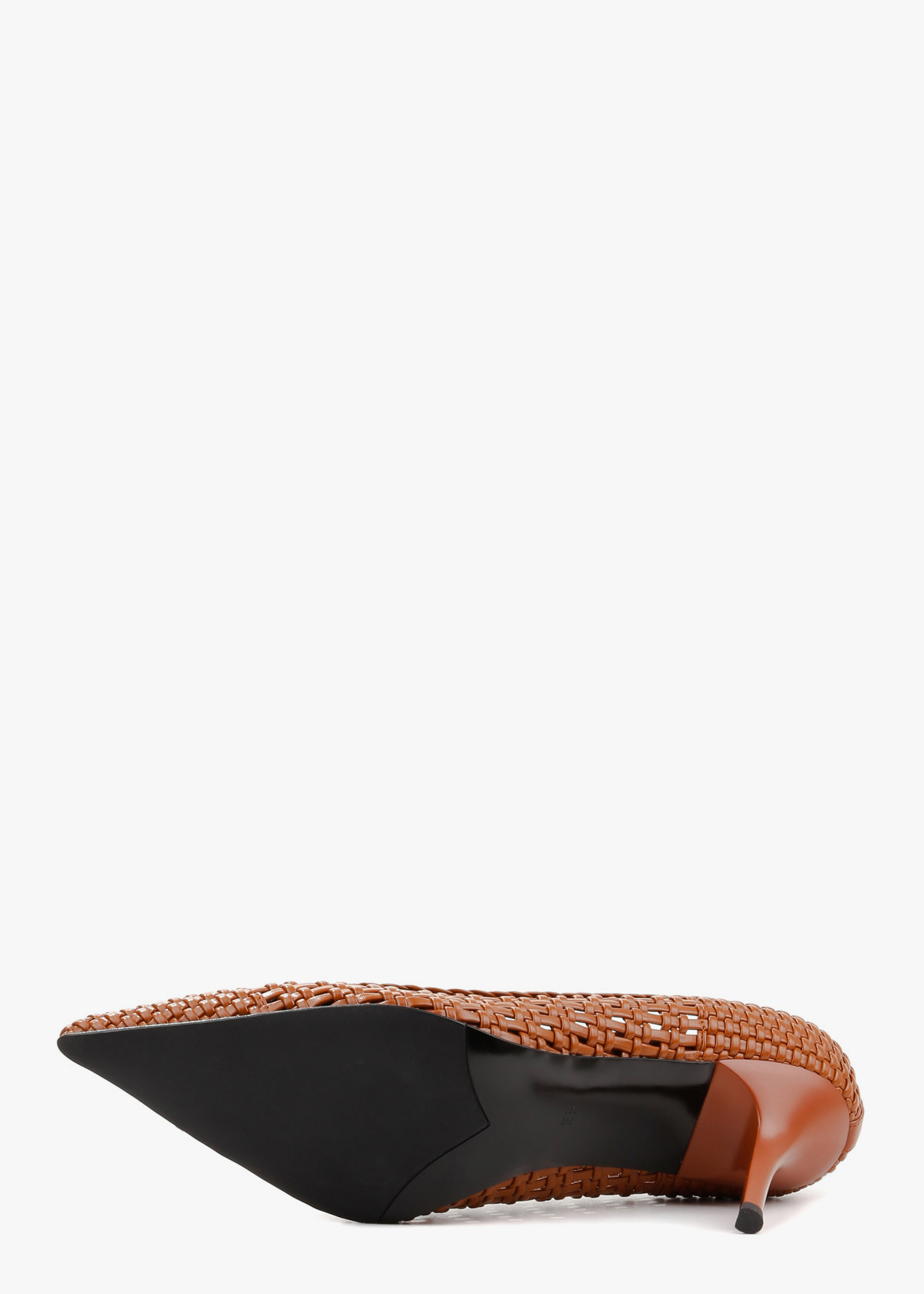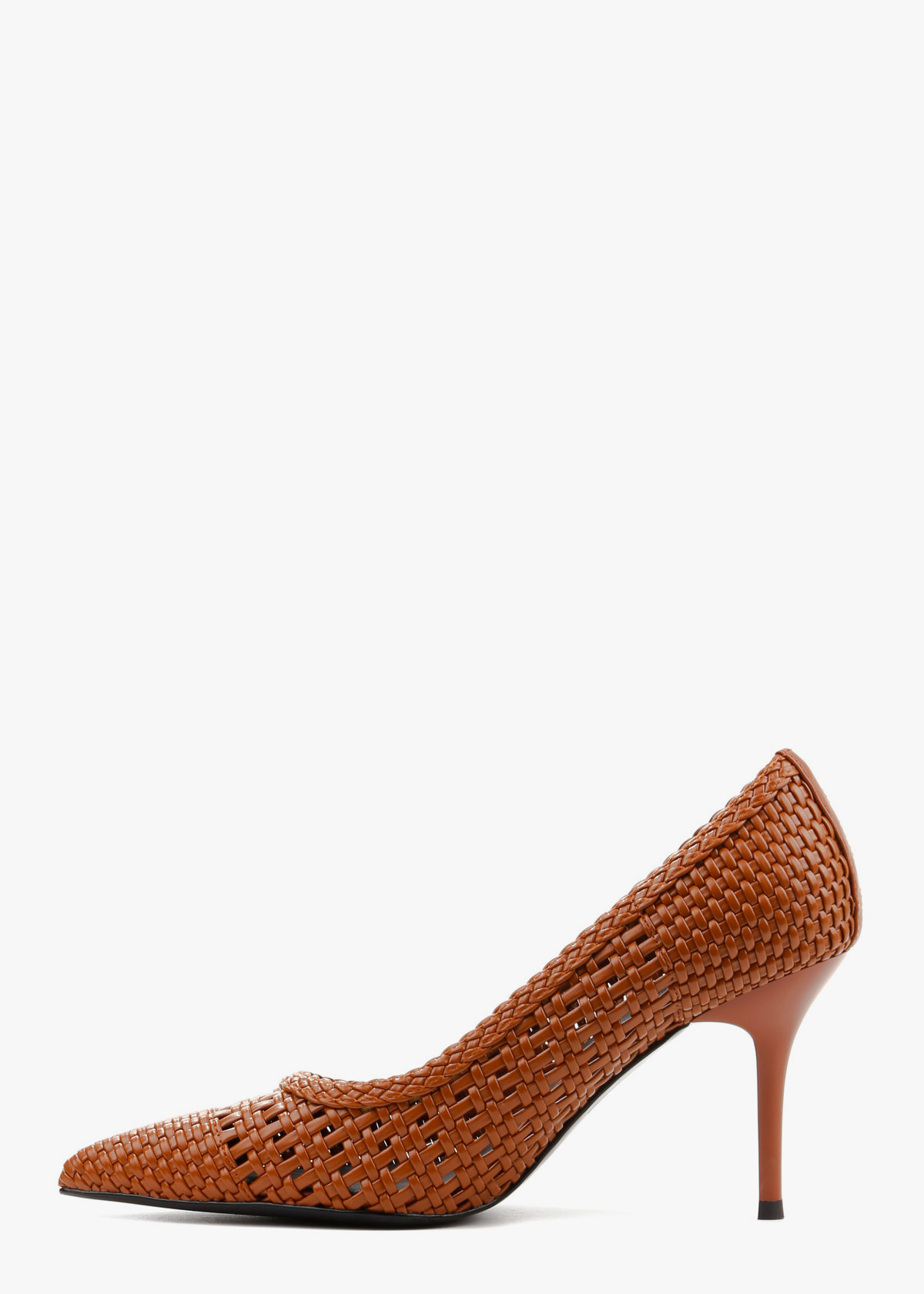 Жіночі туфлі-човники з гострим мисом, виготовлені з майстерно плетеної натуральної шкіри насиченого карамельного кольору. Модель має оригінальну відкриту текстуру, що створює ефект легкості та забезпечує чудову вентиляцію стопи. Елегантний каблук-шпилька середньої висоти в тон основного матеріалу підкреслює жіночність силуету, роблячи ці туфлі ідеальним вибором для стильних літніх образів.