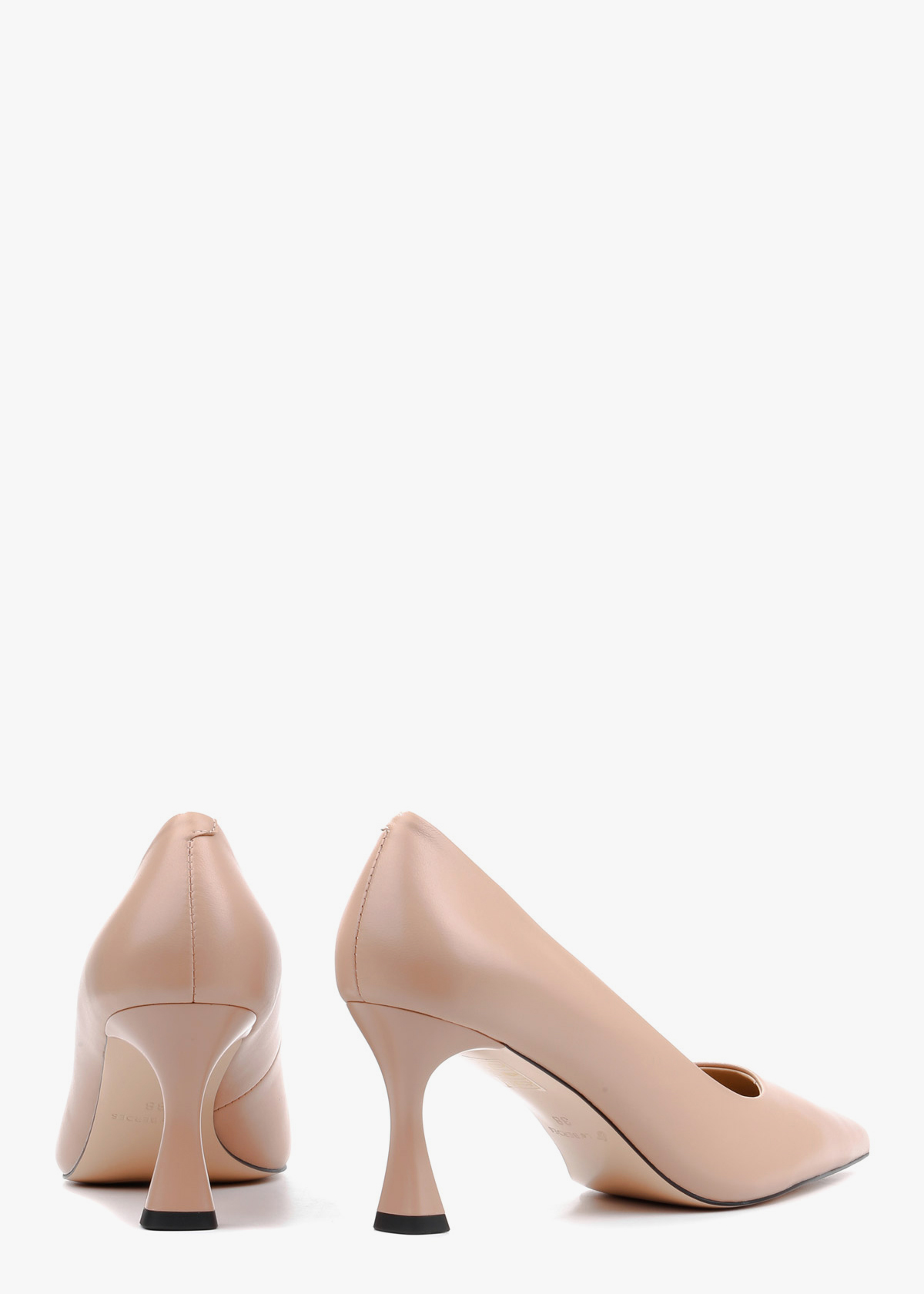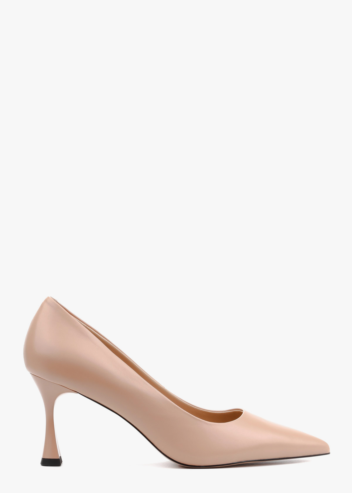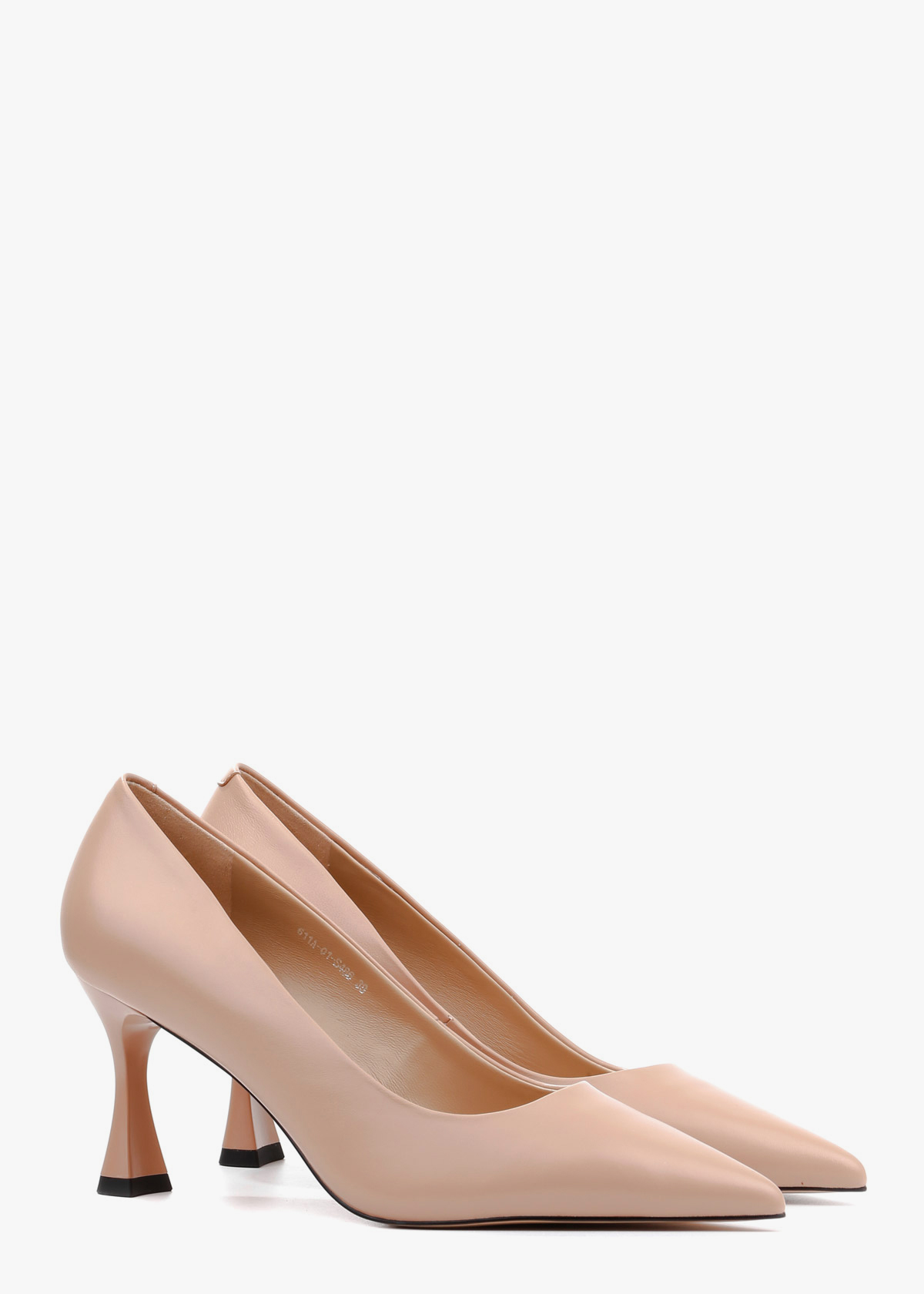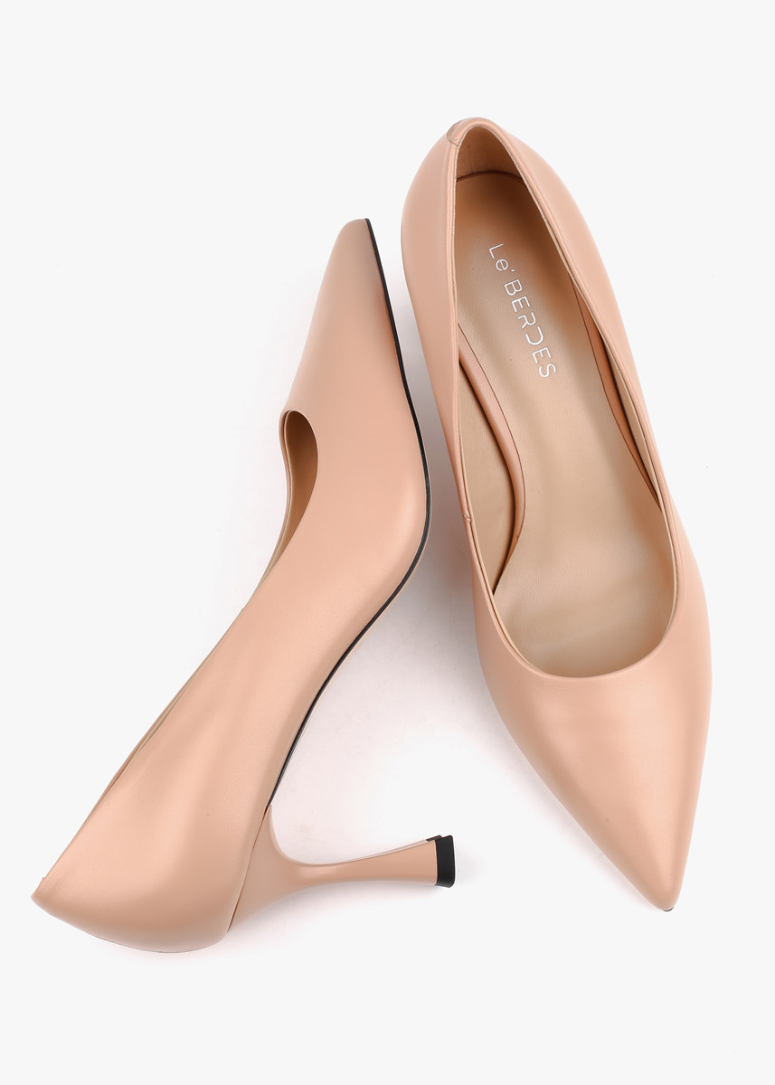 Класичні жіночі туфлі-човники, виготовлені з натуральної шкіри глибокого бежевого кольору. Модель має витончений загострений мис та елегантний силует, що підкреслює красу стопи. Особливістю пари є стійкий фігурний каблук середньої висоти, який додає взуттю сучасного вигляду та забезпечує комфорт під час ходьби.