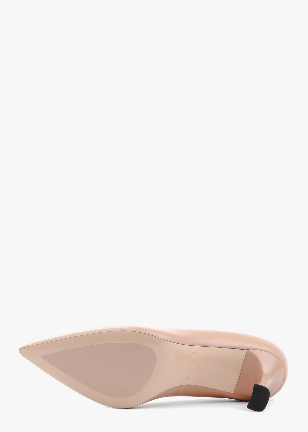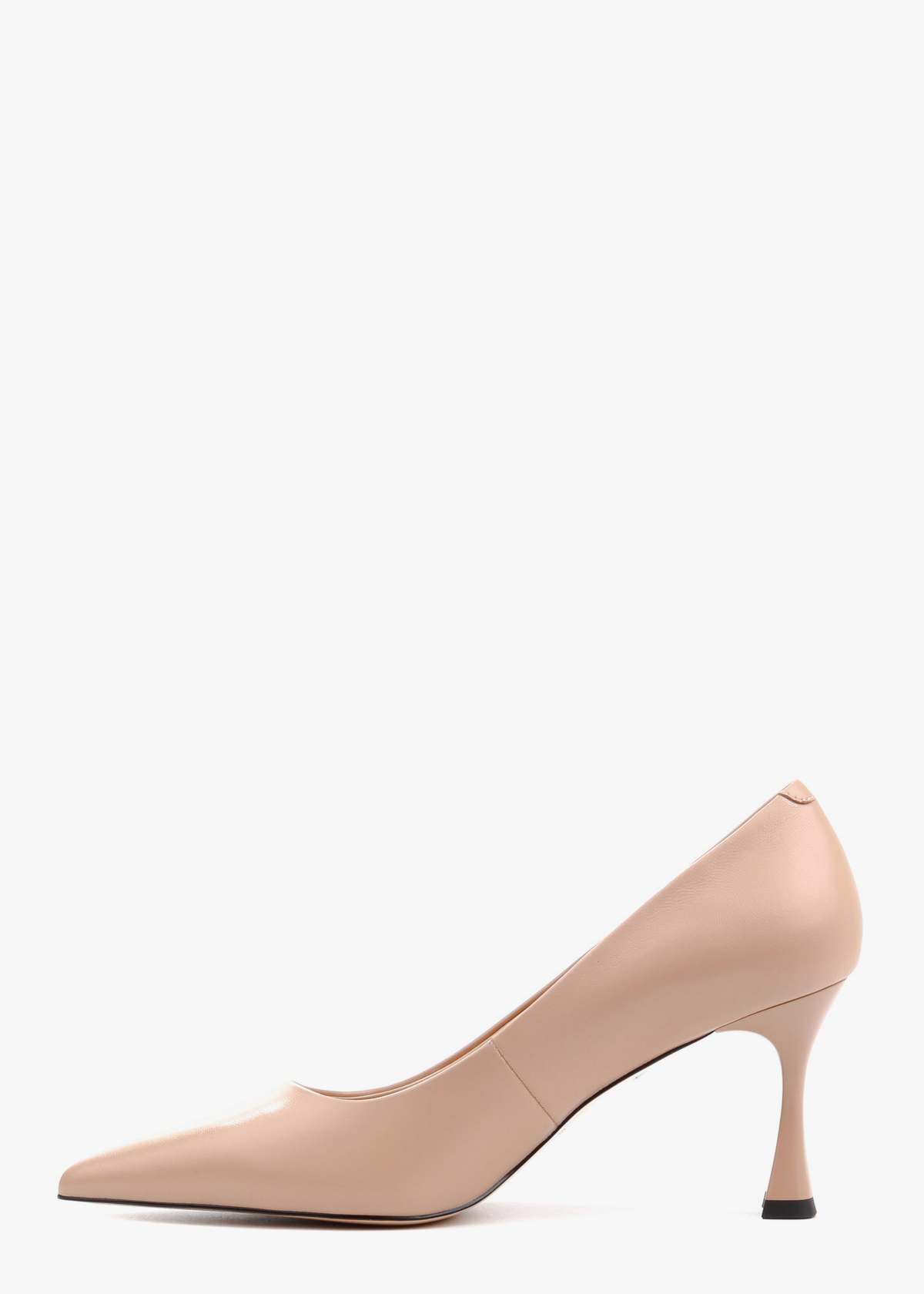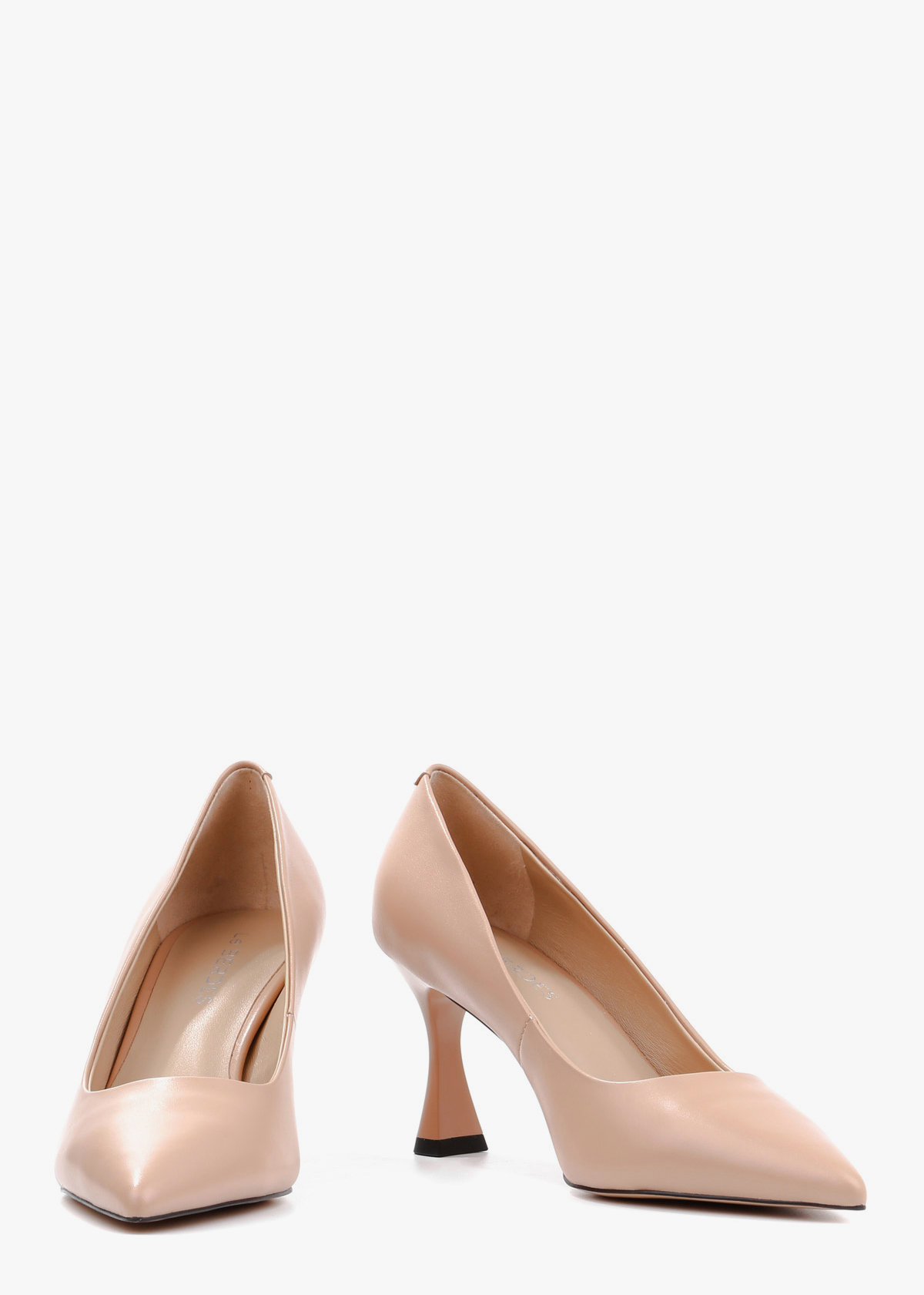 Класичні жіночі туфлі-човники, виготовлені з натуральної шкіри глибокого бежевого кольору. Модель має витончений загострений мис та елегантний силует, що підкреслює красу стопи. Особливістю пари є стійкий фігурний каблук середньої висоти, який додає взуттю сучасного вигляду та забезпечує комфорт під час ходьби.