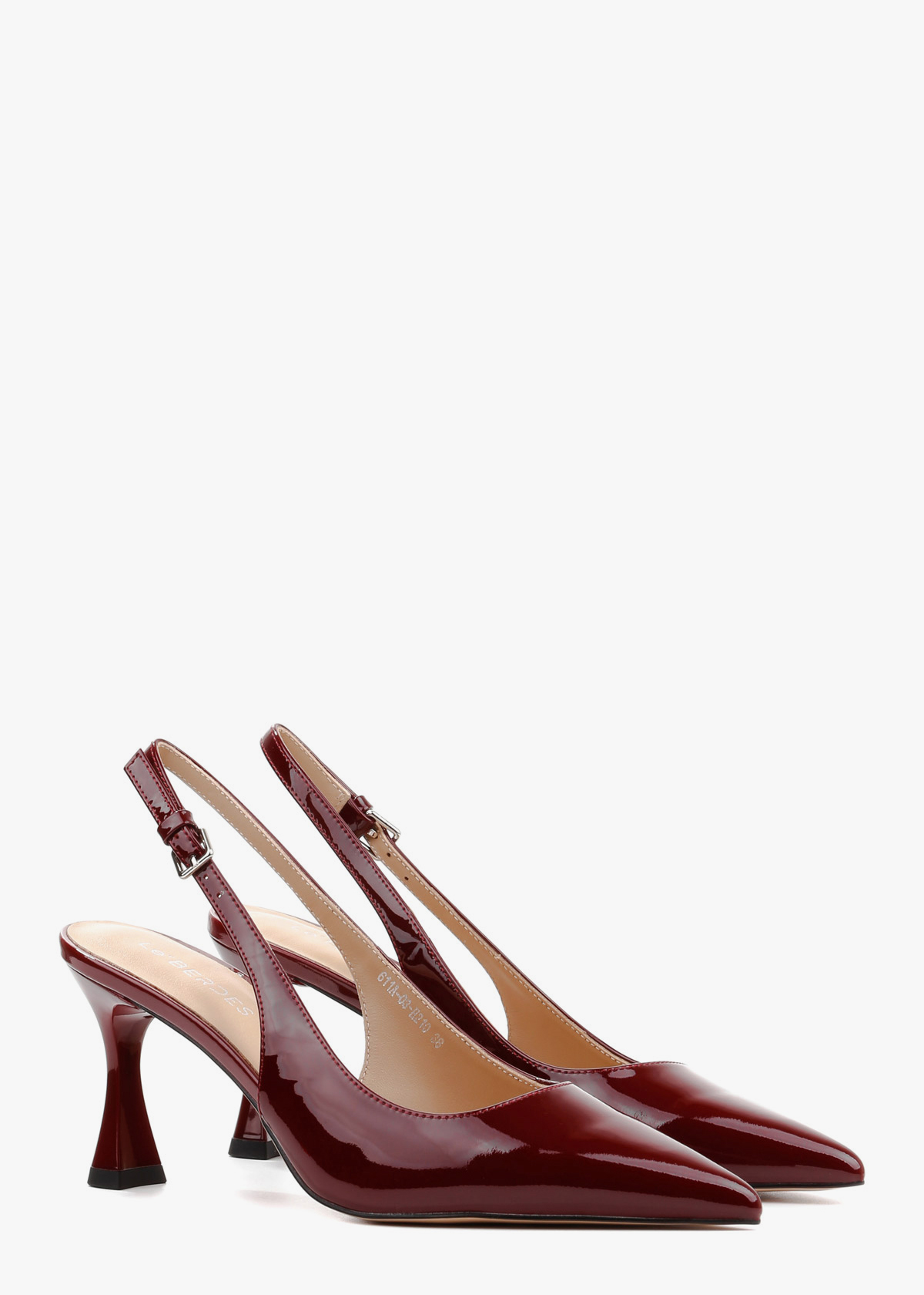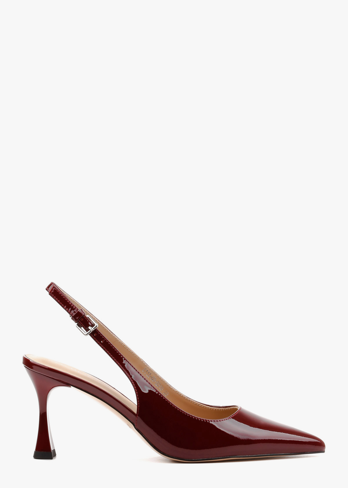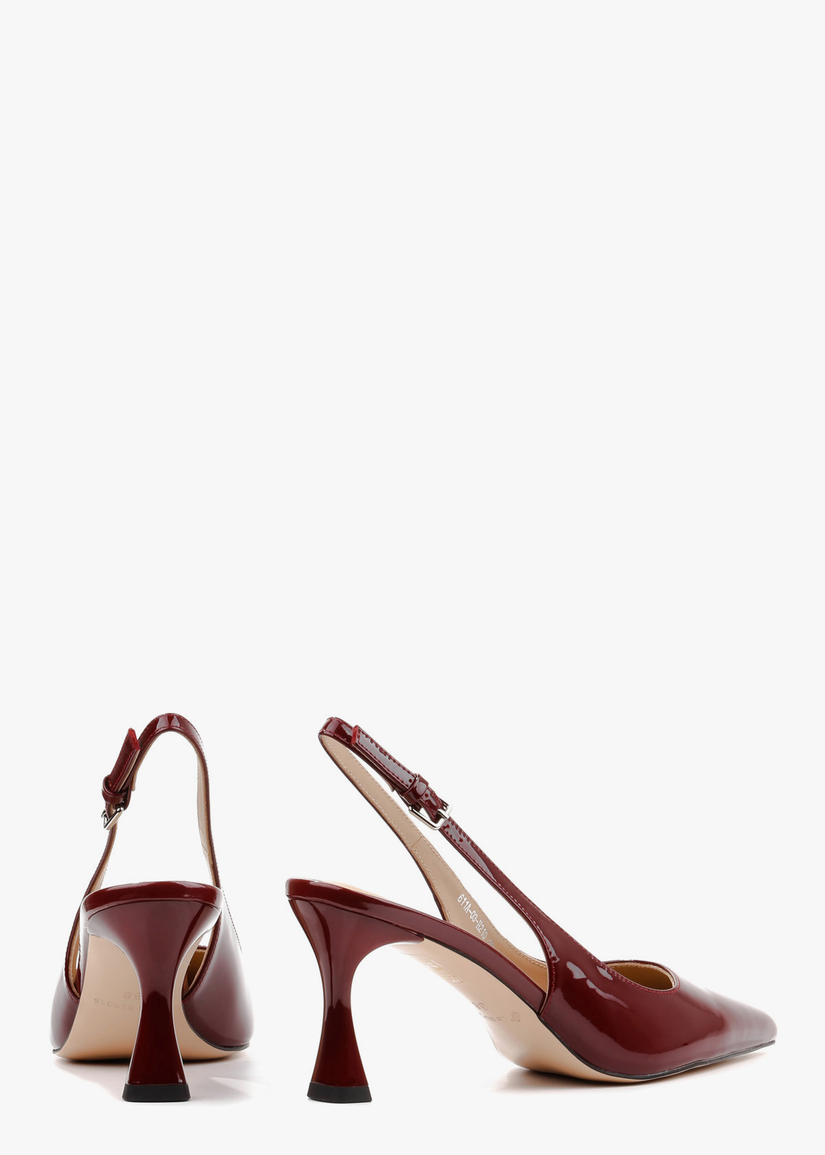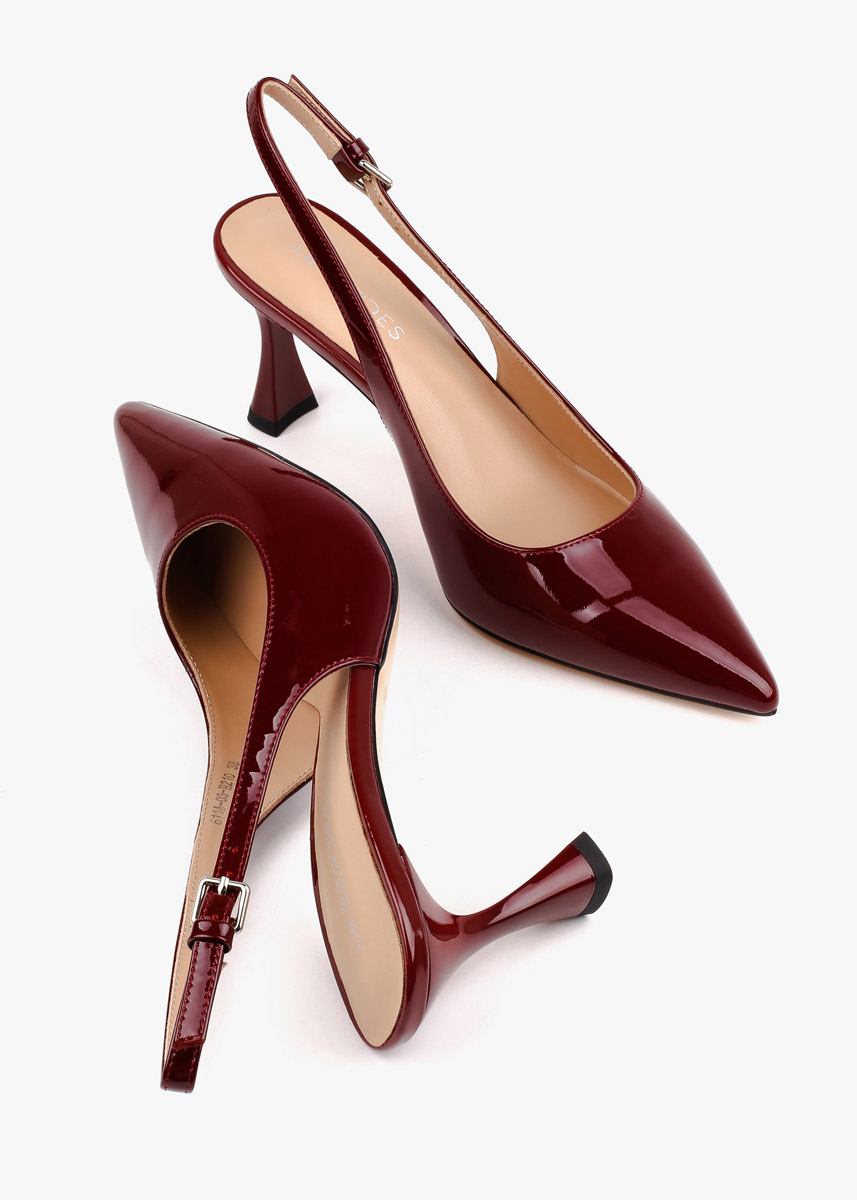 Вишукані жіночі сабо у глибокому винному відтінку, виготовлені з натуральної лакованої шкіри. Модель має елегантний загострений мис та тонкий ремінець із мініатюрною пряжкою, що забезпечує надійну фіксацію на щиколотці. Стійкий фігурний підбор середньої висоти додає парі сучасної естетики, роблячи ці туфлі ідеальним акцентом для вечірнього або ділового образу.