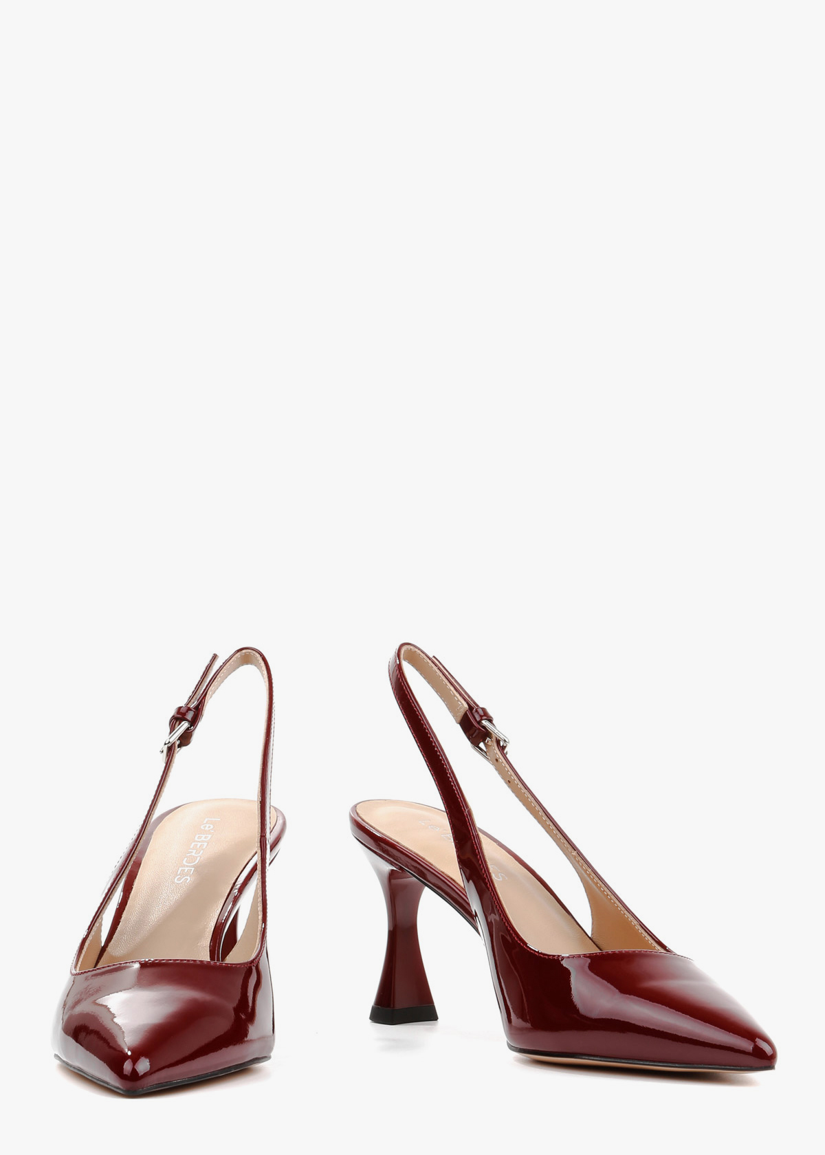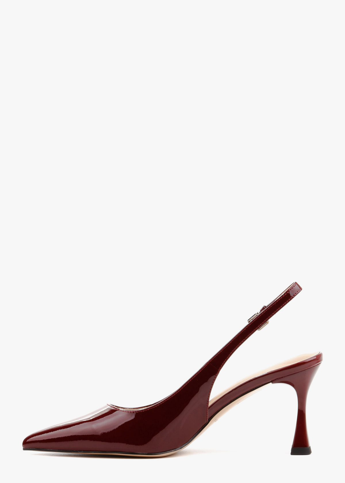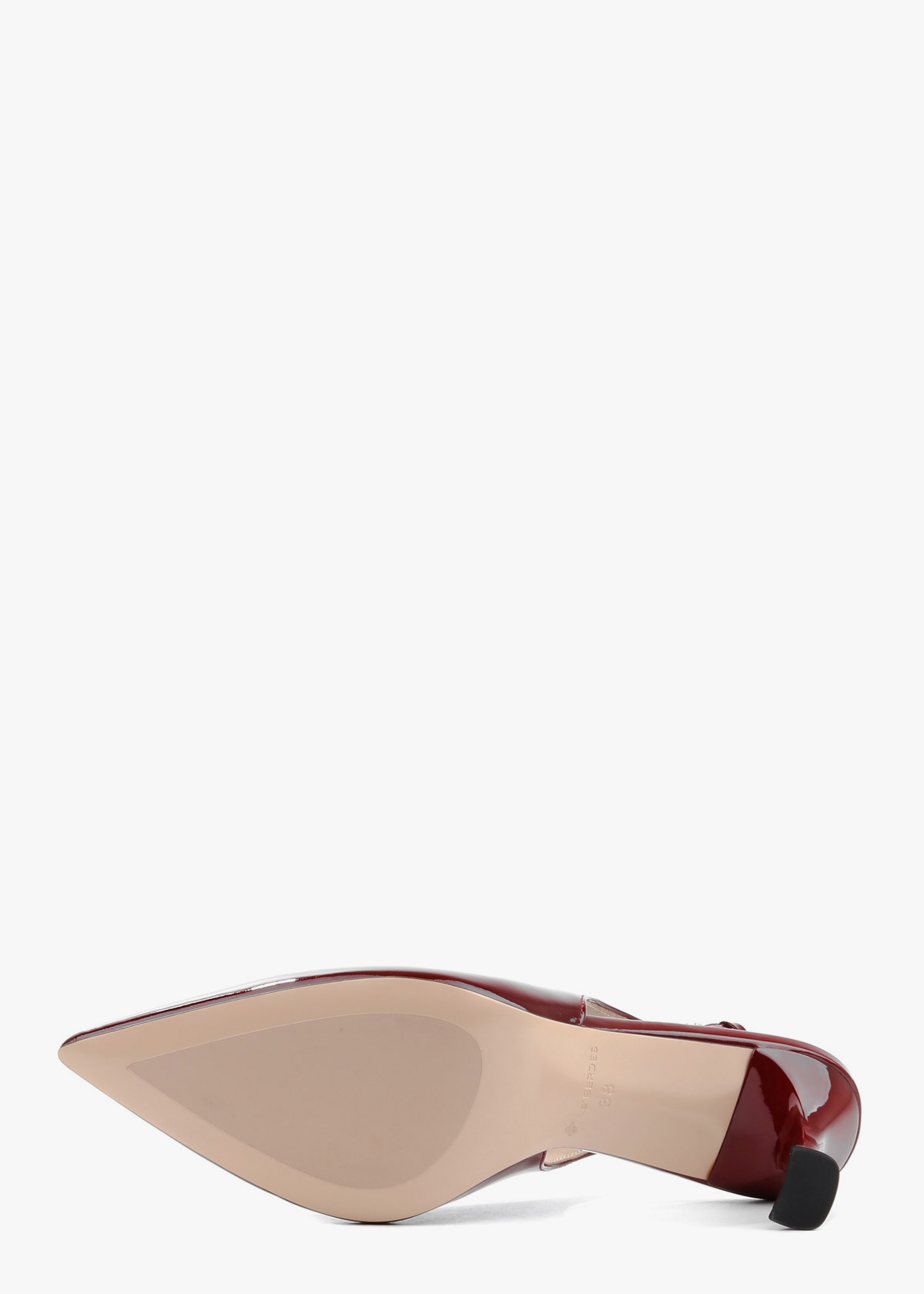 Вишукані жіночі сабо у глибокому винному відтінку, виготовлені з натуральної лакованої шкіри. Модель має елегантний загострений мис та тонкий ремінець із мініатюрною пряжкою, що забезпечує надійну фіксацію на щиколотці. Стійкий фігурний підбор середньої висоти додає парі сучасної естетики, роблячи ці туфлі ідеальним акцентом для вечірнього або ділового образу.